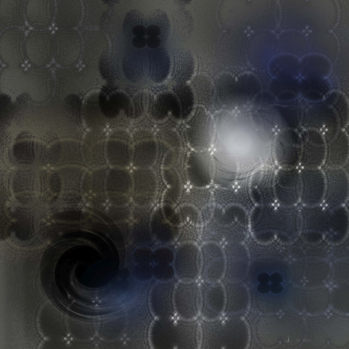 foto-grafika interferencyjna – technika własna, wydruk cyfrowy, papier wysokiej jakości Velvet 265 g (pół mat), 60 x 60 cm (kompozycja, dodatkowe marginesy: 2,5 cm), 1/20, sygn. p.d.: AM 07. 2023