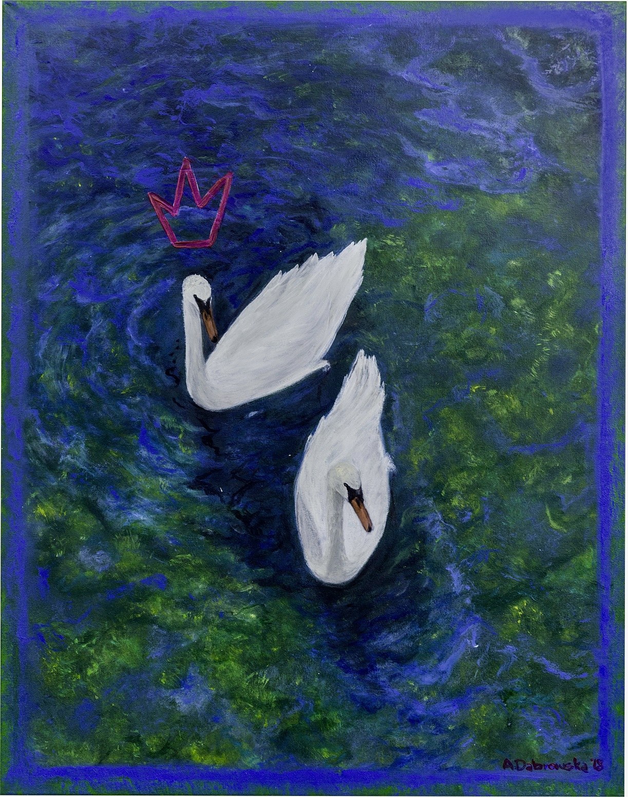 olej/płótno, 90 x 70 cm, sygnowany p. d: 'A.Dąbrowska18', sygnowany, datowany i opisany na odwrociu: 'Anita Dąbrowska | "Who is the king" | 90 x 70 2018'