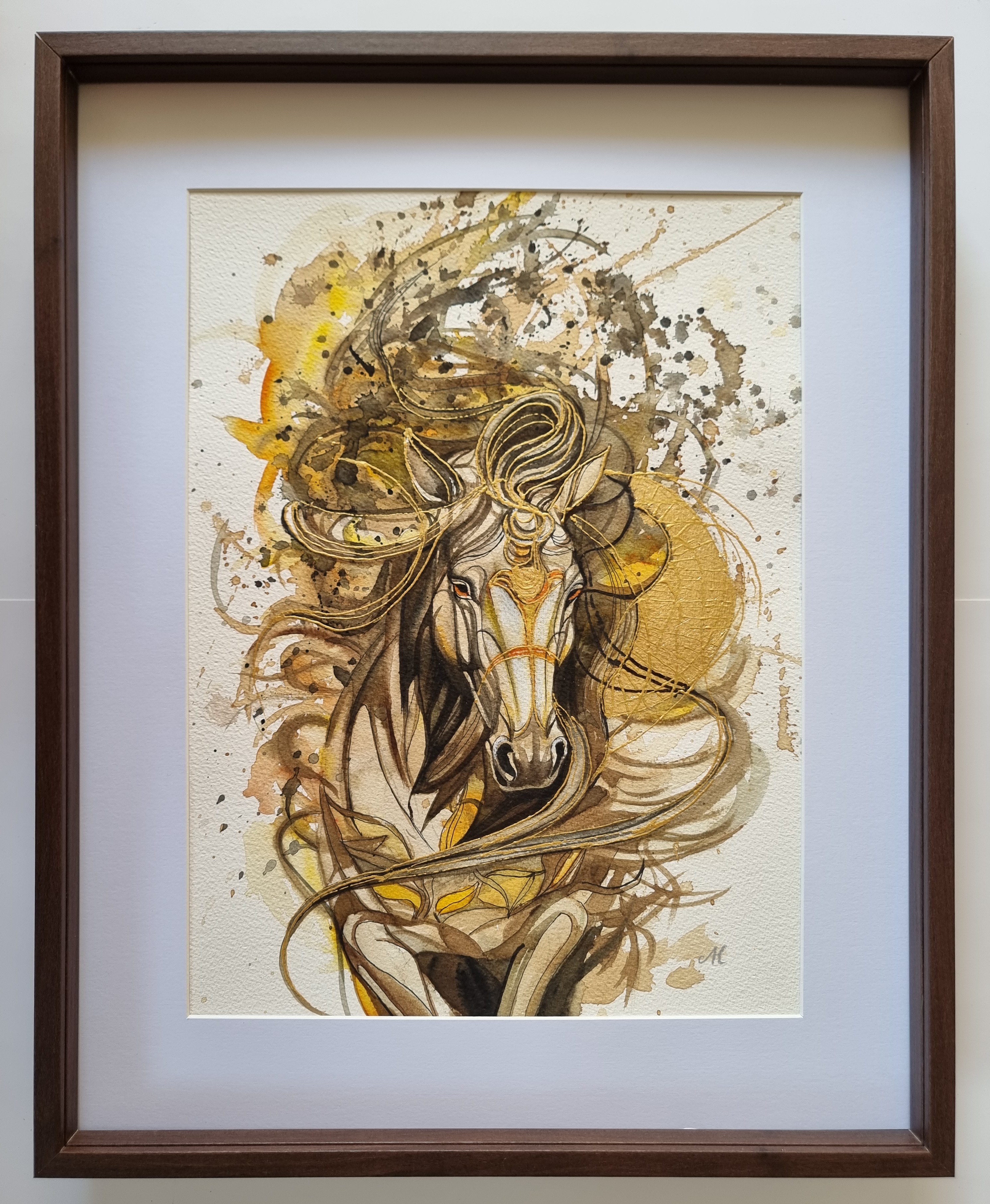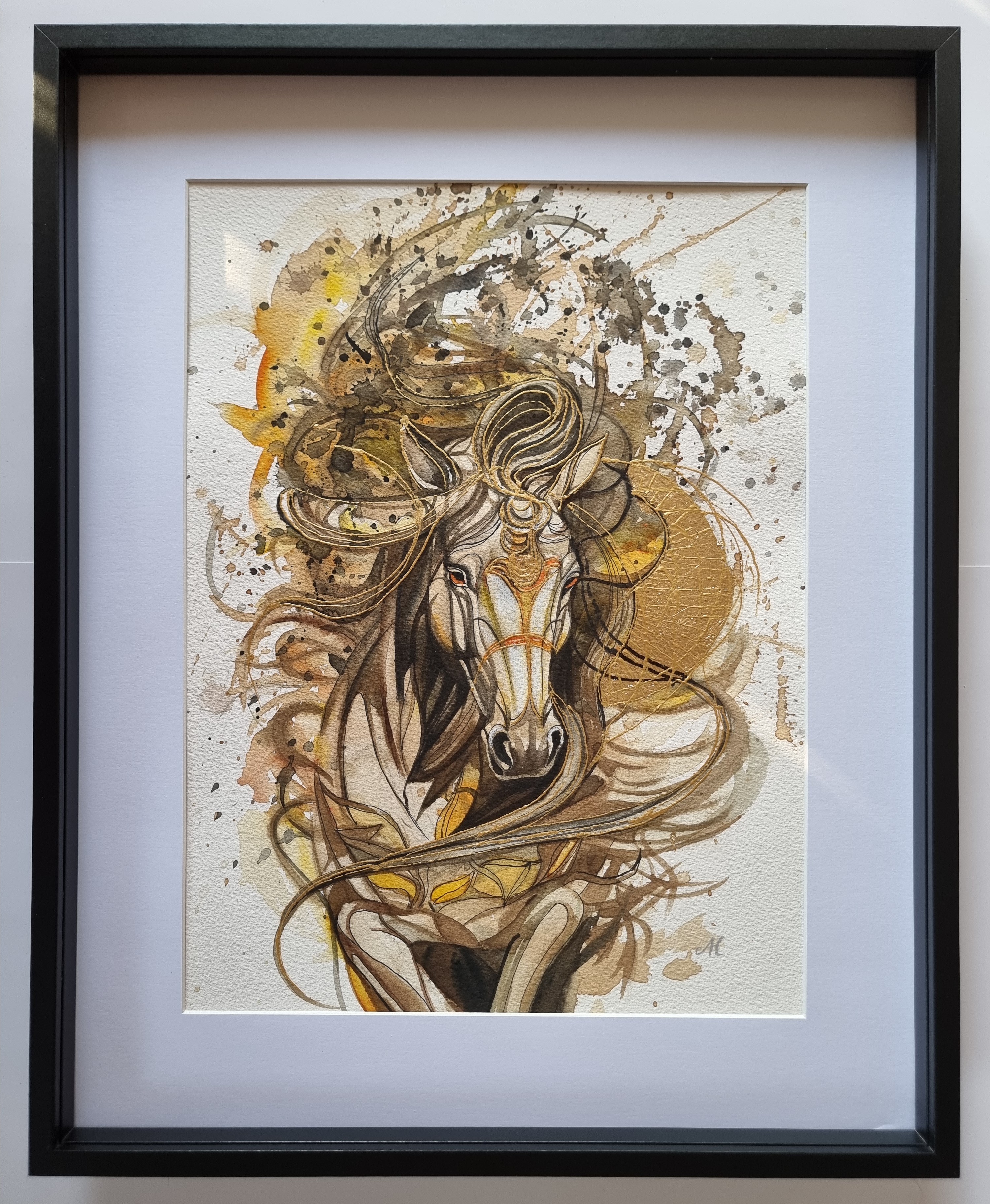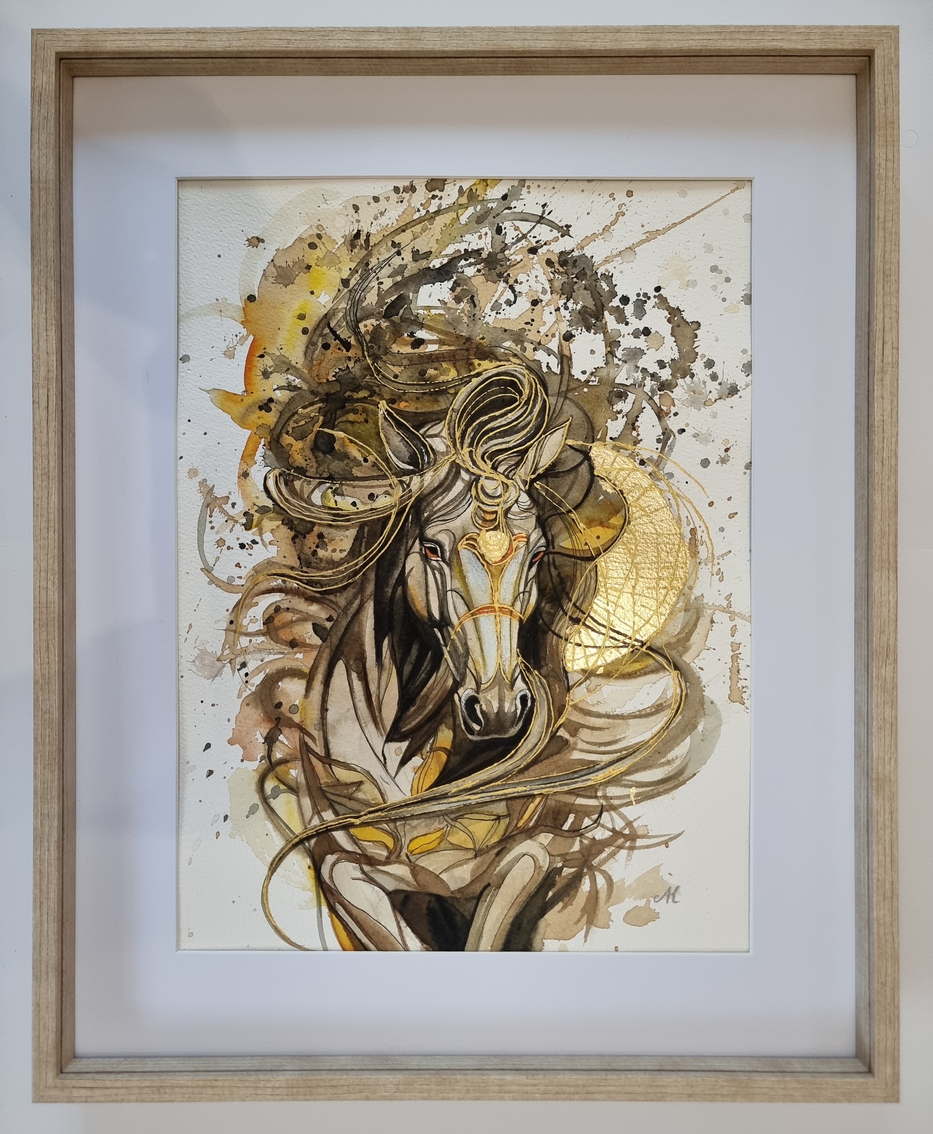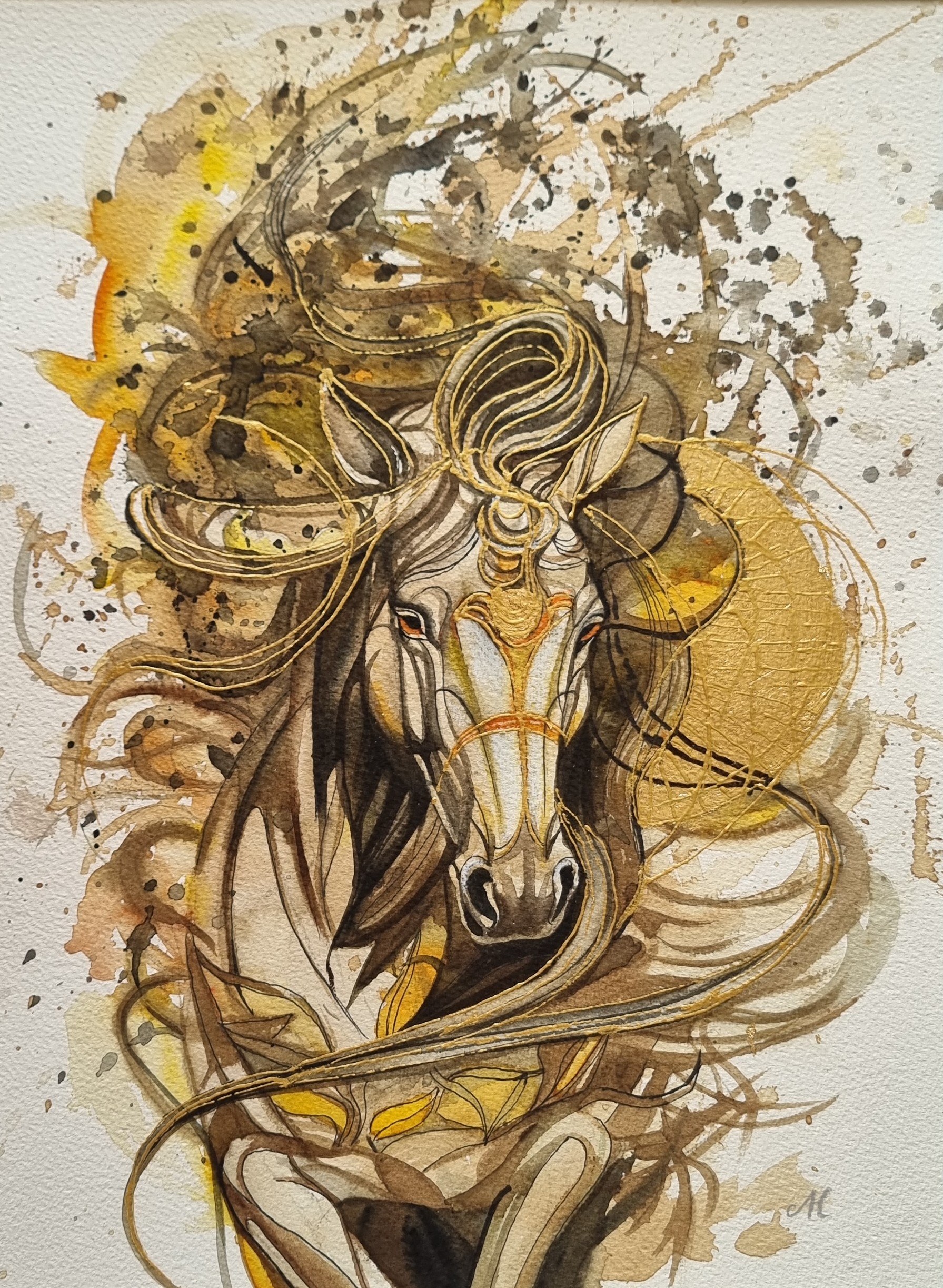 Technika: akwarela i szlagmetal na papierze ręcznie czerpanym Fabriano 400 mg