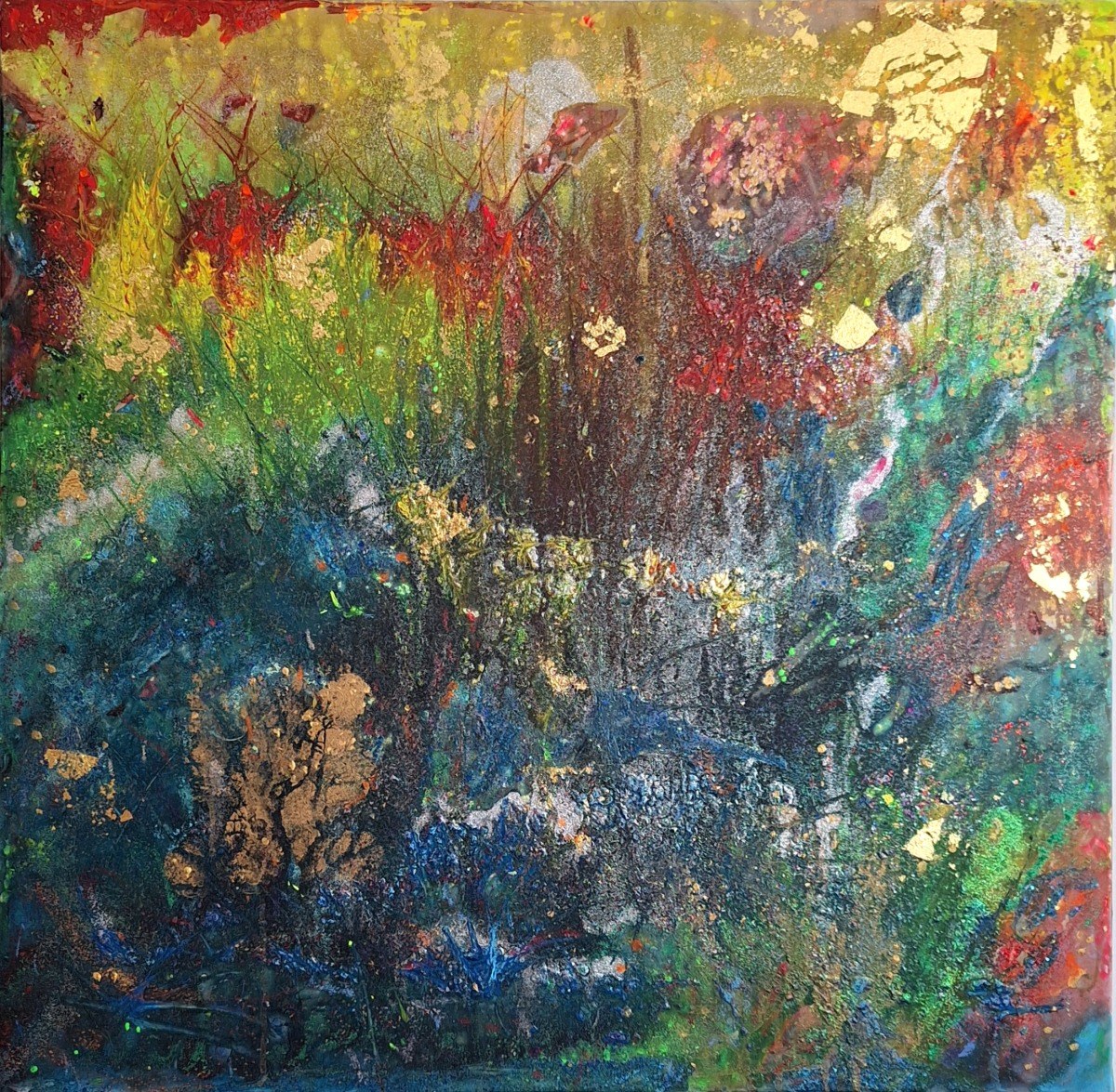 technika mieszana (akryl, brokat, płatki złota), płótno, 80 x 80 cm, sygn. na odwrocie