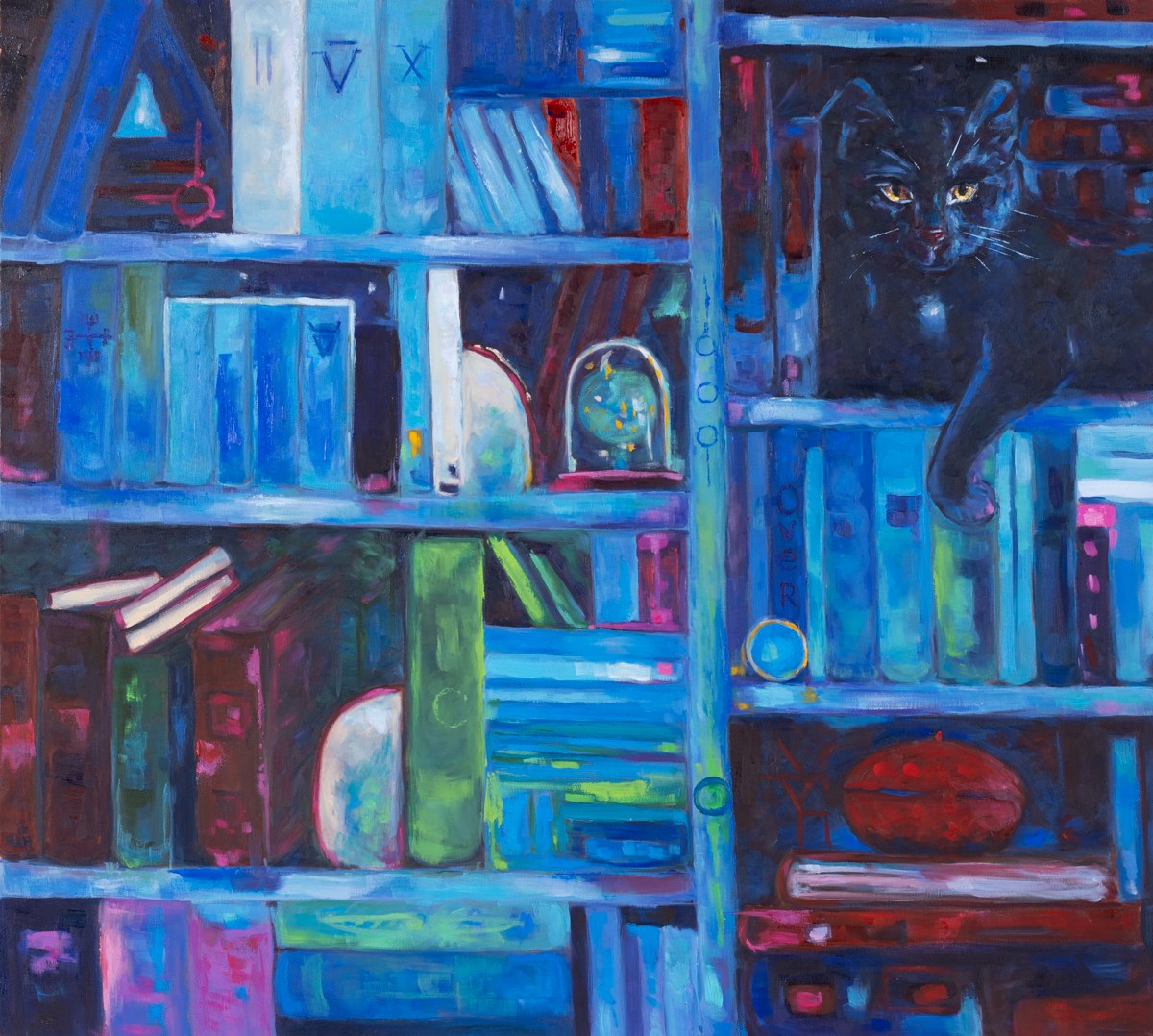 olej, płótno, 90x100 cm, opisany na odwrocie: Izabela Szarek Fellino 2024 "The Blue book store"