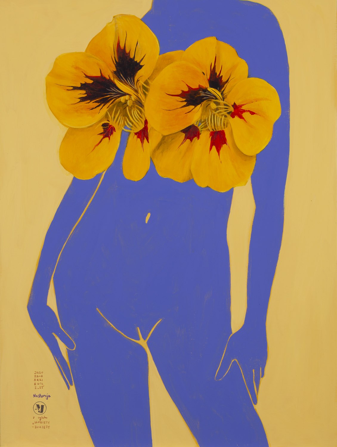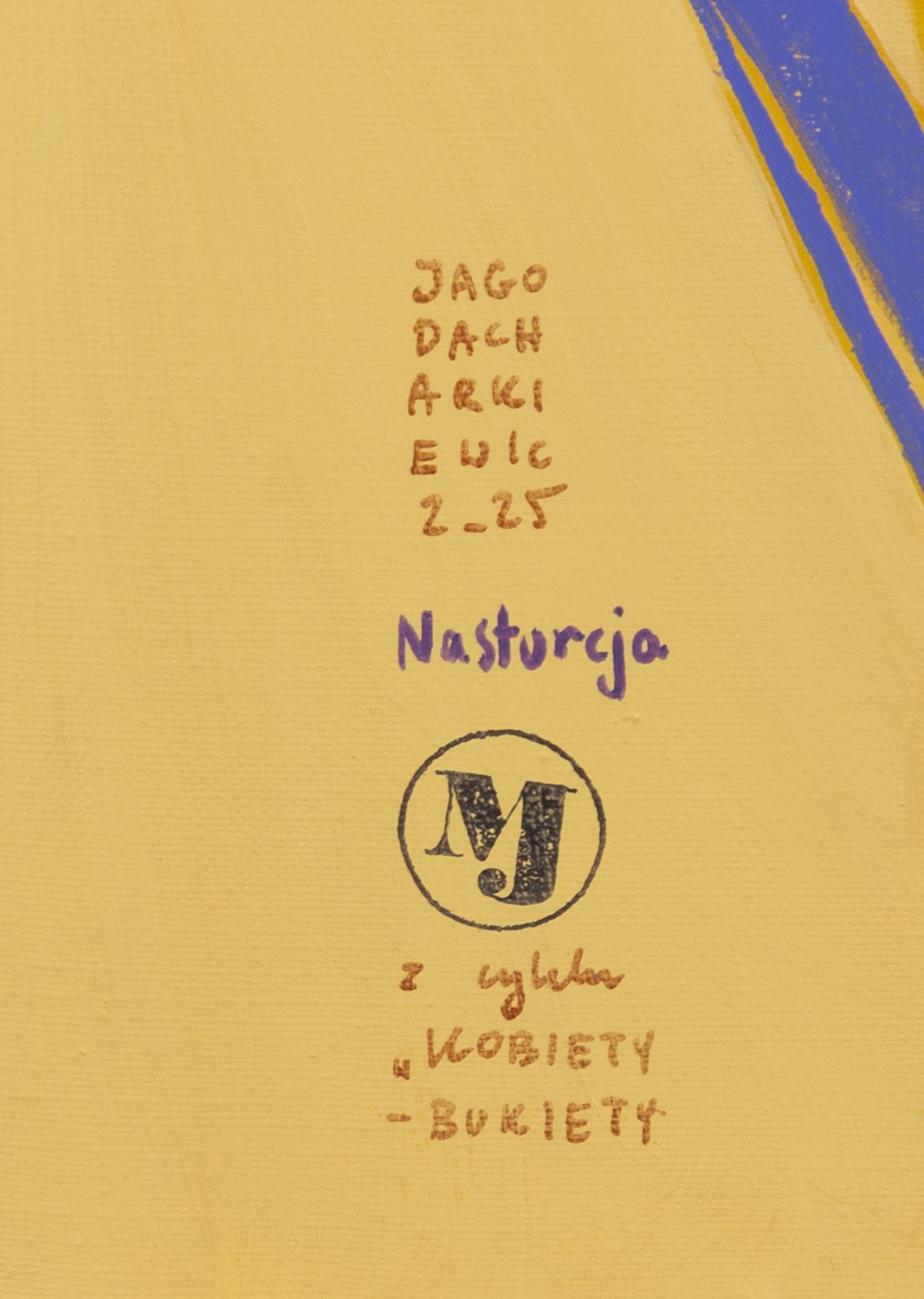 sygnowany, datowany i opisany l.d.: 'JAGO | DACH | ARKI | EWICZ | 2025 | Nasturcja | [monogram artystki] | z cyklu | "KOBIETY | -BUKIETY"'