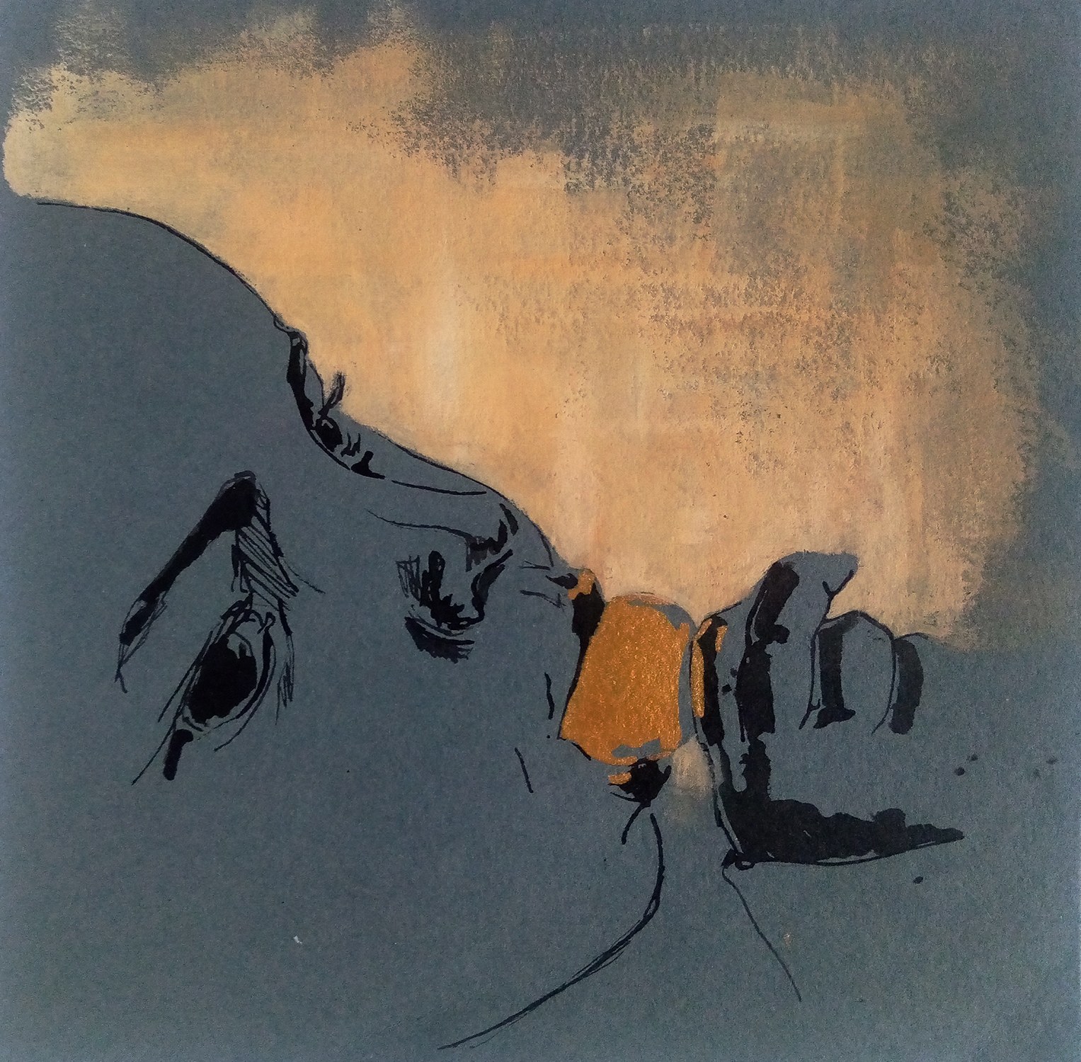 Joanna Kaźmierska, "Dziecko z lizakiem" 092027, 2020, technika mieszana (akryl, tusz, złoty tusz akrylowy), papier 300g, 21 x 21 cm, praca nieoprawiona, sygn. na odwrocie: Kaźmierska.