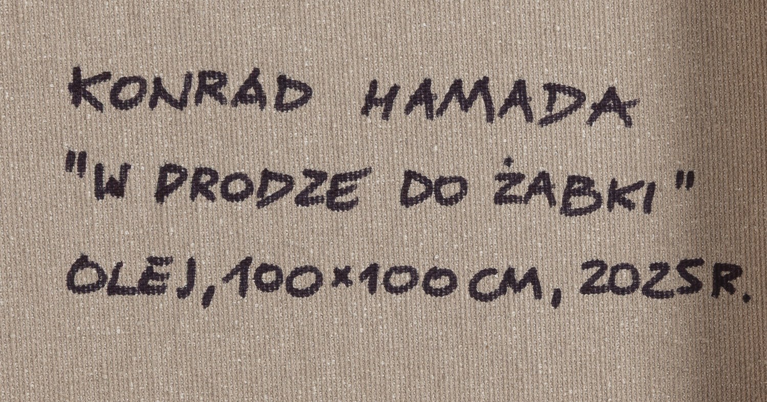 sygnowany, datowany i opisany na odwrociu: 'KONRAD HAMADA | "W DRODZE DO ŻABKI" | OLEJ, 100 x 100 CM, 2025 R.'