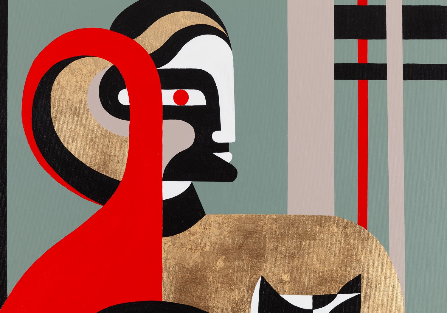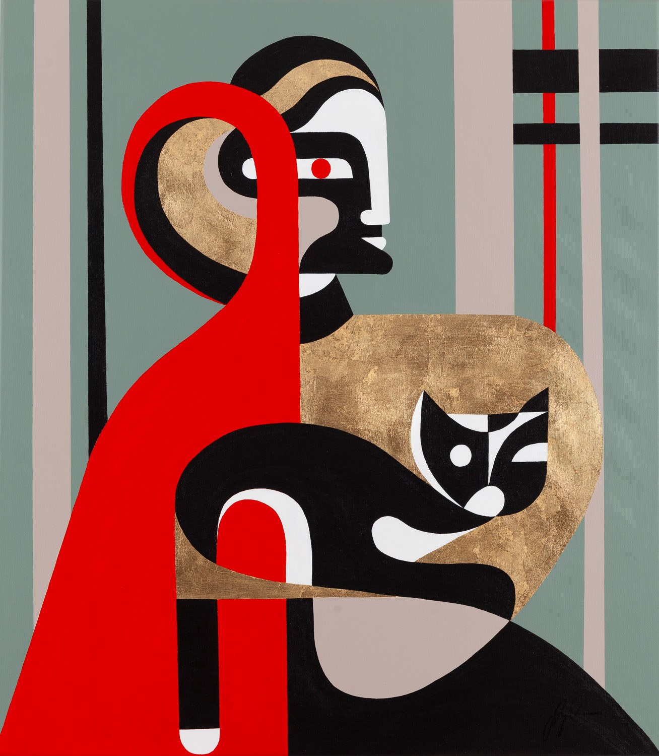 sygnowany, datowany i opisany na odwrociu: 'OSOBA LUDZKA Z | ISTOTĄ KOCIĄ, | 80x70 cm, POZNAŃ 12.01.2024 r. Łukasz Sysło'