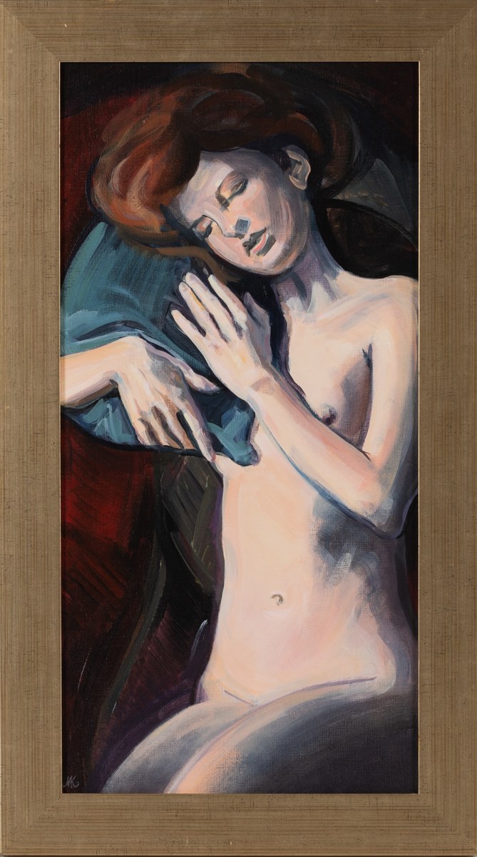 akryl, płótno, 60x30 cm, 69x39 cm w oprawie, sygn. l.d.: MK, opisany na odwrocie: "Tola" M. Kempiński MMXXII