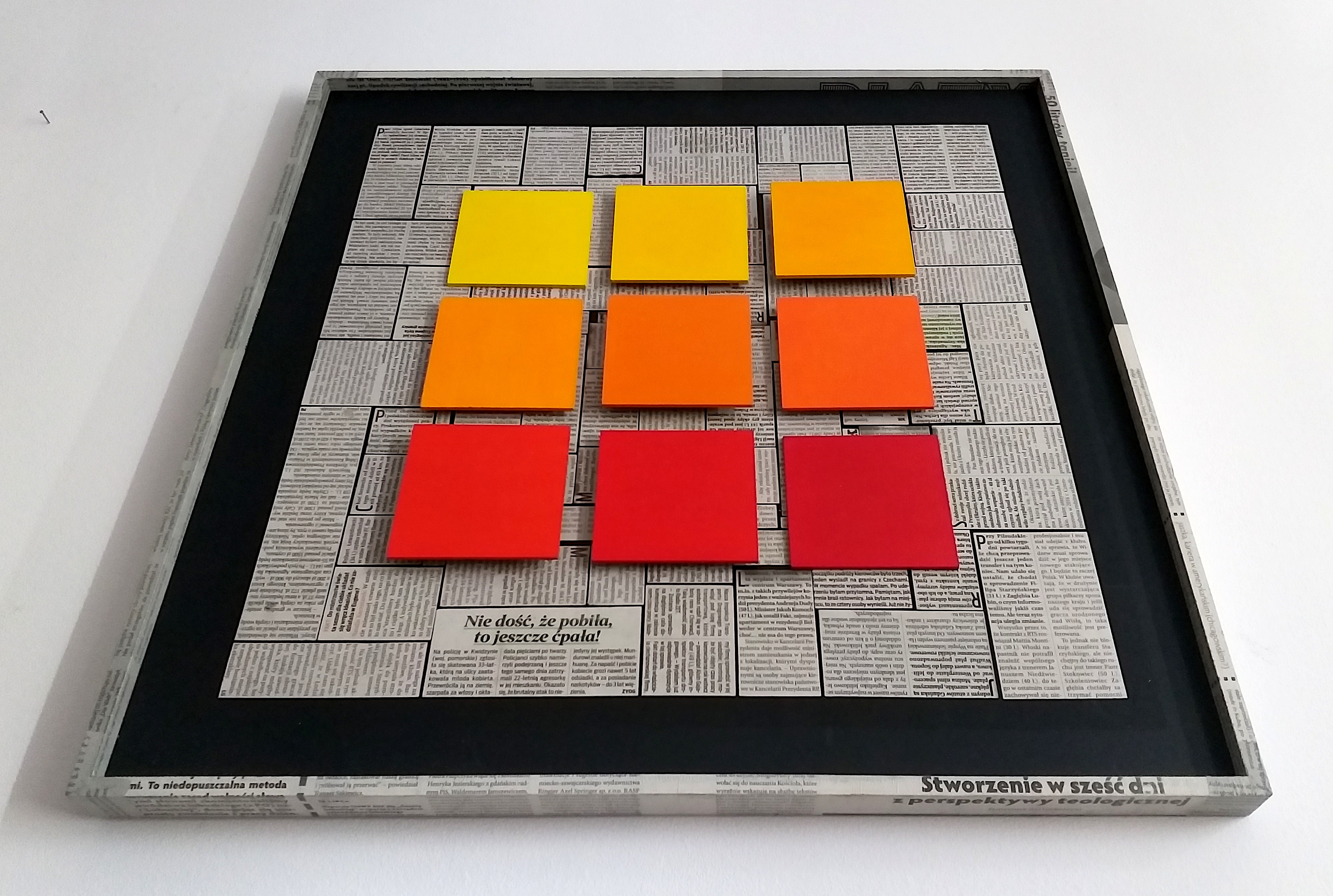 płyta pilśniowa, akryl, drewno, papier - gazeta,