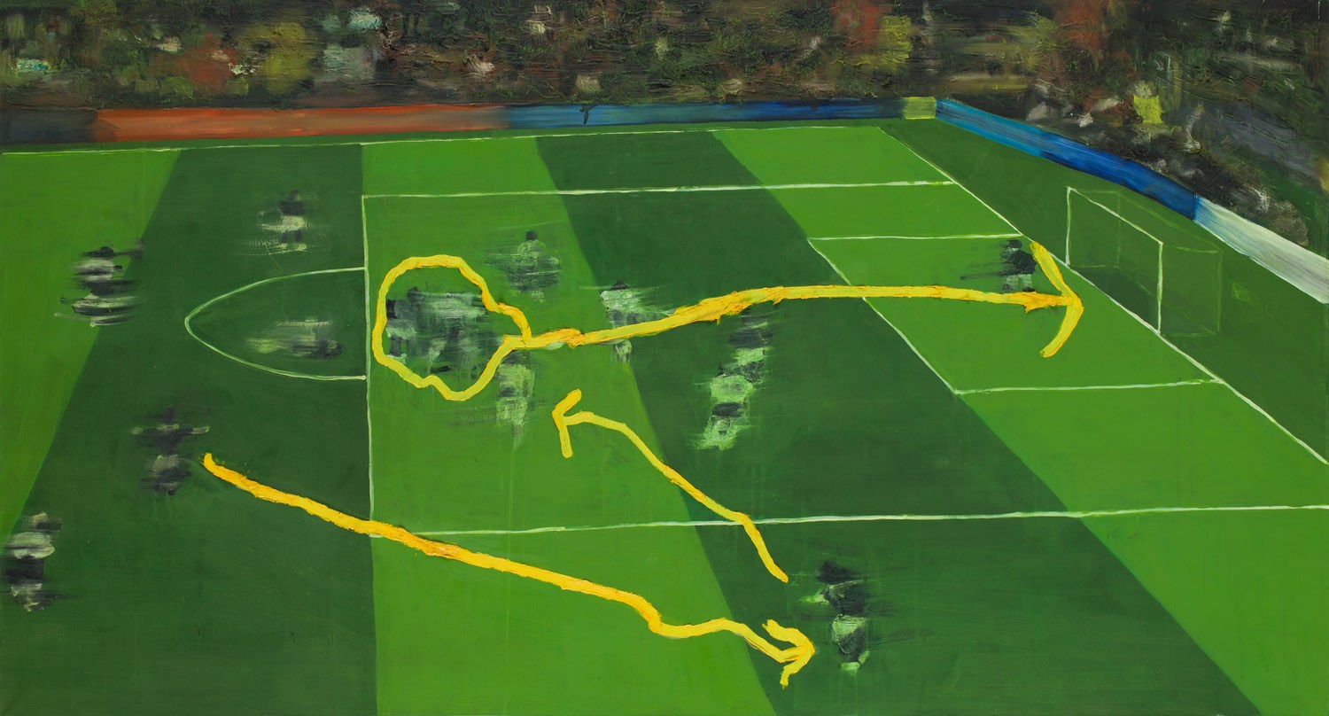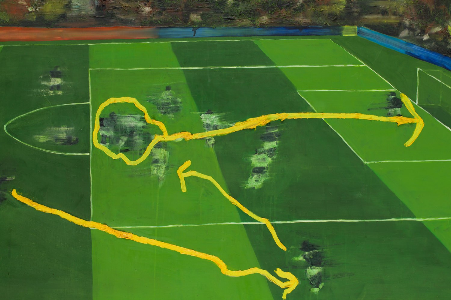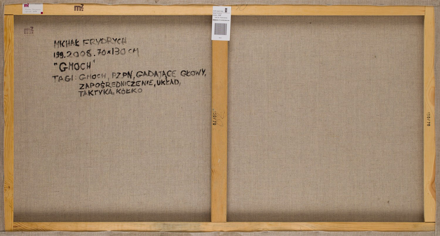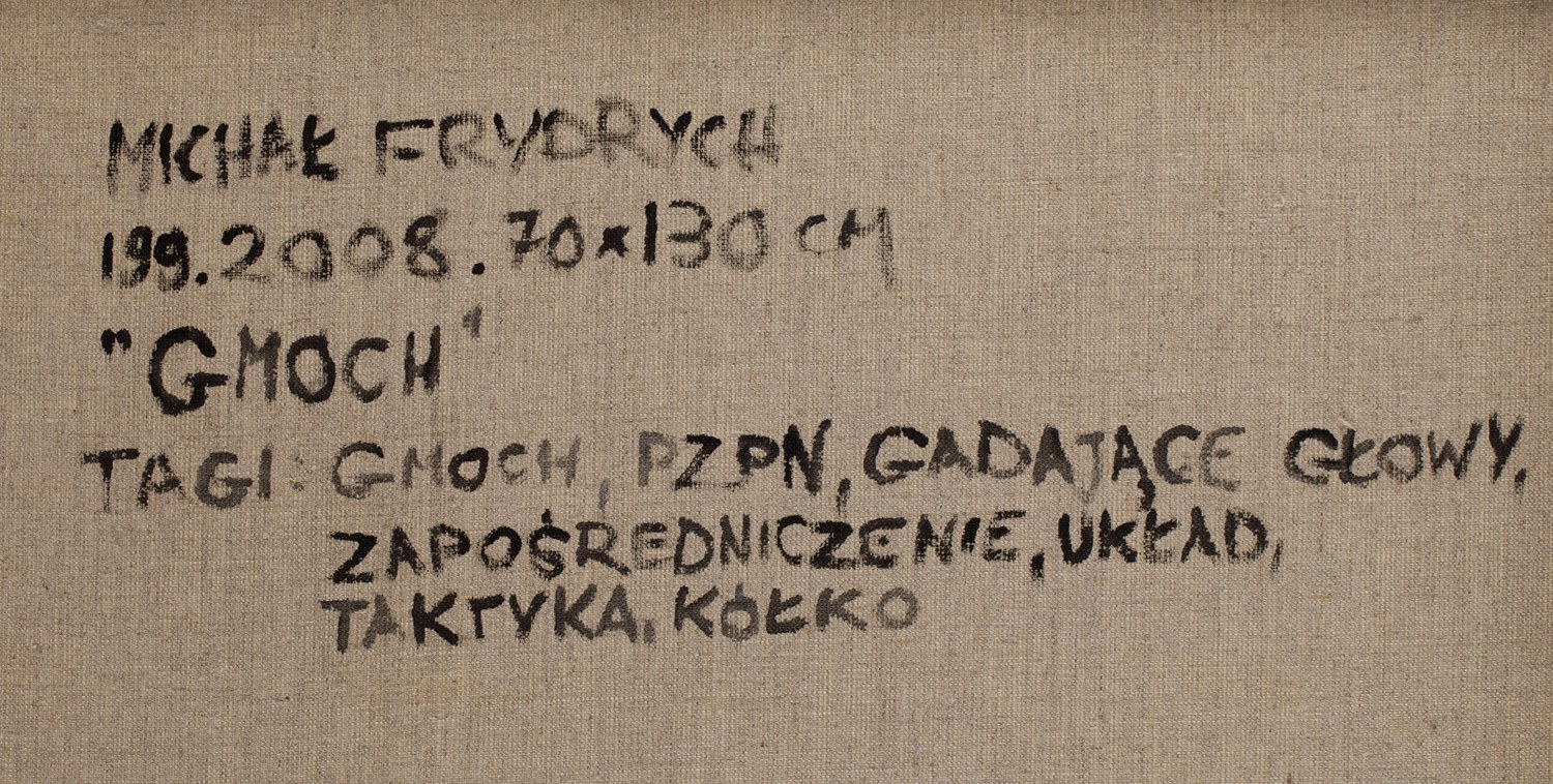 sygnowany, datowany i opisany na odwrociu: 'MICHAŁ FRYDRYCH | 199.2008.70x130 cm | "GMOCH" | TAGI: GMOCH, PZPN, GADAJĄCE GŁOWY, | ZAPOŚREDNICZENIE, UKŁAD, | TAKTYKA, KÓŁKO'