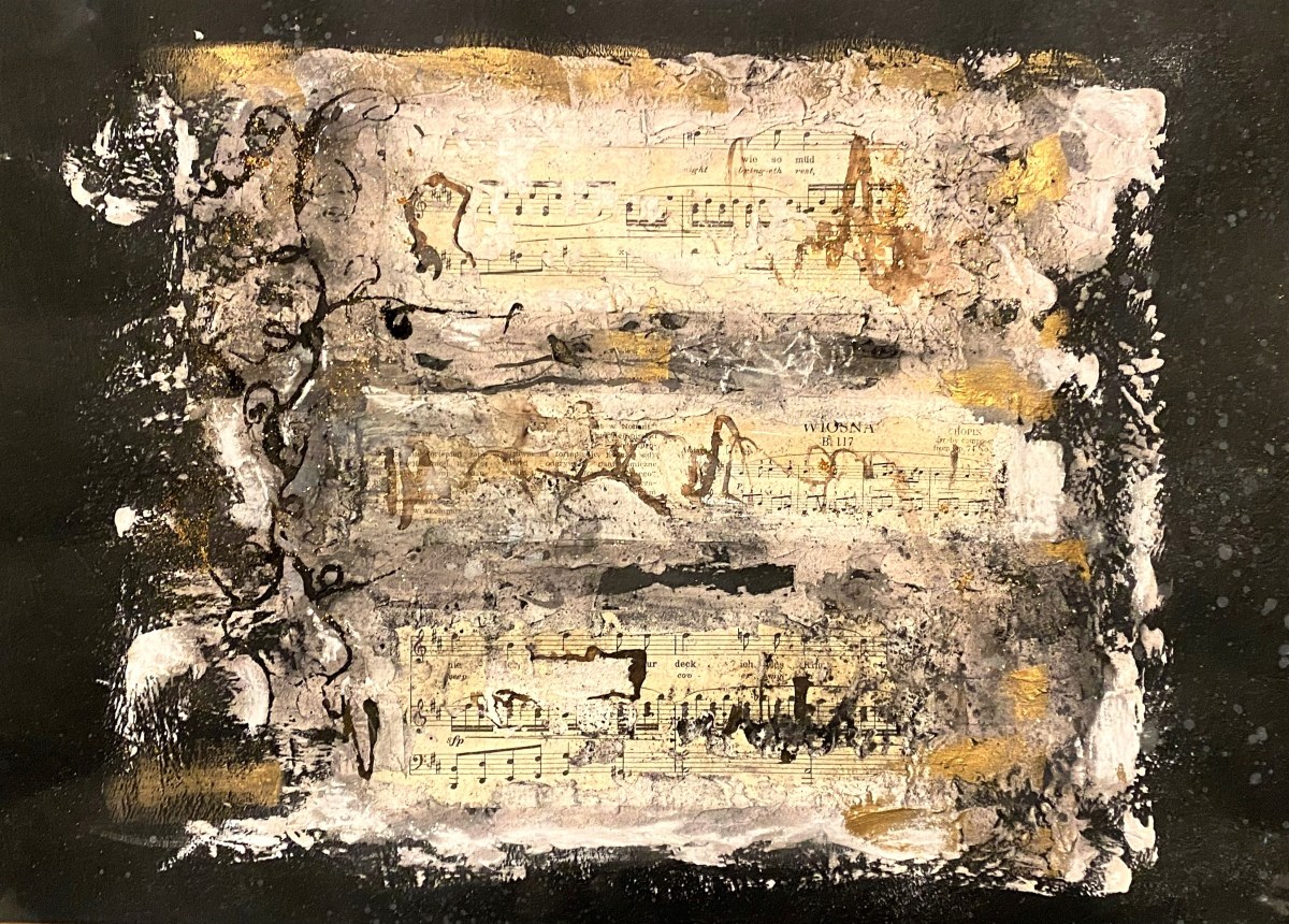 technika mieszana (kolaż, farby akrylowe, tusz, grafit, masa szpachlowa), papier, 30 x 40 cm, sygn. na odwrocie