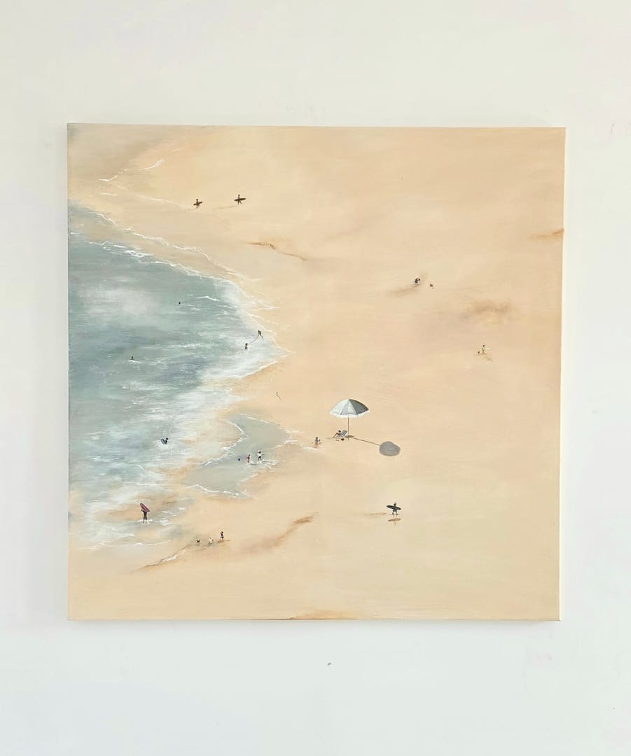 Obraz przedstawia ludzi na plazy z lotu ptaka.