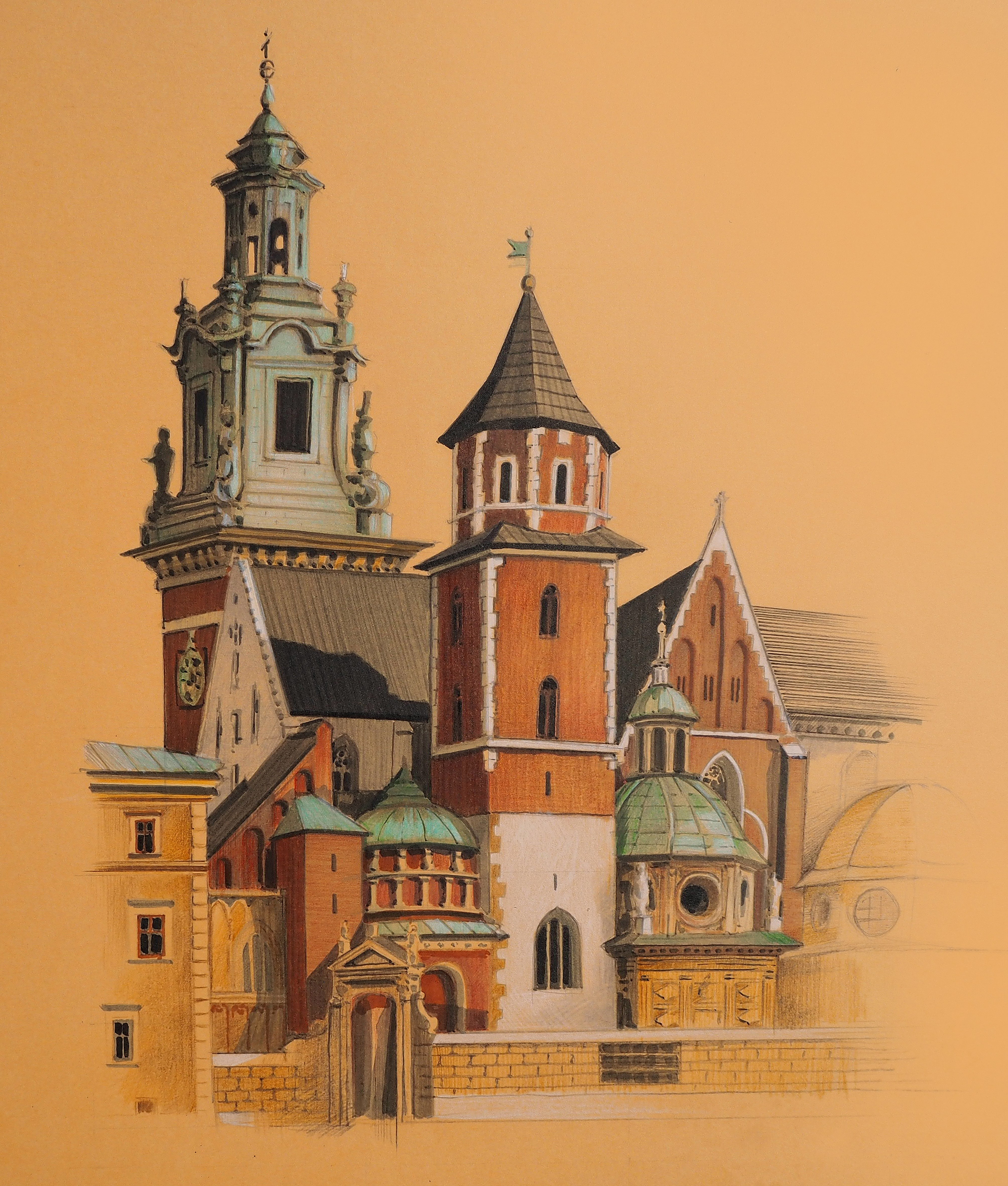 Paweł Grabowski, "Katedra na Wawelu" papier technika mieszana 34x40cm