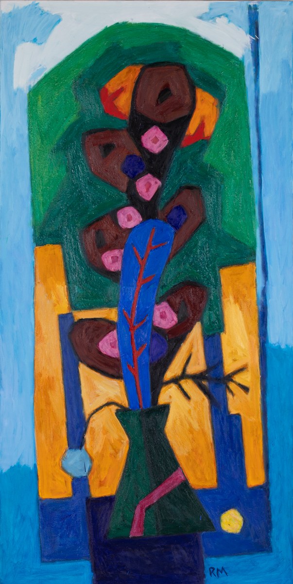 olej, płótno, 200х100 cm, sygn. p.d.: RM, opisany na odwrocie: Roman Maisei, Wazon z kwiatami w oknie, Vase with flowers in the window 2023-24, olej na płótnie, 200x100 cm