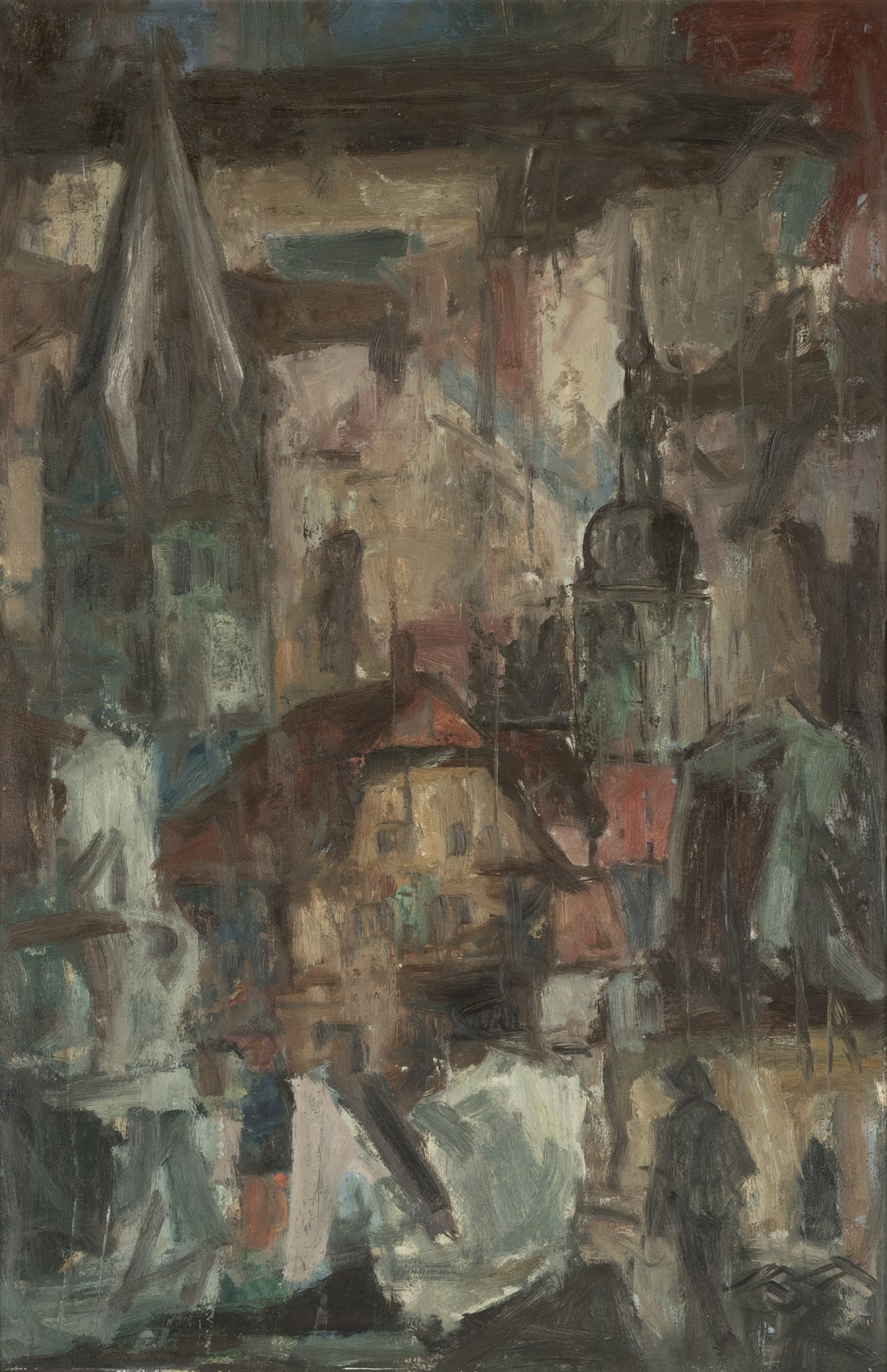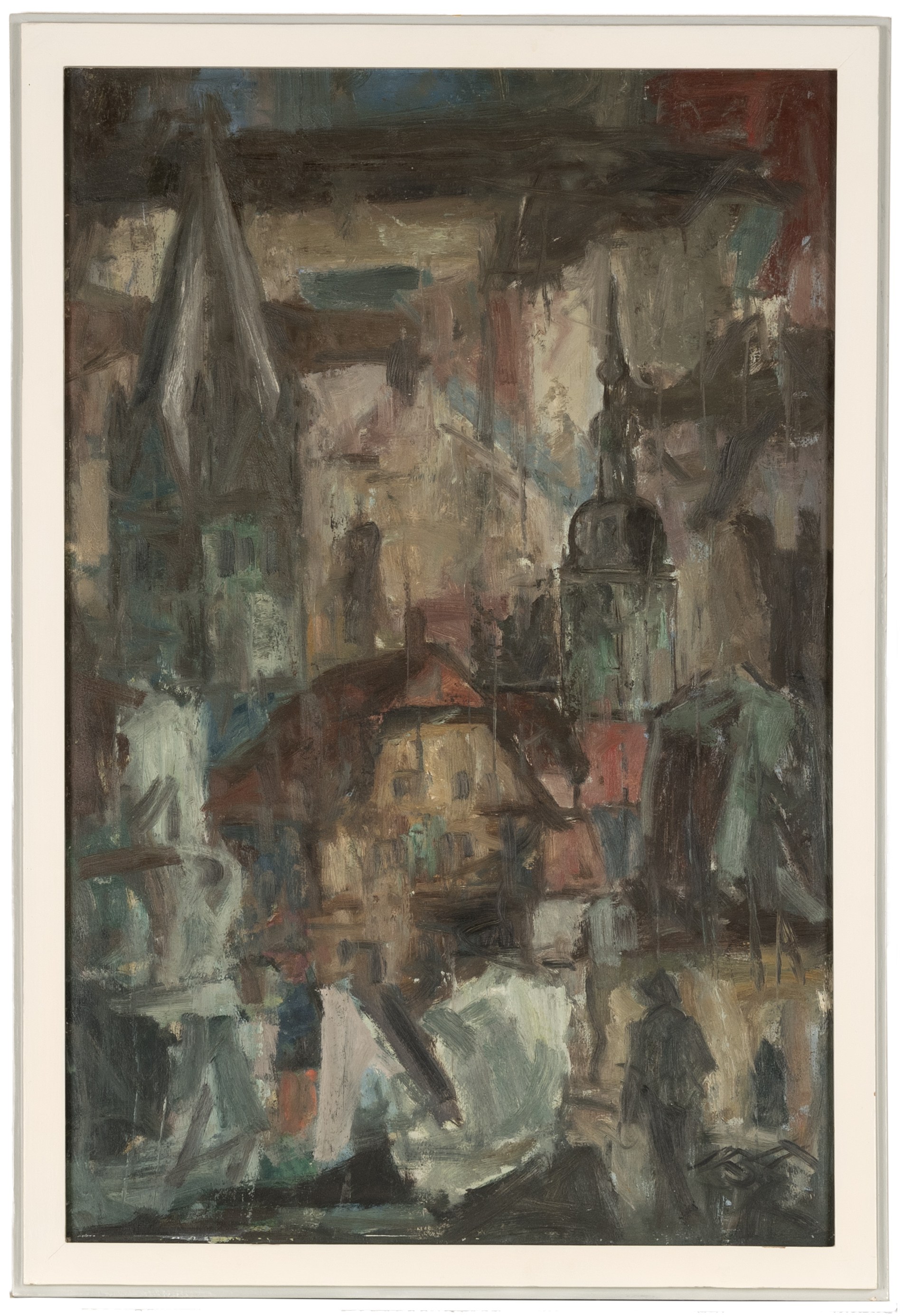Stadtansicht von Soest, Öl auf Hartfaserplatte, 63 cm x 42 cm Werkmaß, verso signiert, gewidmet
