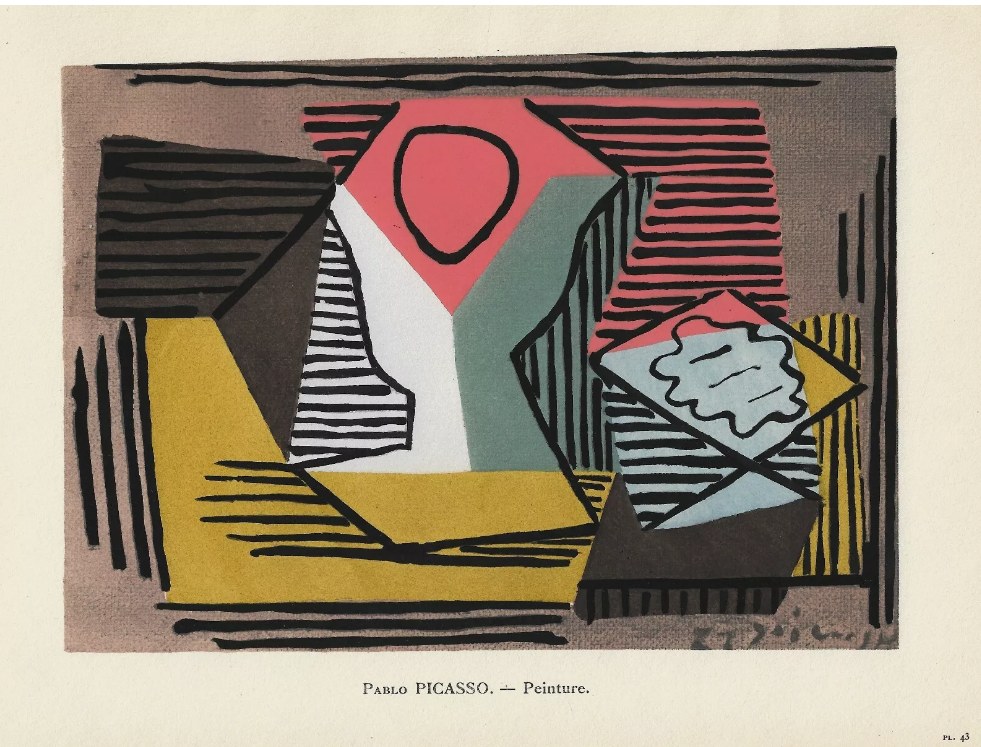 pochoir ręcznie kolorowany gwaszem/papier, 15 x 21 cm, plansza pochodzi z publikacji Guillaume'a Janneau "L'Art. Cubiste. Th ė alistationes. Ėtude Critique" wydanej przez Charles'a Moreau w Paryżu w 1929 r., sygnowana na płycie p. d.