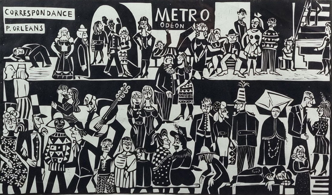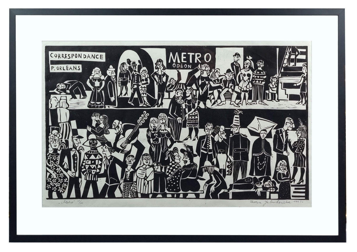 Linoryt na papierze, opisany, numerowany, sygnowany i datowany “Metro 12/50 Teresa Jakubowska 1964 r.”