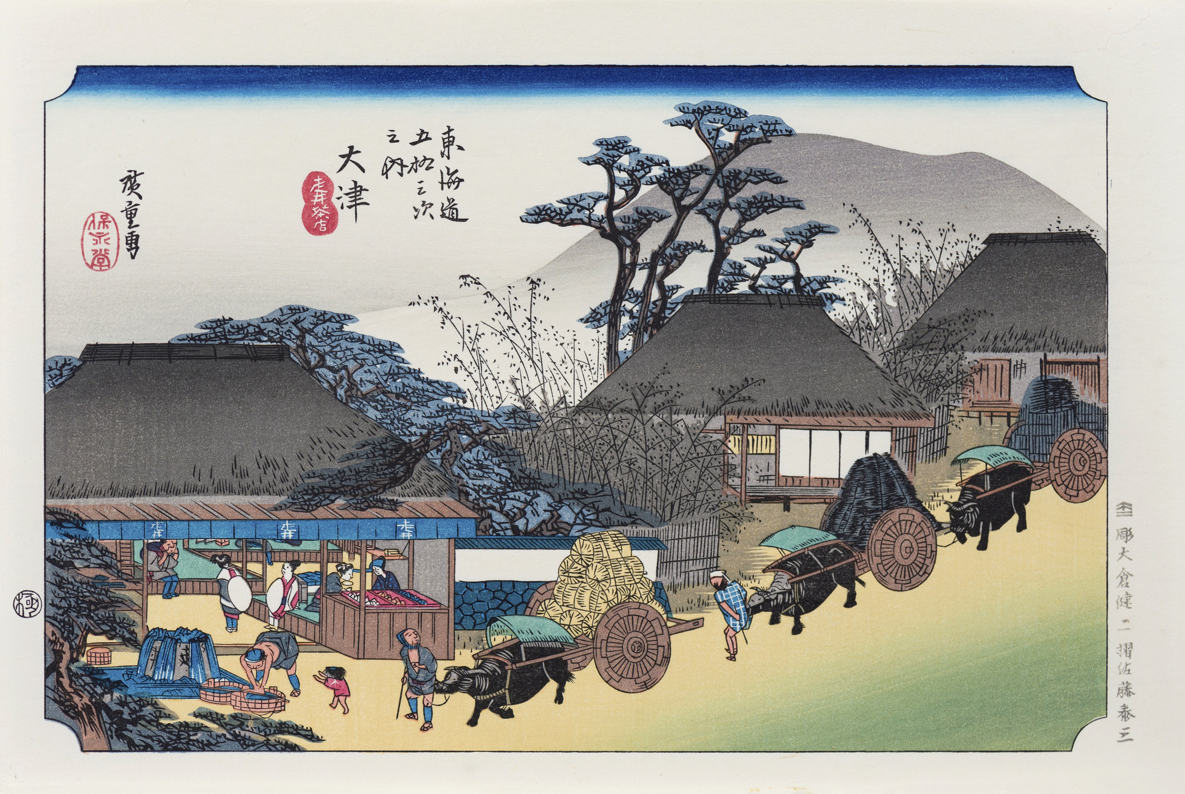 Otsu było największym miastem na Tokaido i ważnym ośrodkiem transportowym, ponieważ towary znad Morza Japońskiego przewożono łodziami przez jezioro Biwa, lądując tu przed dalszą drogą do Kioto. Otsu przyciągało wielu podróżnych i handlarzy towarami, co czyniło je popularnym miejscem odpoczynku. W lewym dolnym rogu widać słynną studnię Hashiri-i, co oznacza „woda płynąca”. Wysokiej jakości woda z tej studni była bardzo ceniona, a ciastka ryżowe robione z jej użyciem stały się znane jako Hashirii-mochi. Za studnią znajduje się herbaciarnia o nazwie Hashirii-jyaya. Na pierwszym planie Hiroshige przedstawił trzy załadowane, ciężkie wozy ciągnięte przez woły. Zielone daszki nad zwierzętami to specjalne osłony przeciwsłoneczne.