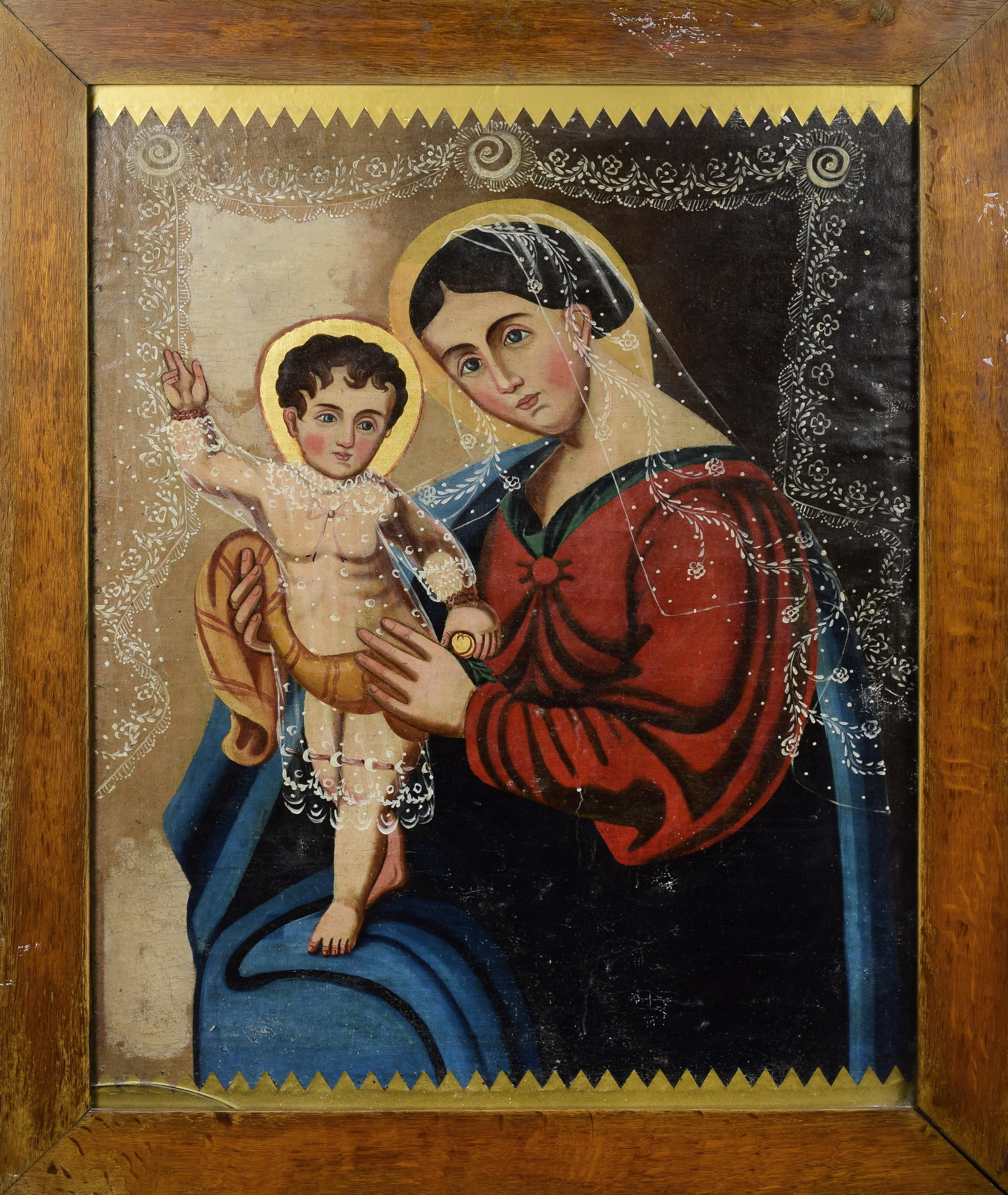 olej, złota farba, krawędź górna i dolna z naklejonym złoty papierem, płótno (?), deska;