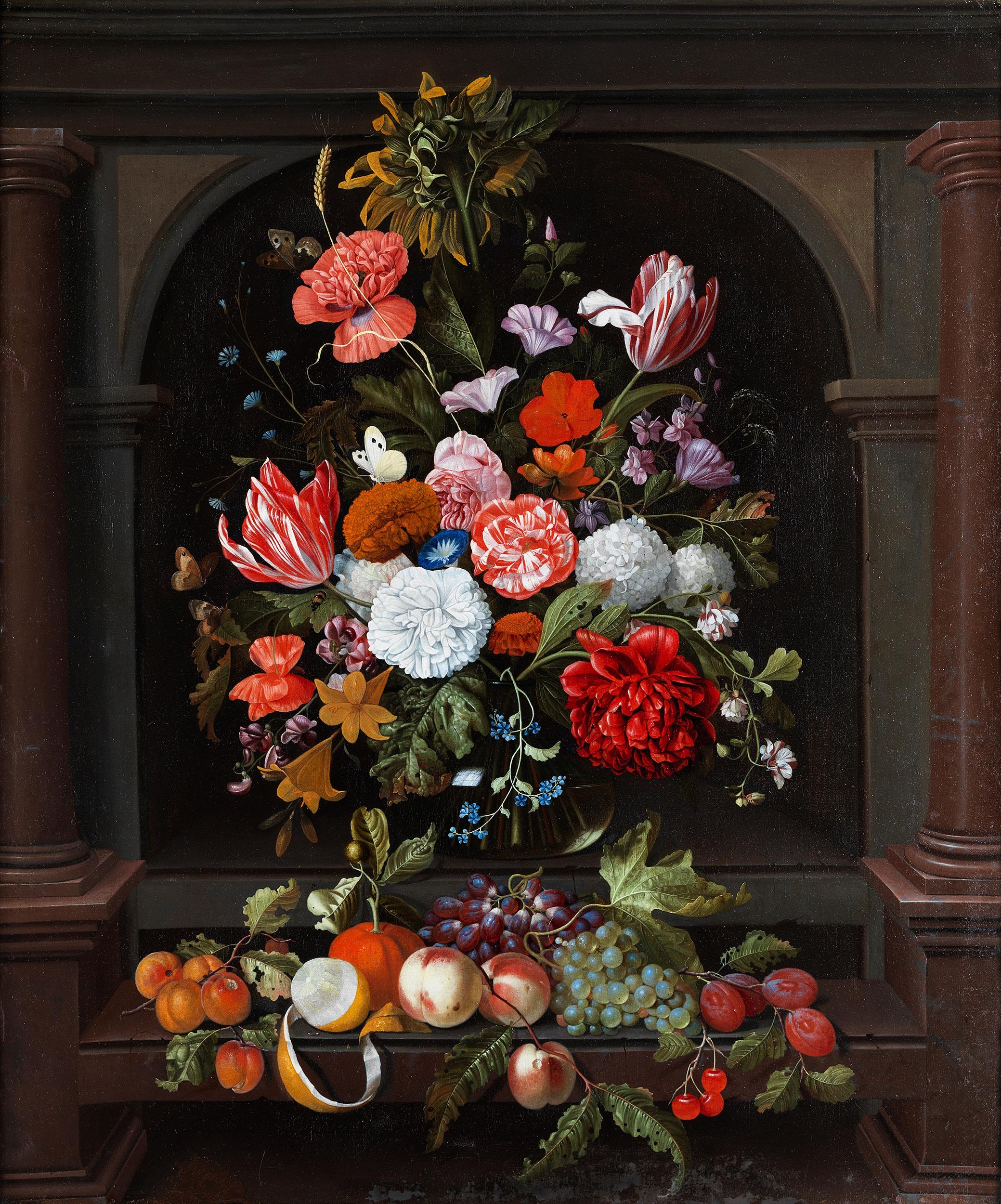 Innerhalb einer barocken Steinnische mit vorgesetzten Rundsäulen und Rundbogenaufsatz auf Plinthe eine stark gebauchte Glasvase mit sich in der Wandung spiegelnden Atelierfenster. Darin ein reichhaltiges Blumenbouquet mit Tulpen, Schneeball, Vergissmeinnicht, Sonnenblume, Mohn- und weiteren Blumen mit davorliegenden Früchten: eine geschälte Zitrone, Pfirsiche, Weintrauben und Pflaumen. Komplettiert wird das Ensemble durch einen auf dem Mohn sitzenden Schmetterling, welcher sich wirkungsvoll vor dem Dunkel des Hintergrundes abzeichnet. (1411074) (1) (13)