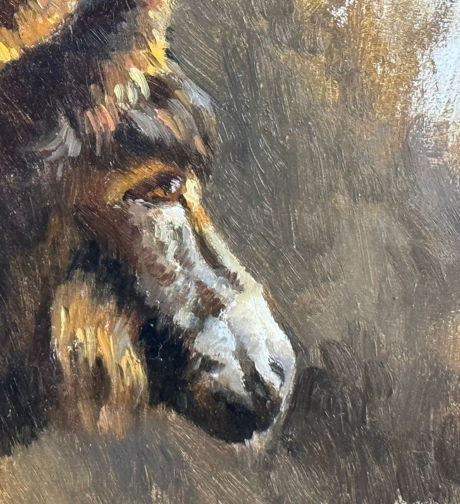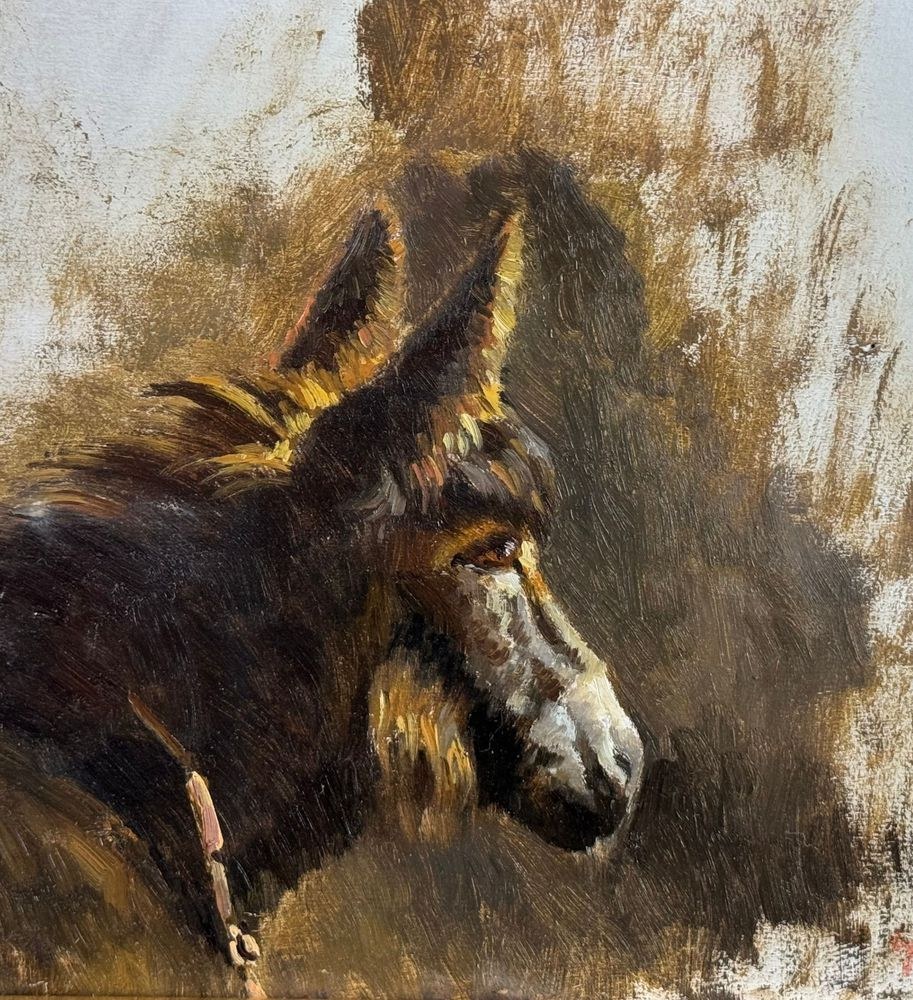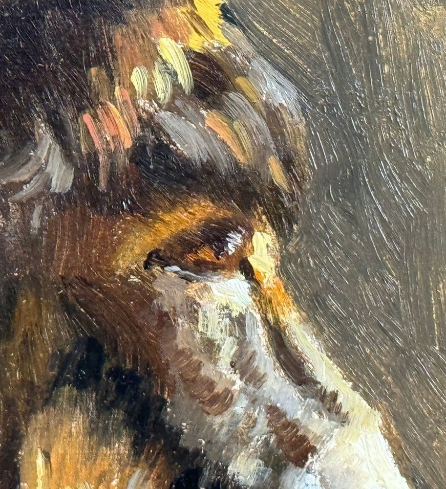Oil painting on panel, 20th-century Italian school, depicting a horse. Dimensions including frame: 50x45 cm. Inner frame dimensions: 26x22 cm. Signed at the bottom right by an unidentified artist. The artwork is in excellent condition and of outstanding artistic quality.