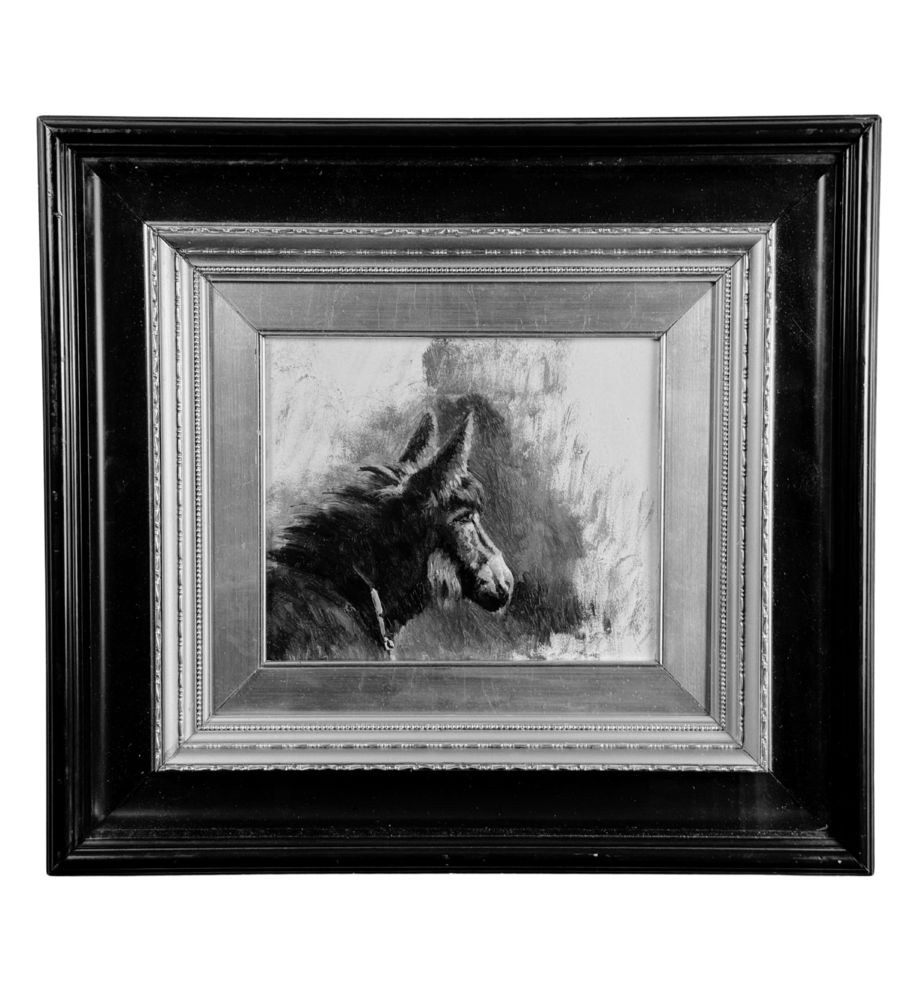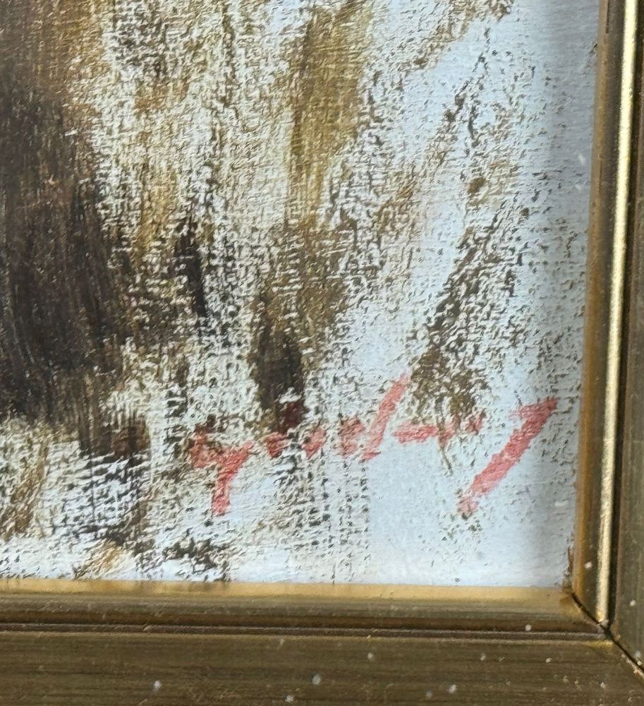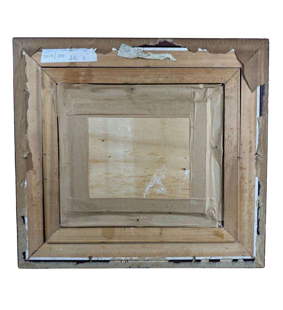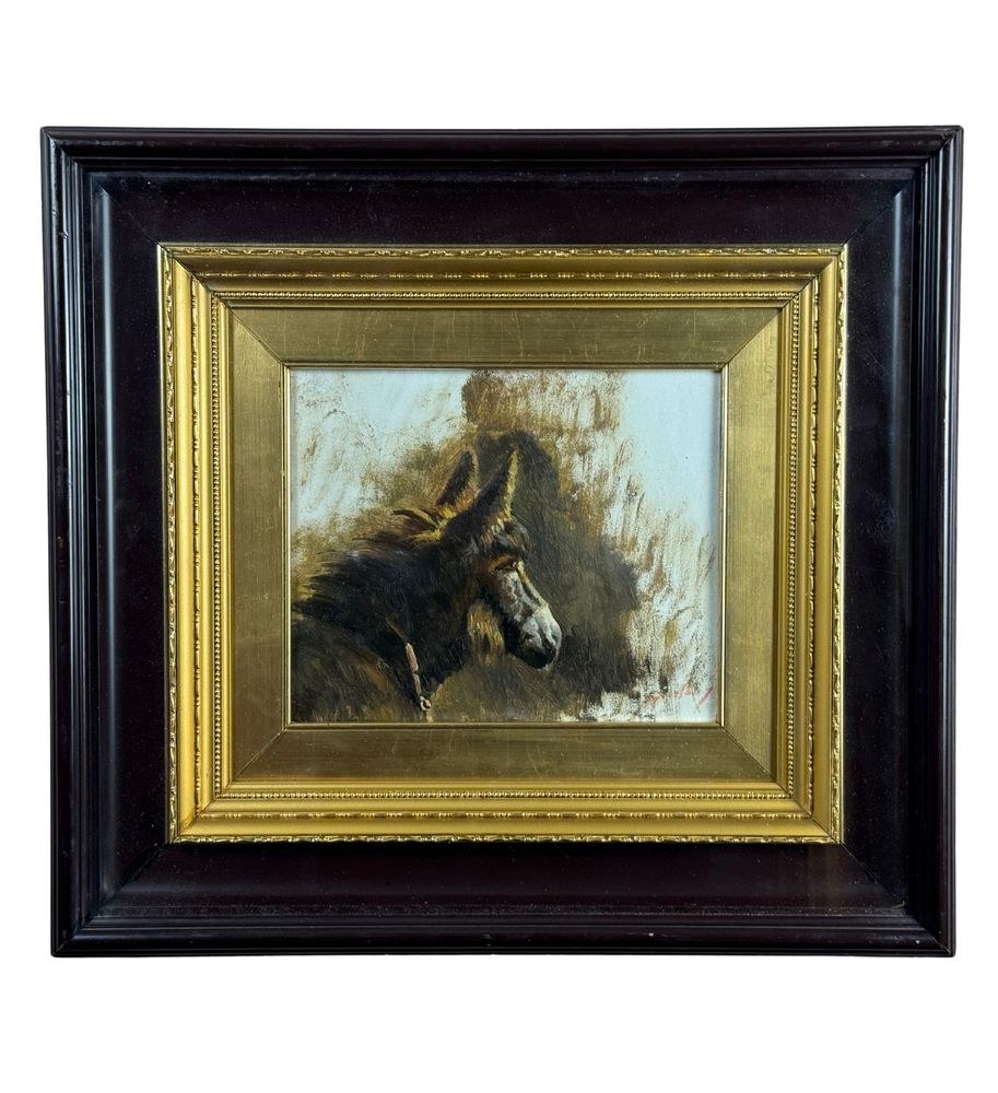 Oil painting on panel, 20th-century Italian school, depicting a horse. Dimensions including frame: 50x45 cm. Inner frame dimensions: 26x22 cm. Signed at the bottom right by an unidentified artist. The artwork is in excellent condition and of outstanding artistic quality.