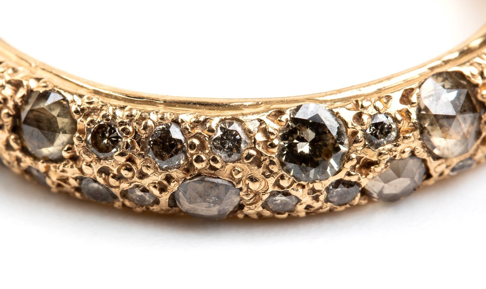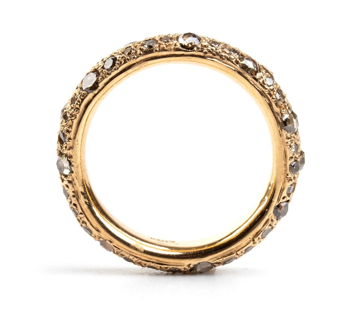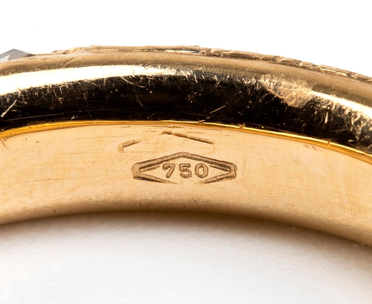 18k white and yellow gold, as an openwork band with plant motifs, set with cabochon cut ruby highlighted by diamond. N. 18 round shape brilliant cut diamonds approx. 1.05 ct, F-G, VVS-VS. N. 01 oval shape cabochon cut ruby approx. 1.10 ct.