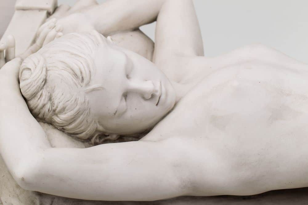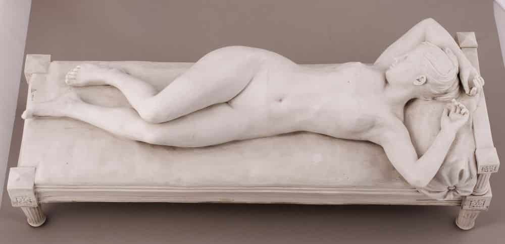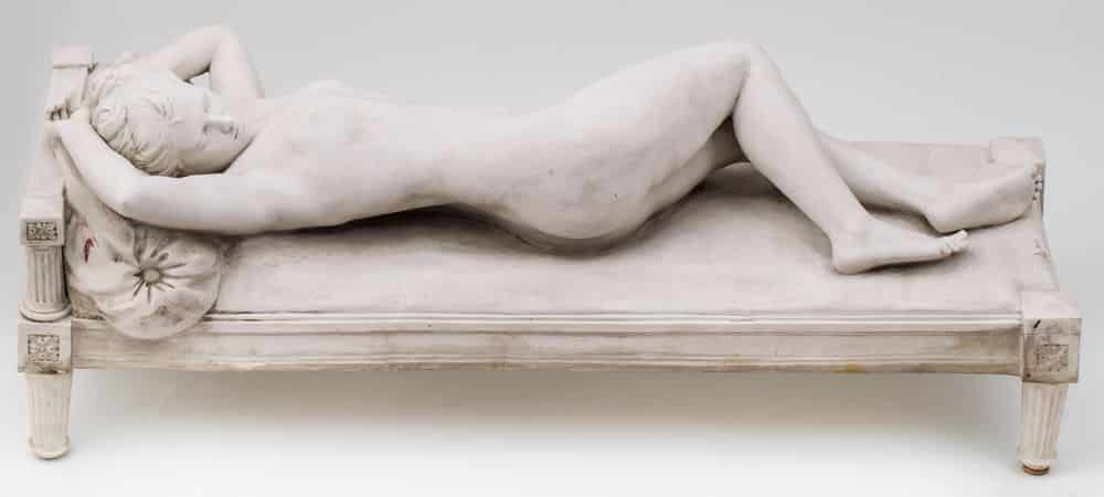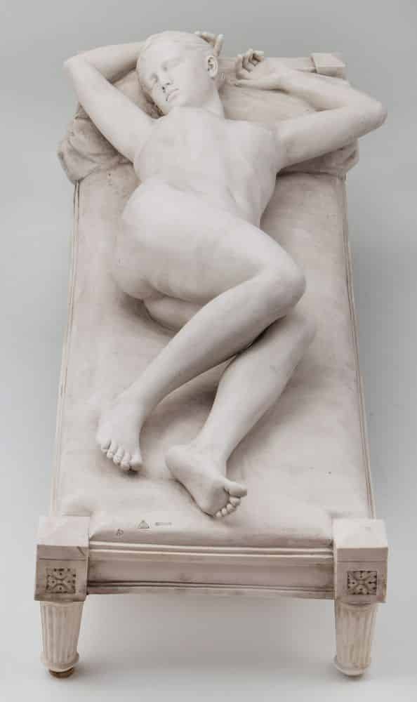 Zmysłowo przedstawiona młoda kobieta śpiąca na wznak na łóżku w stylu ludwika XVI. Ciało jest lekko skręcone na kształt litery S.