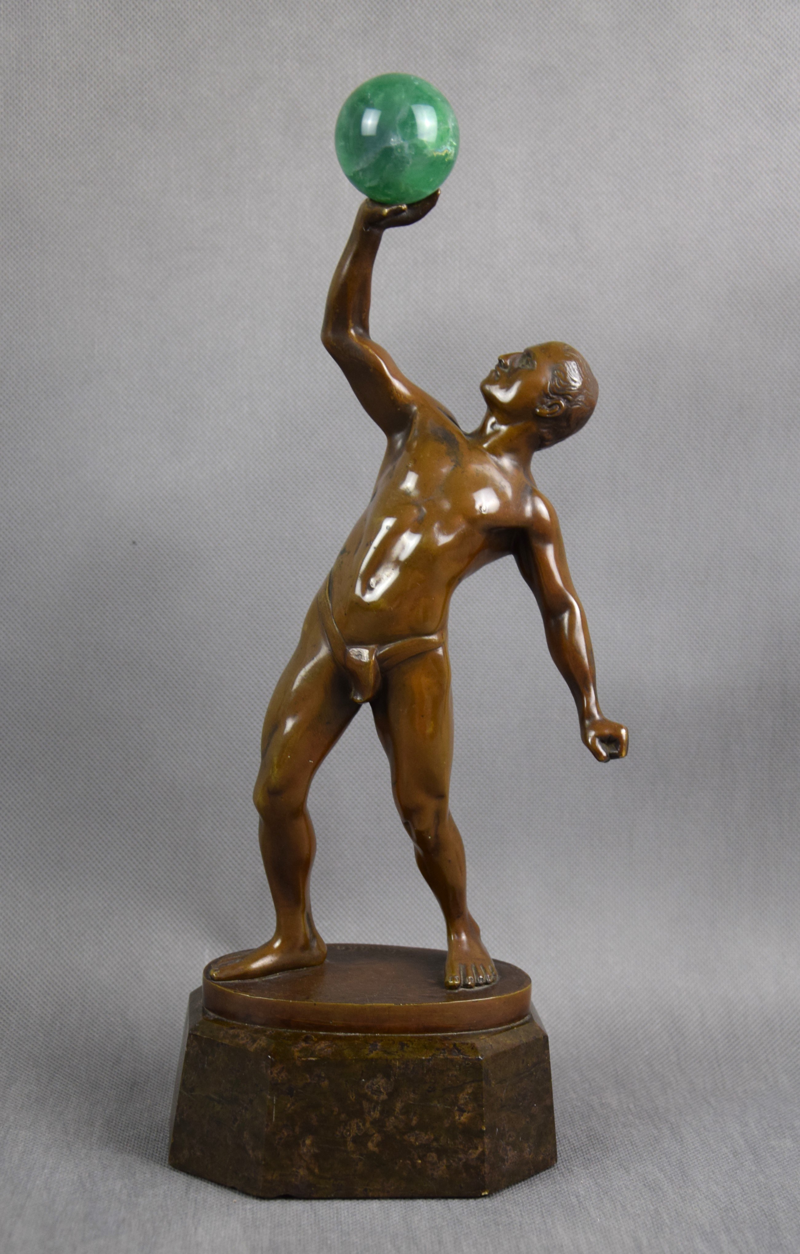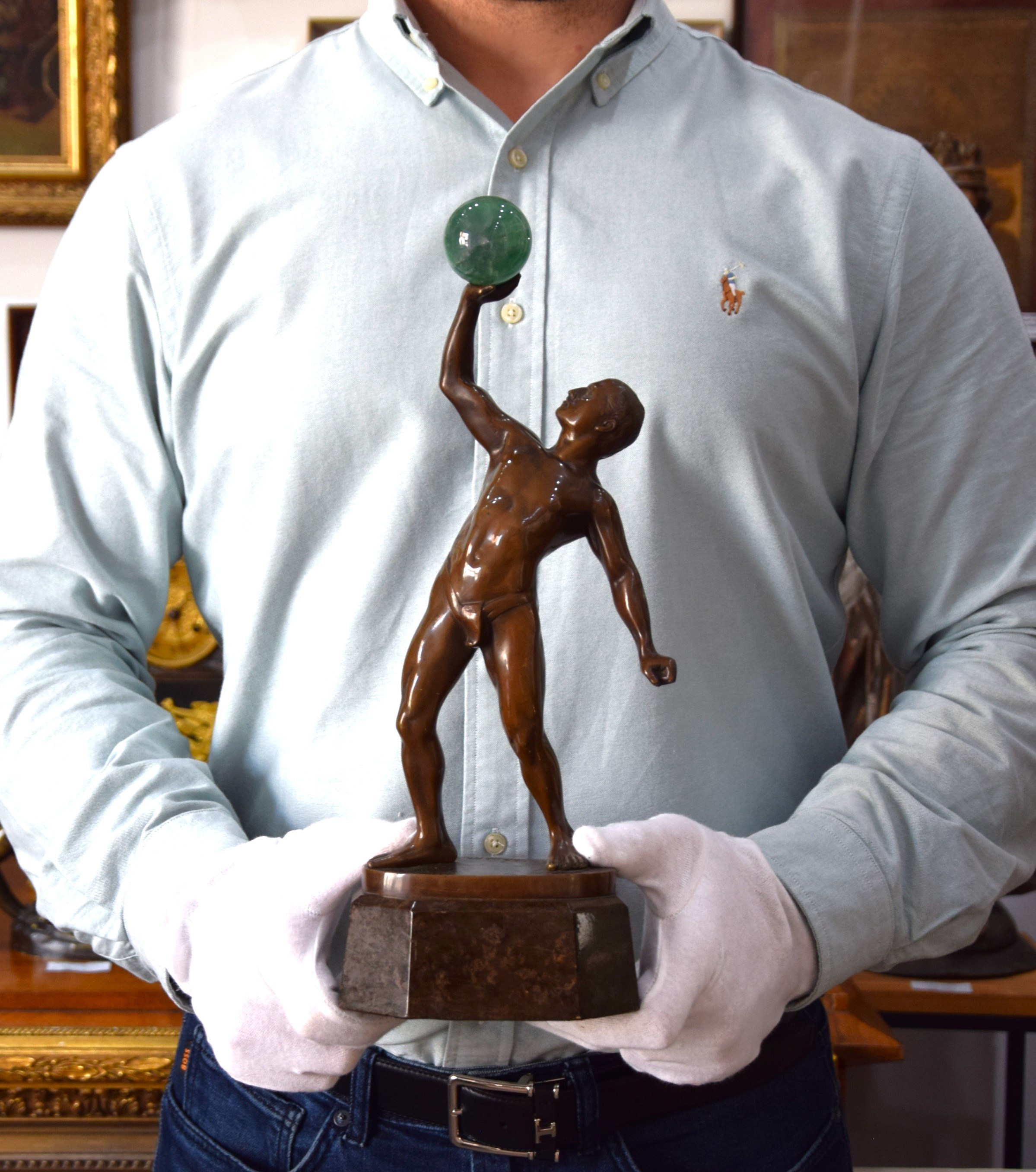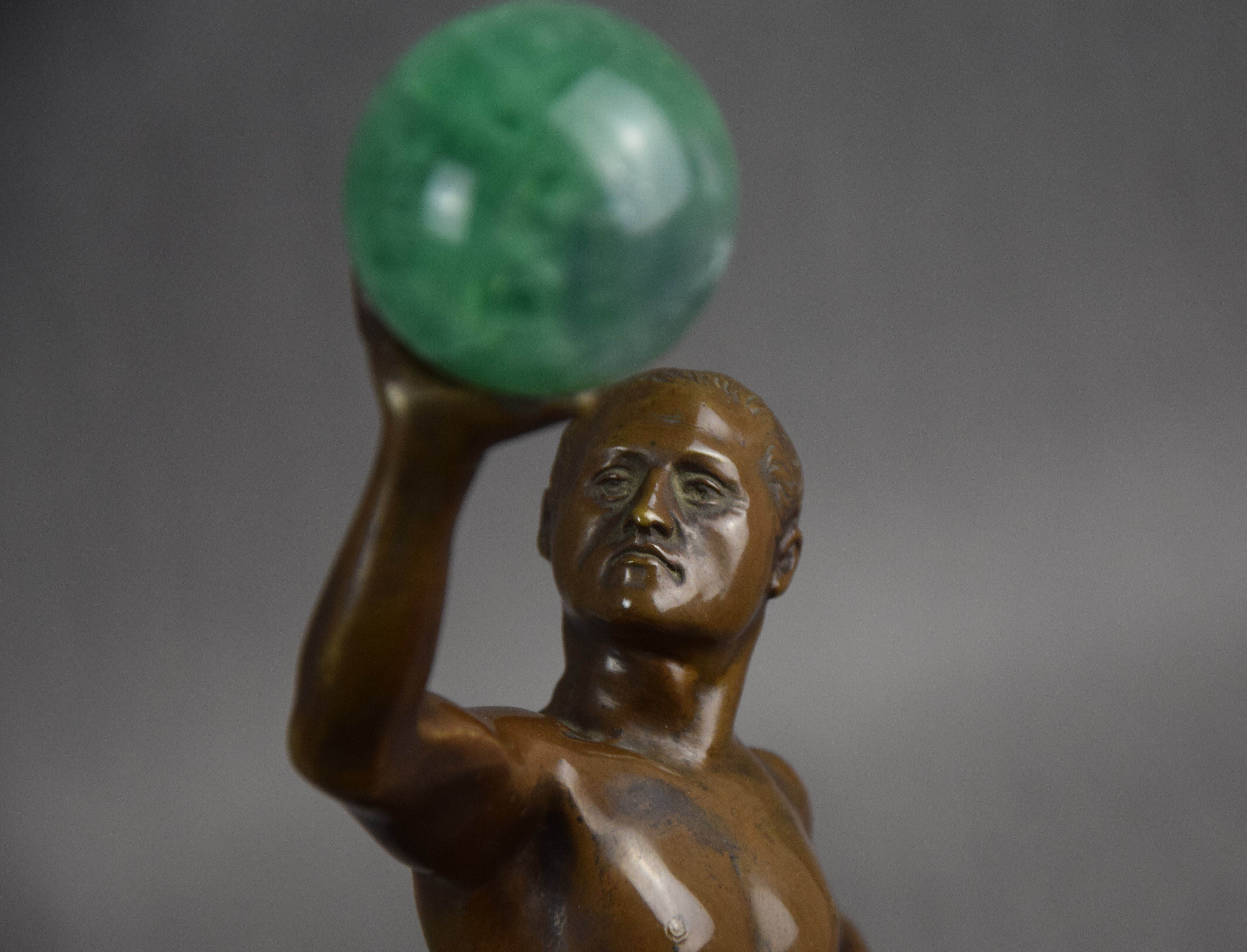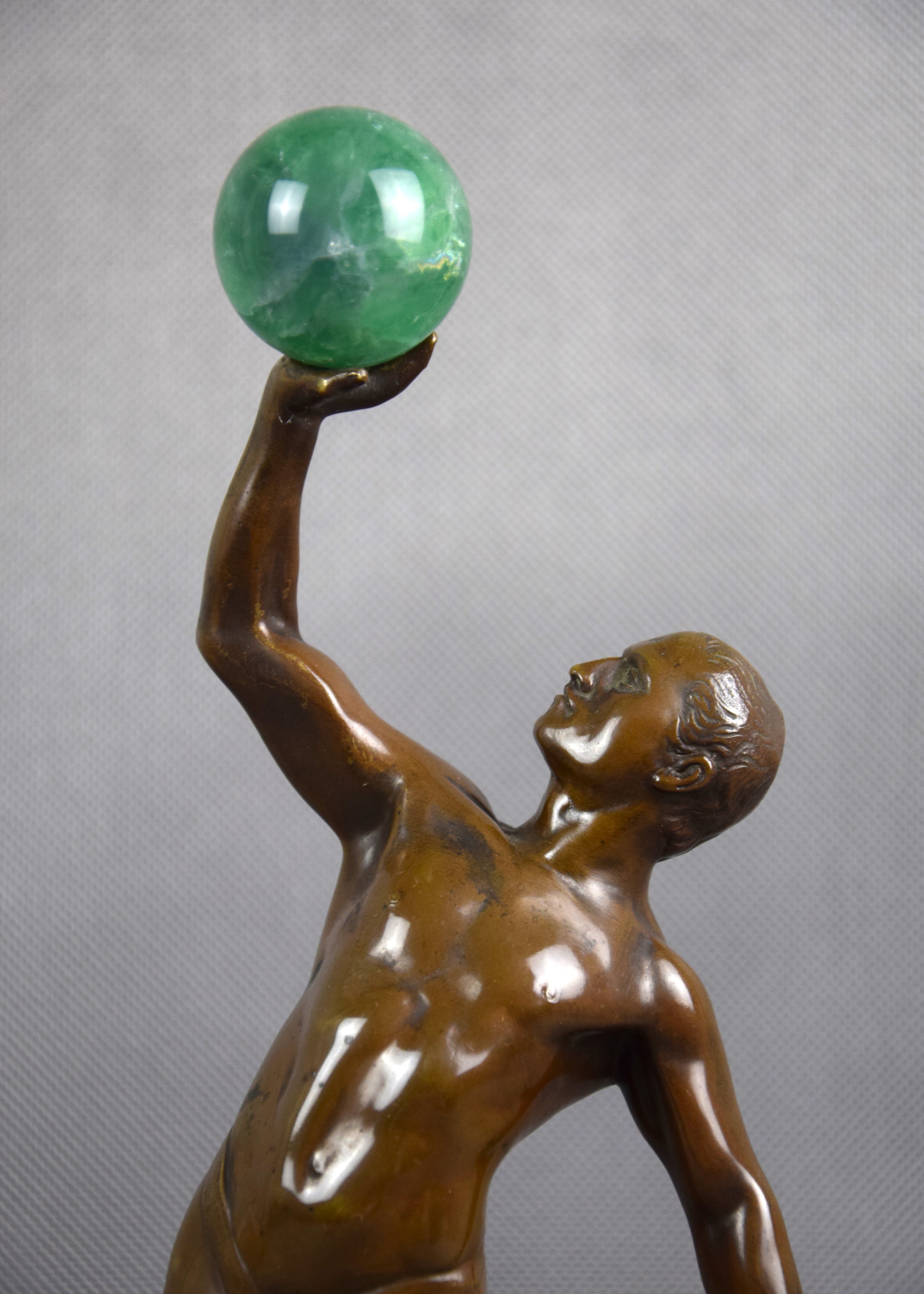 Brąz patynowany, podstawa marmurowa, w dłoni Siłacza kamienna kula z Fluorytu.