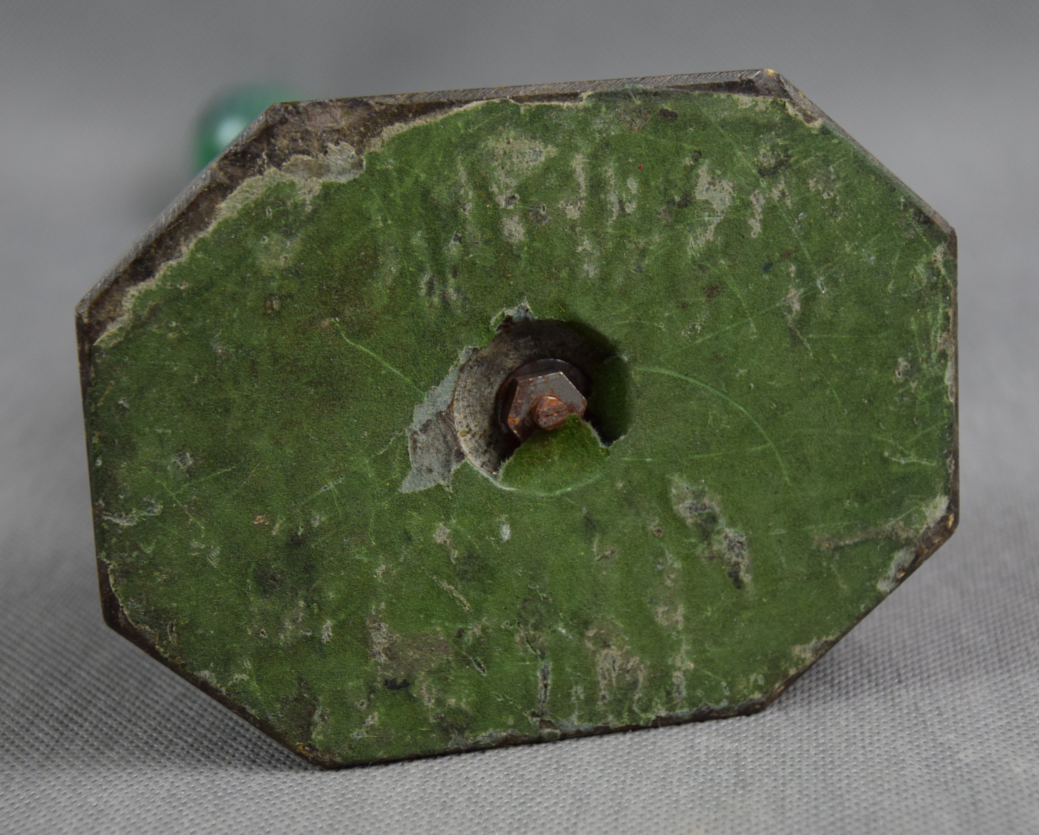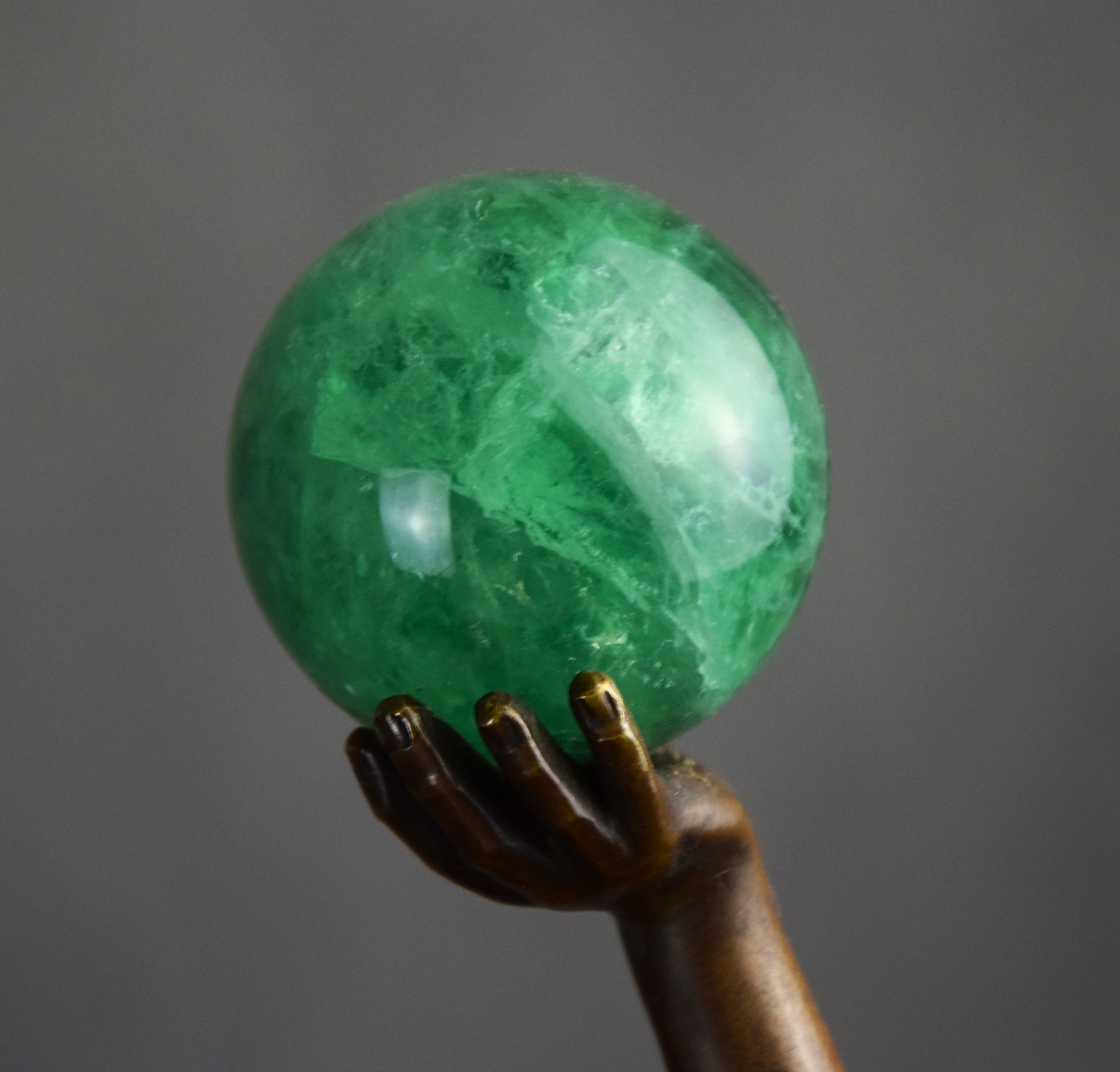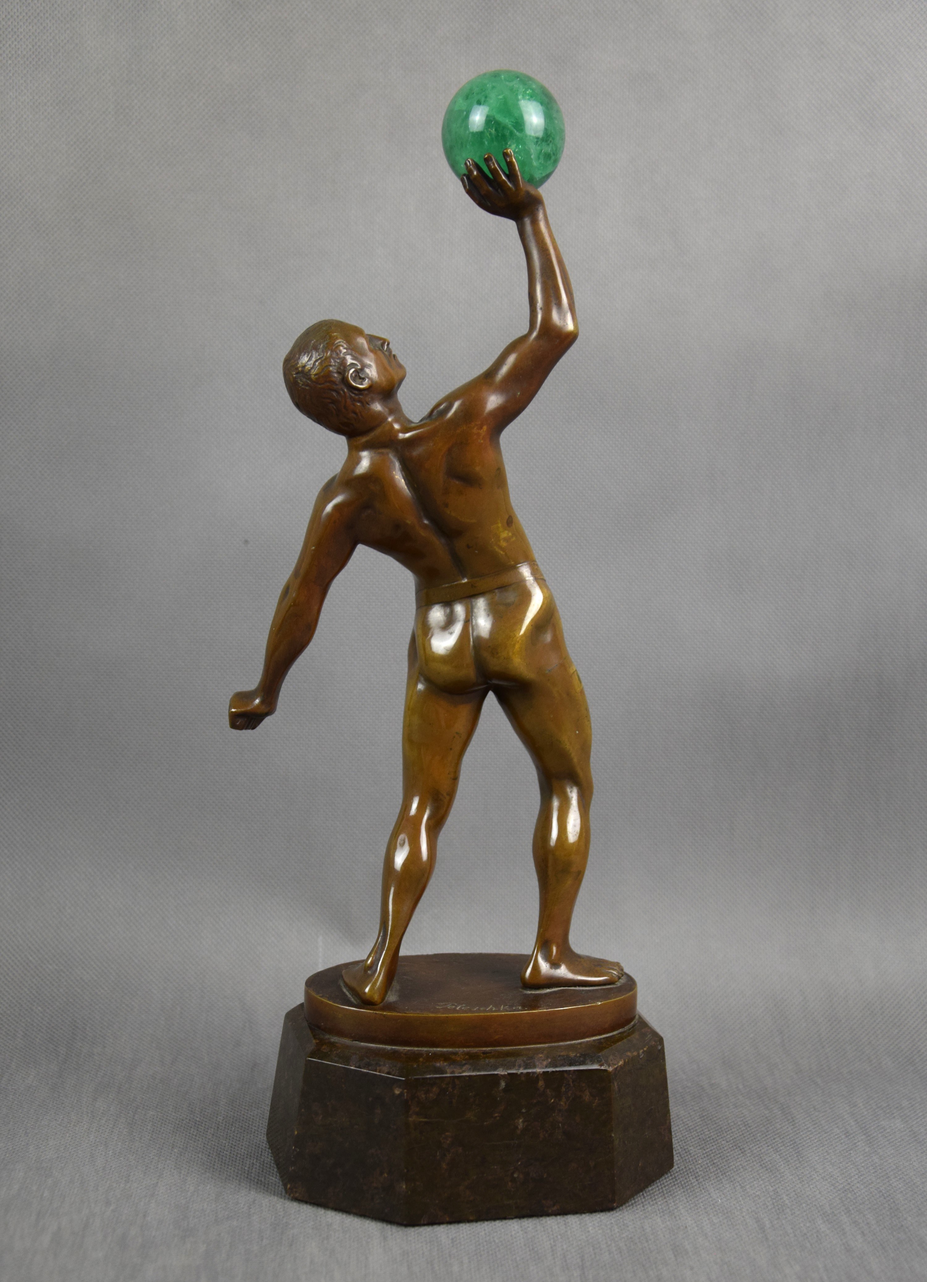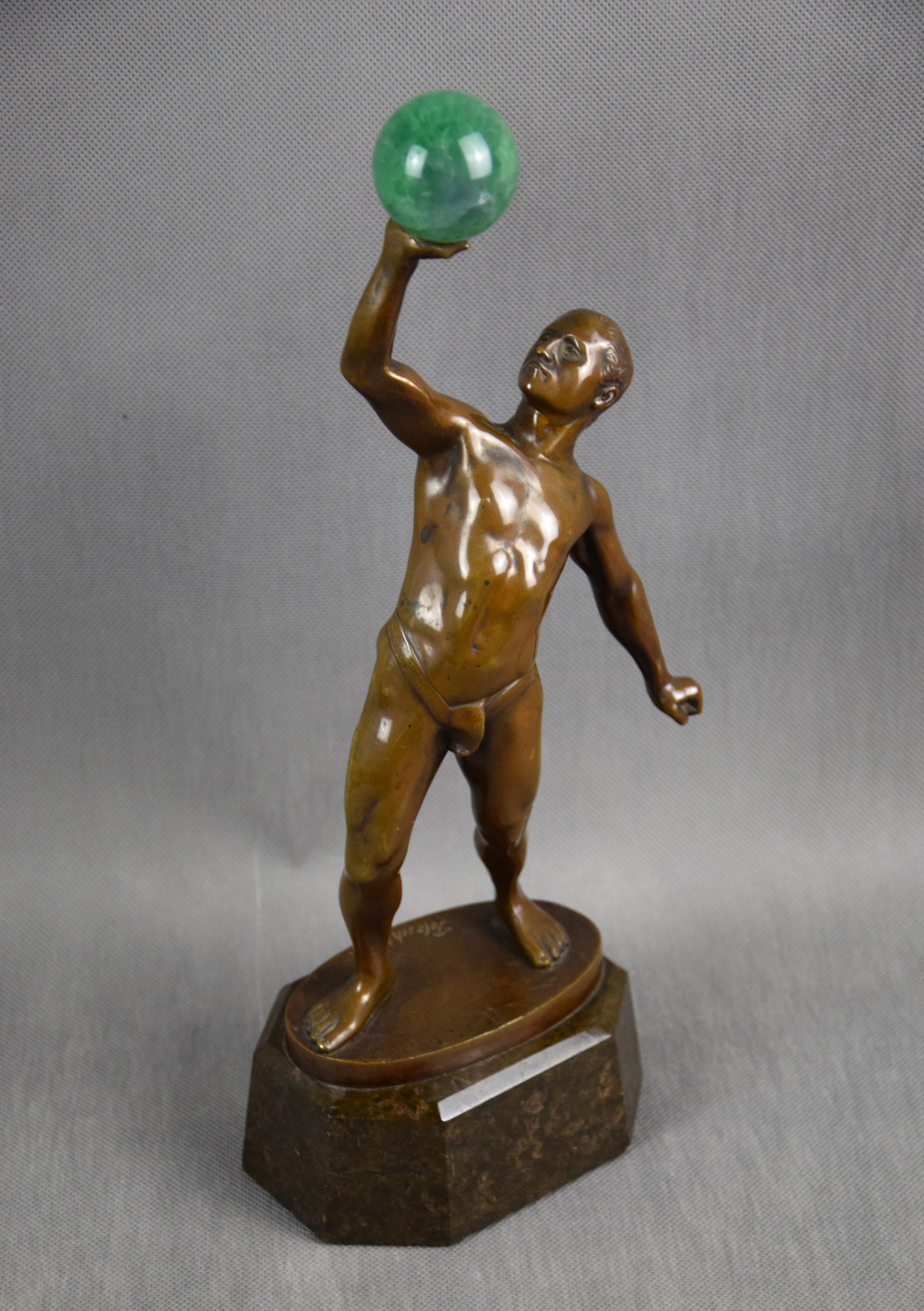 Brąz patynowany, podstawa marmurowa, w dłoni Siłacza kamienna kula z Fluorytu.