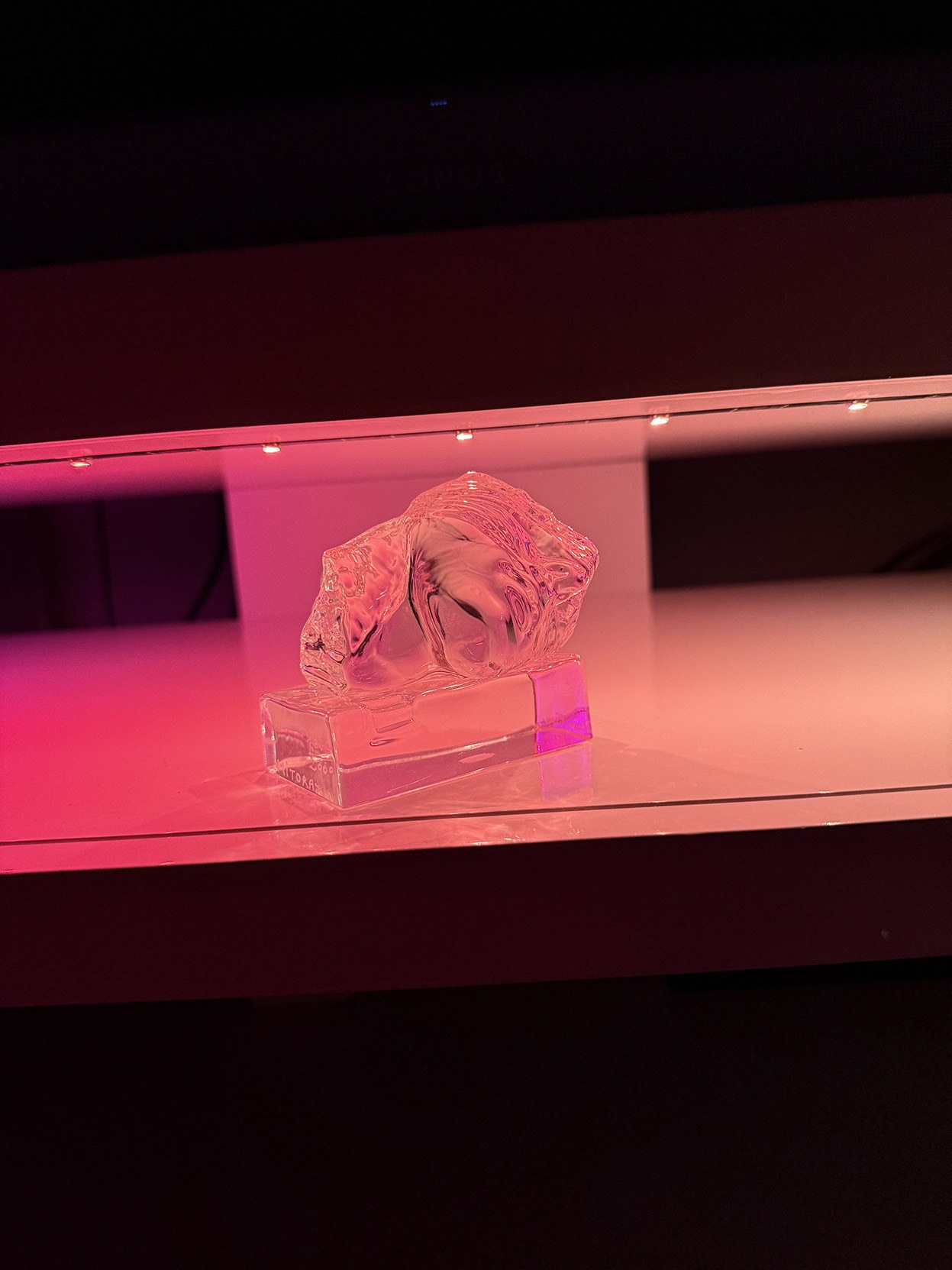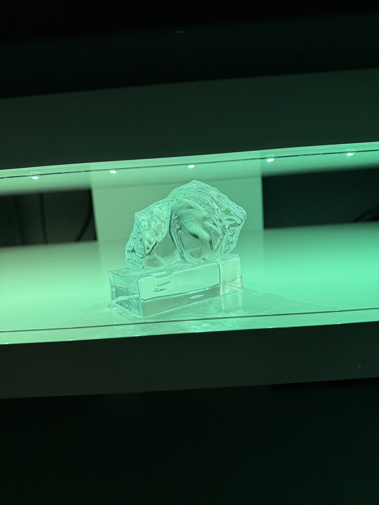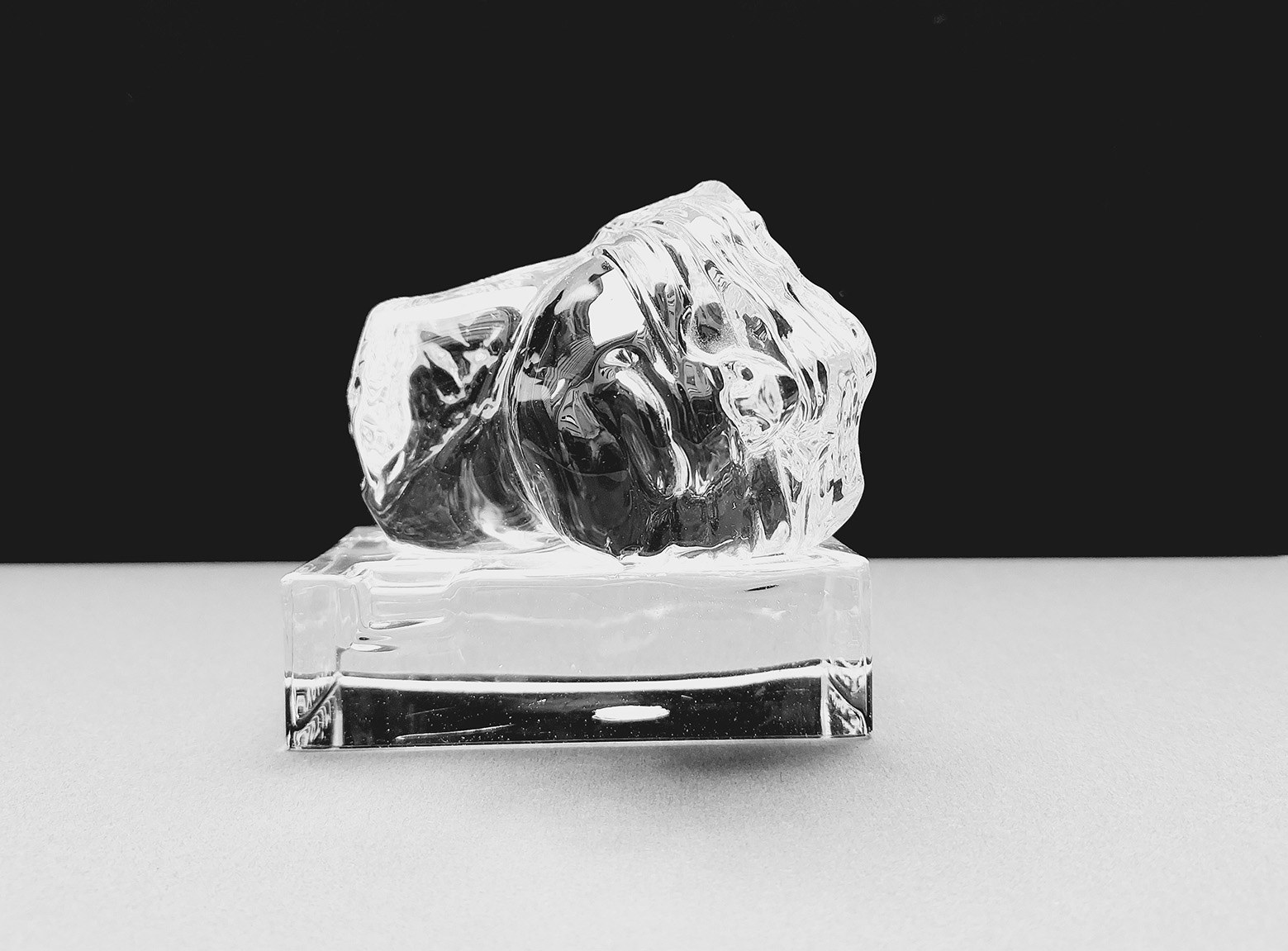 • Przezroczysta wersja rzeźby wykonana jest zazwyczaj z kryształu Daum, czyli szkła artystycznego formowanego techniką pâte de verre (szkło mielone i stapiane w formie). To specjalność tej manufaktury.