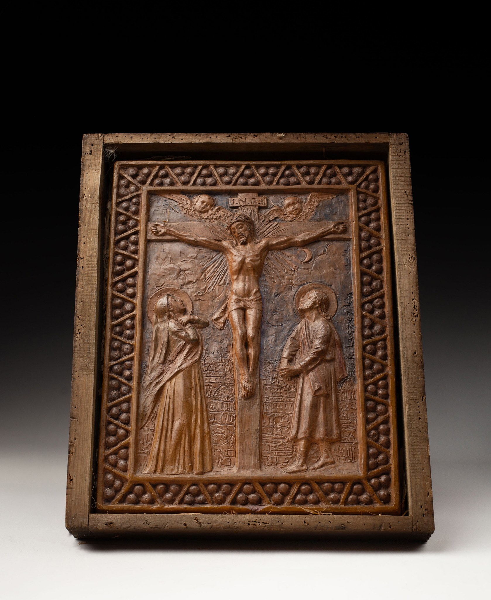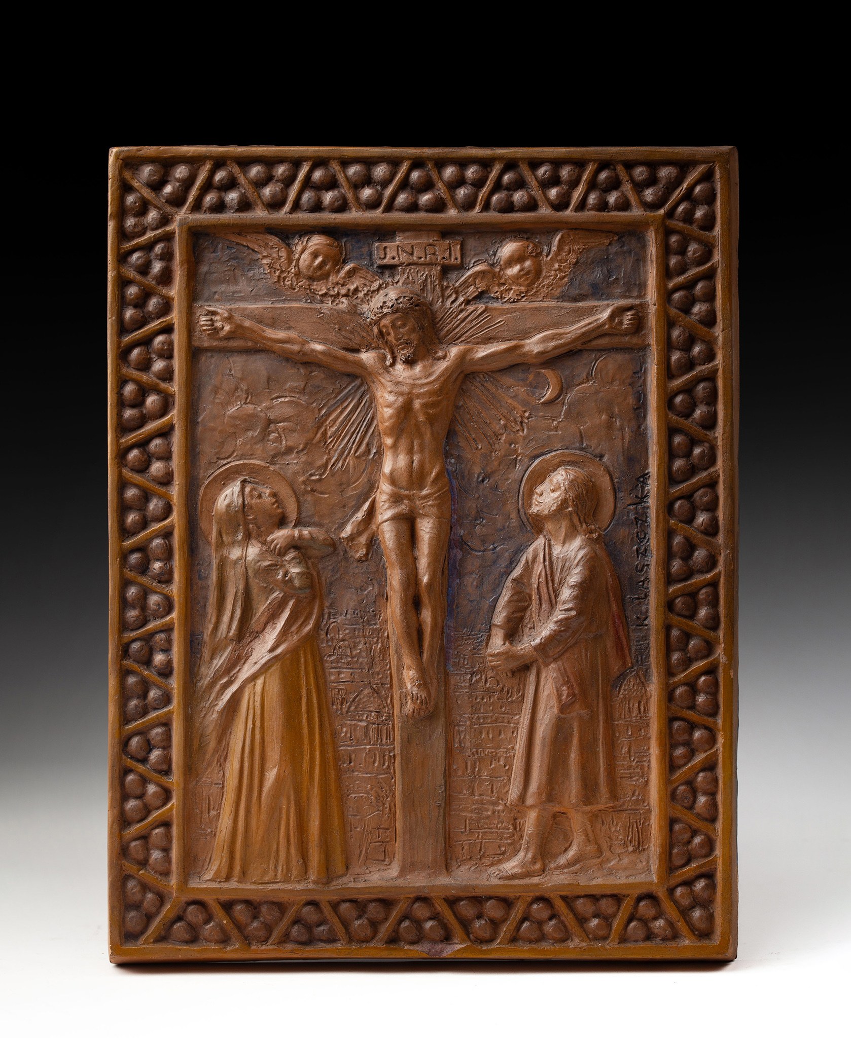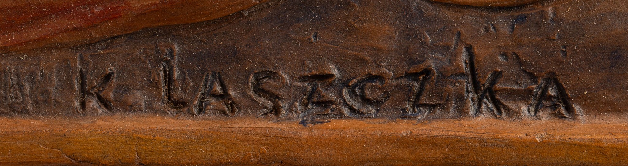 terakota, częściowo polichromowana, lata 30. XX wieku, 40 x 31 x 3 cm, sygnowana wzdłuż prawej krawędzi: "K.LASZCZKA".