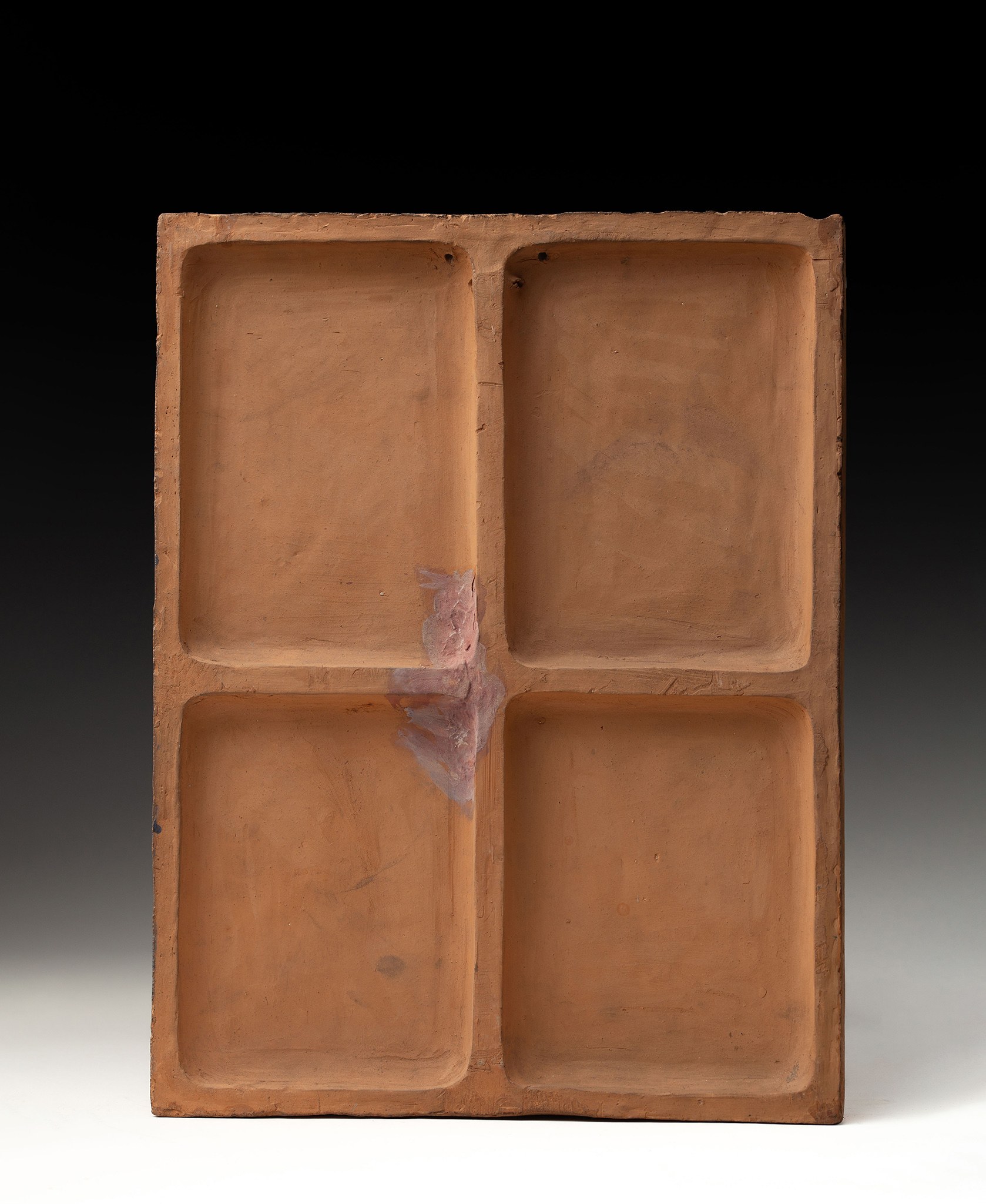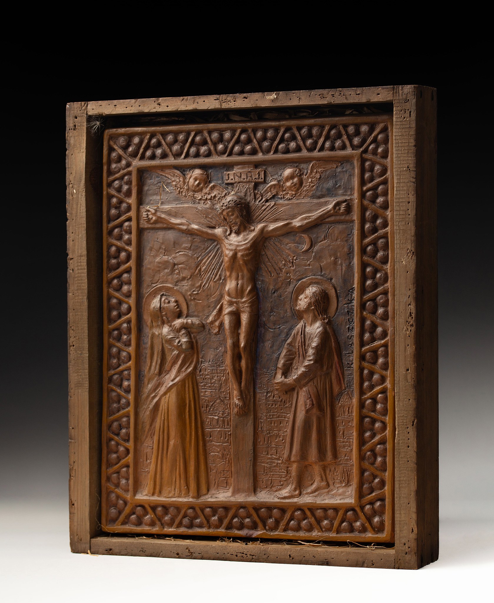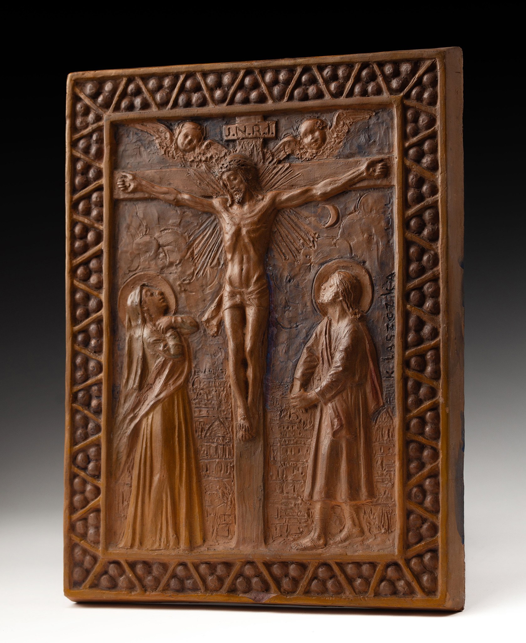 terakota, częściowo polichromowana, lata 30. XX wieku, 40 x 31 x 3 cm, sygnowana wzdłuż prawej krawędzi: "K.LASZCZKA".