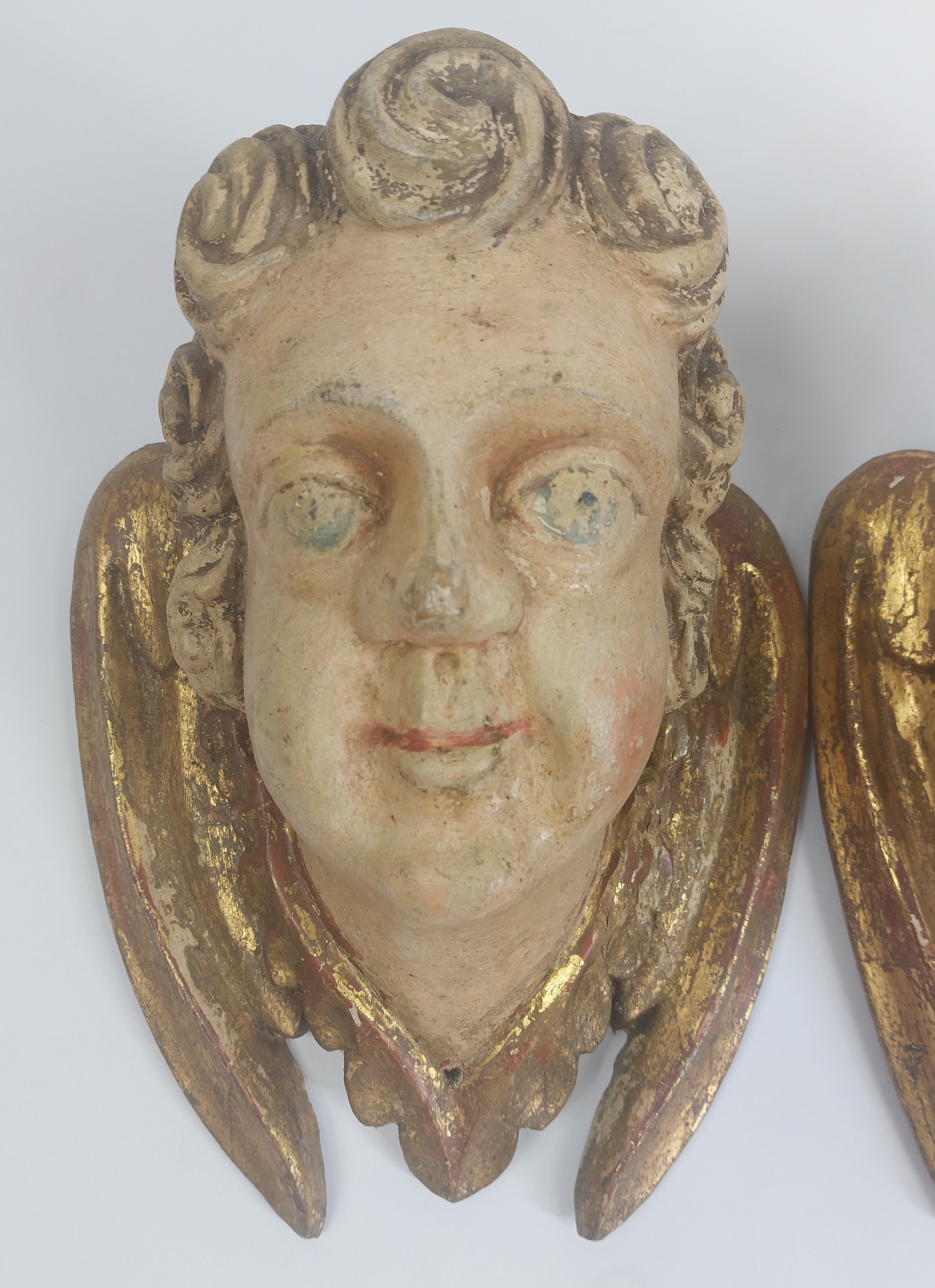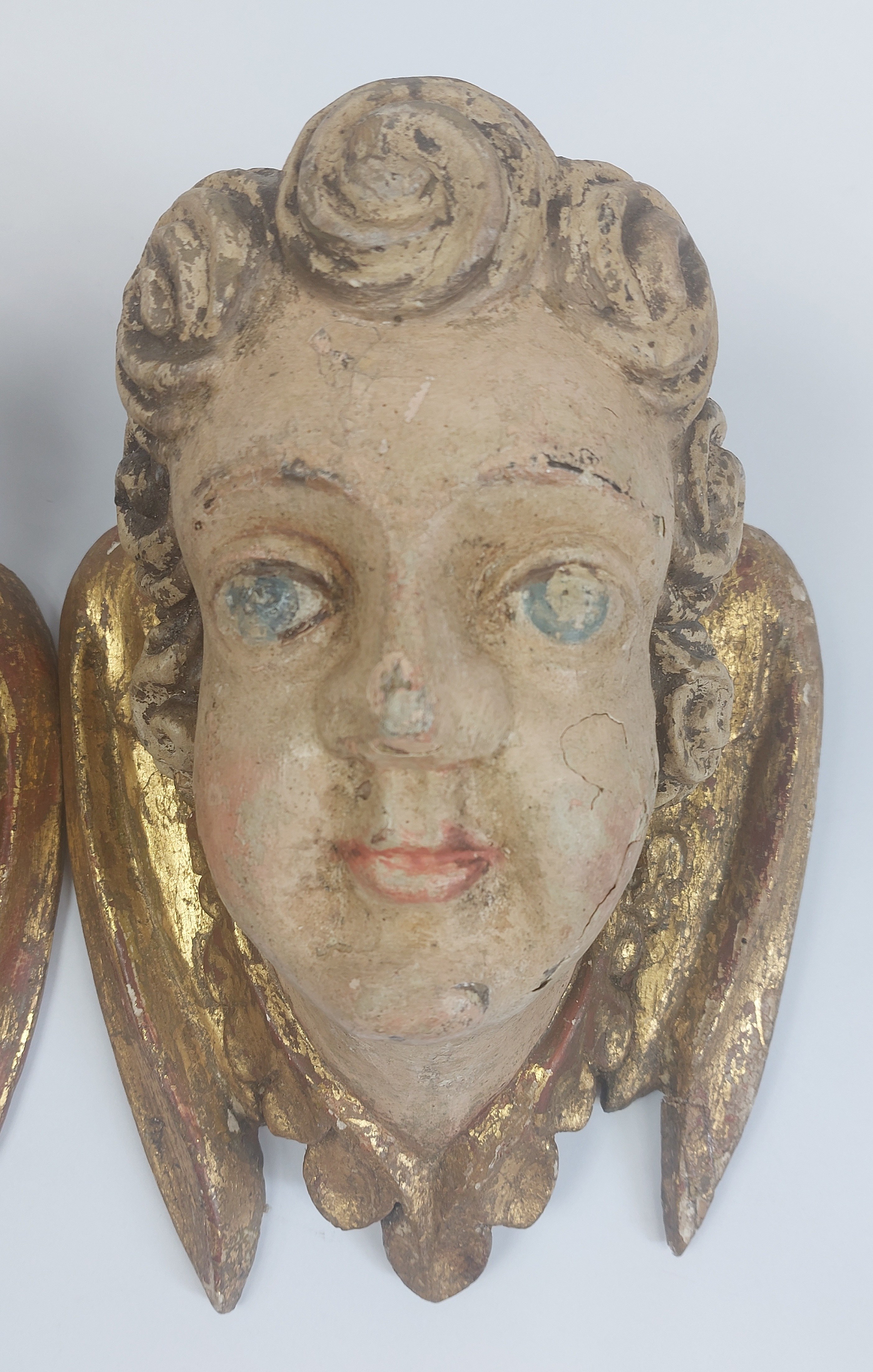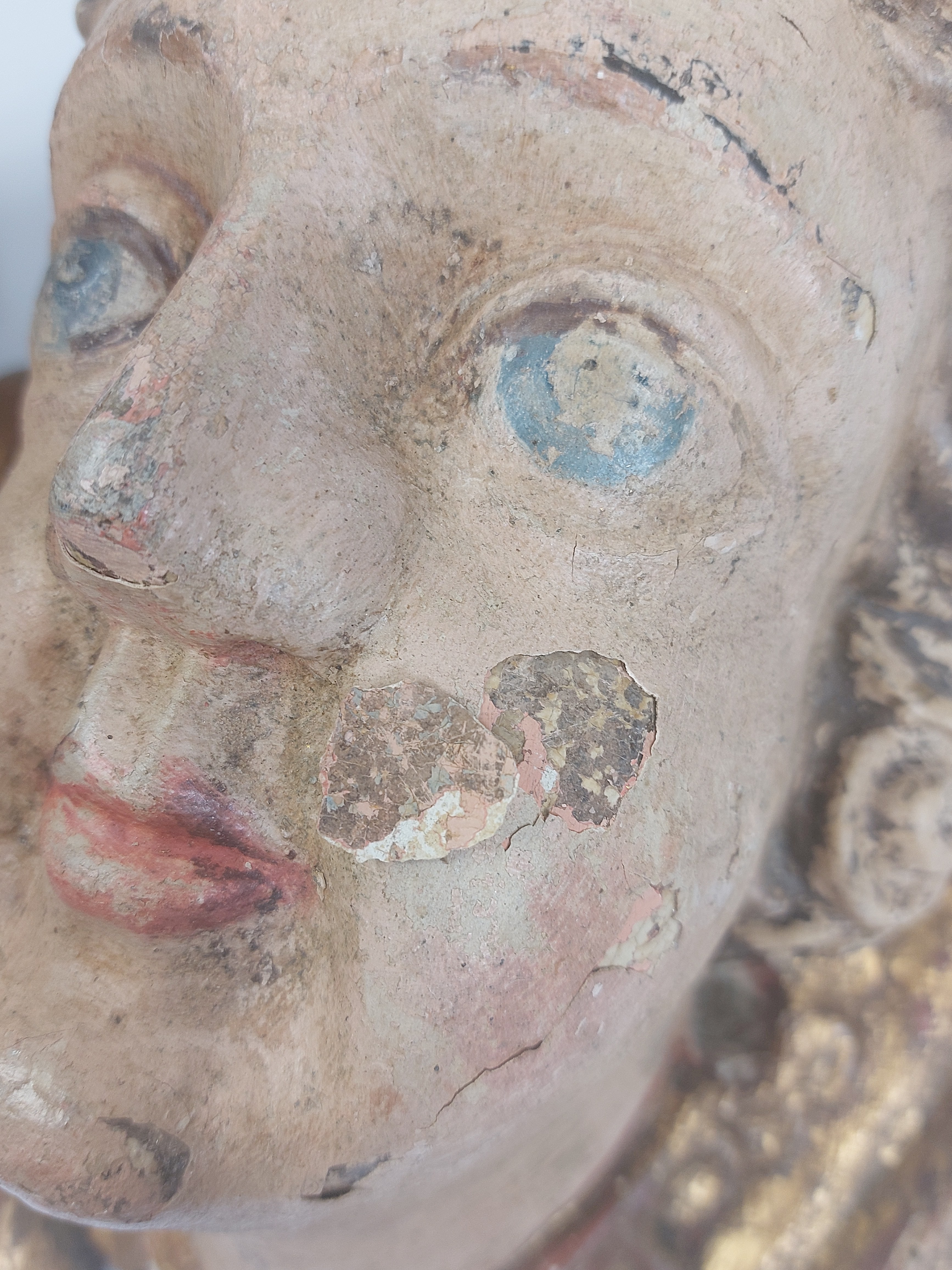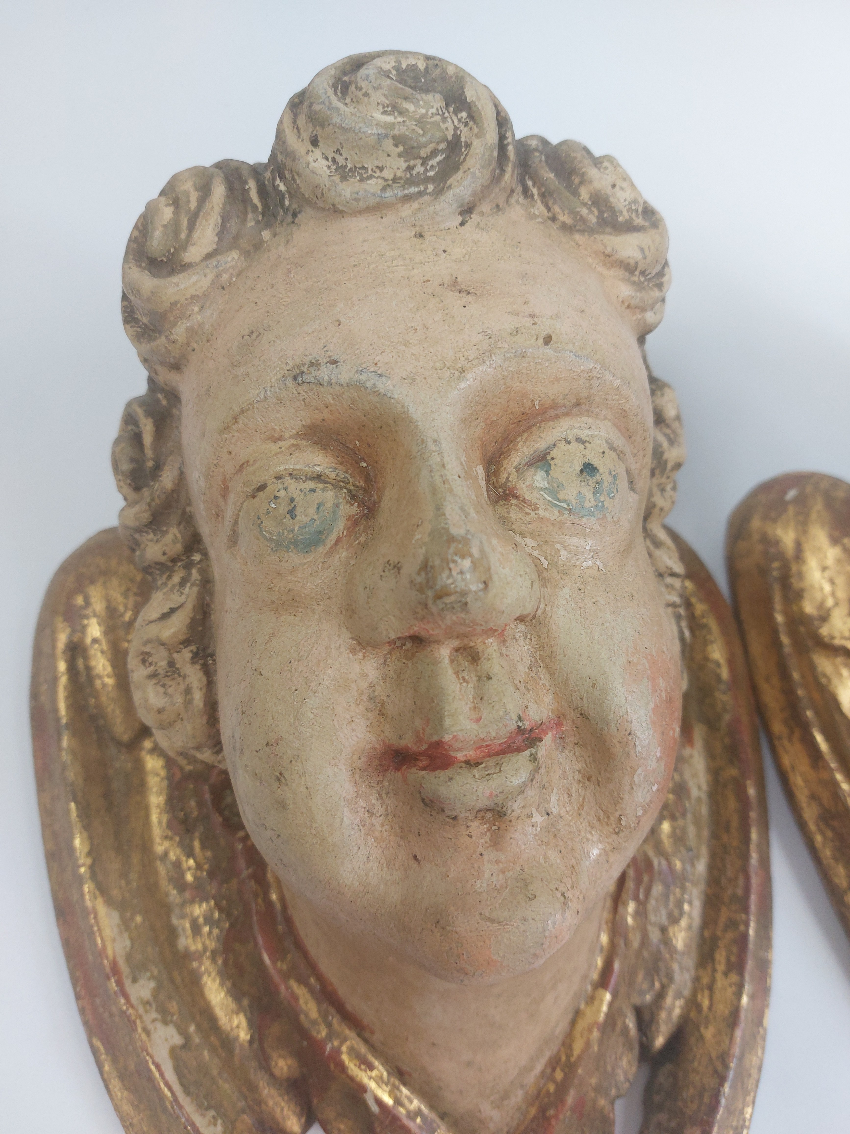 niewielkie ubytki pierwotnej polichromii widoczne na zdjęciach, ubytek na policzku, stan bardzo dobrze widoczny na zdjęciach
