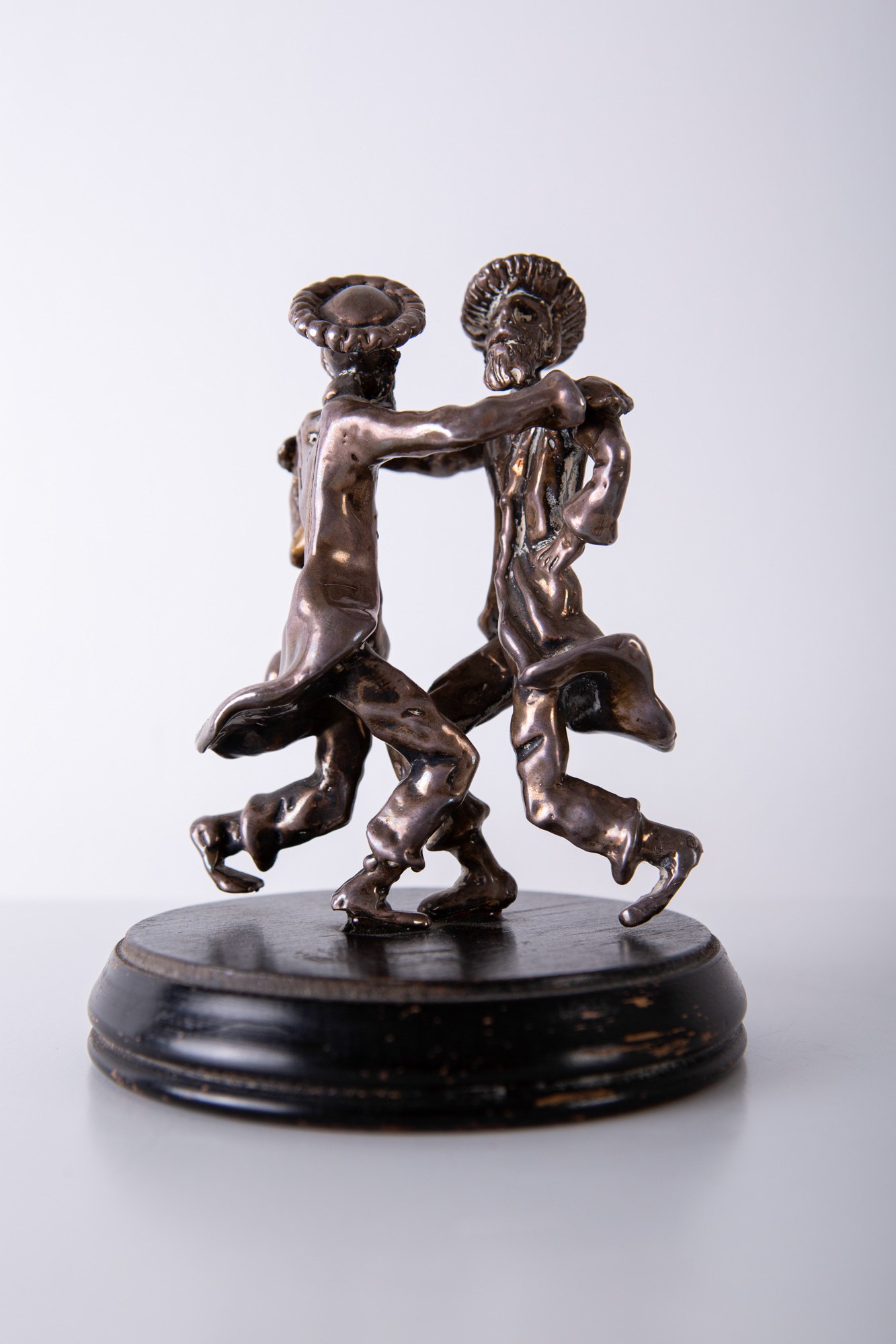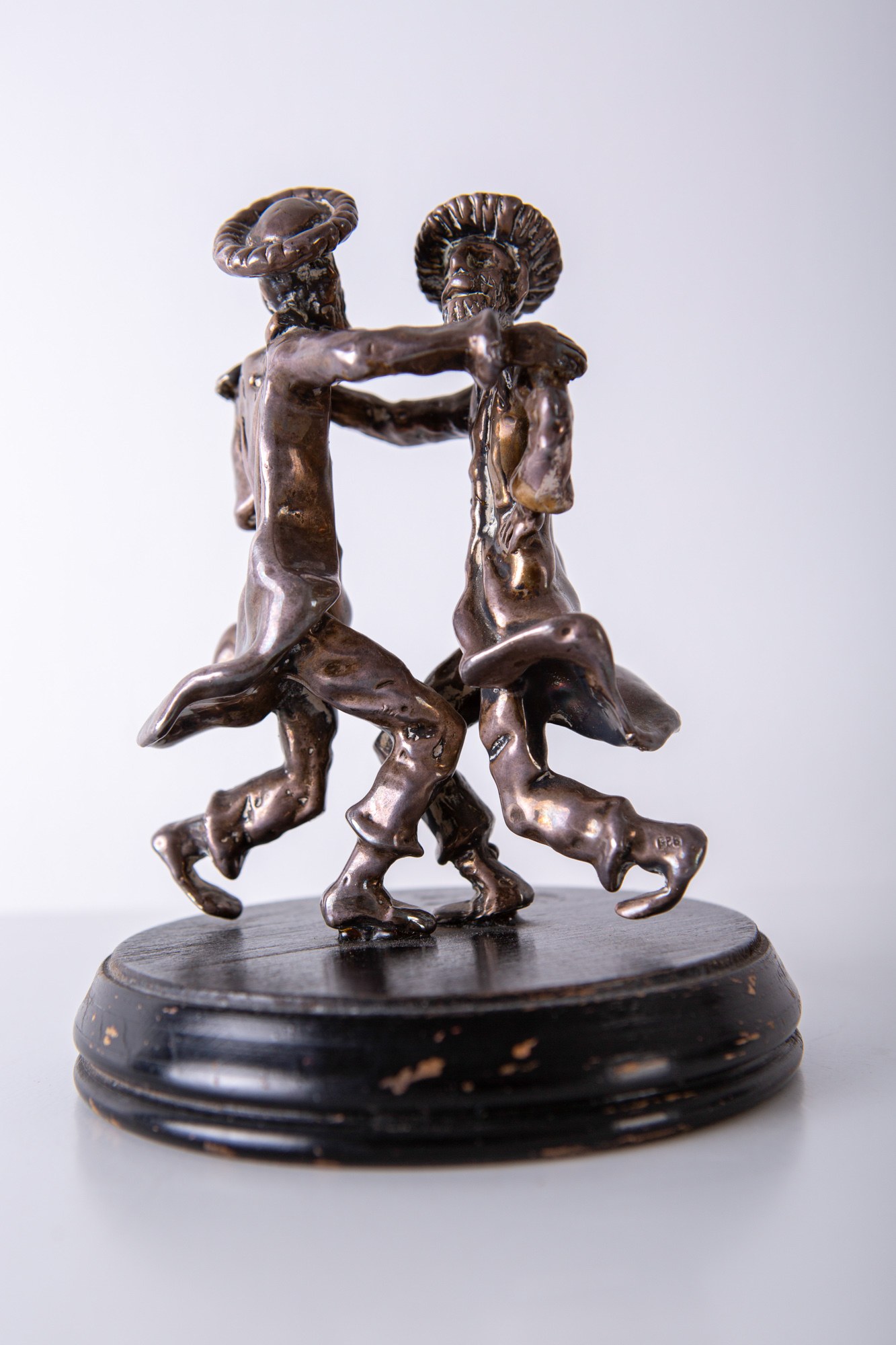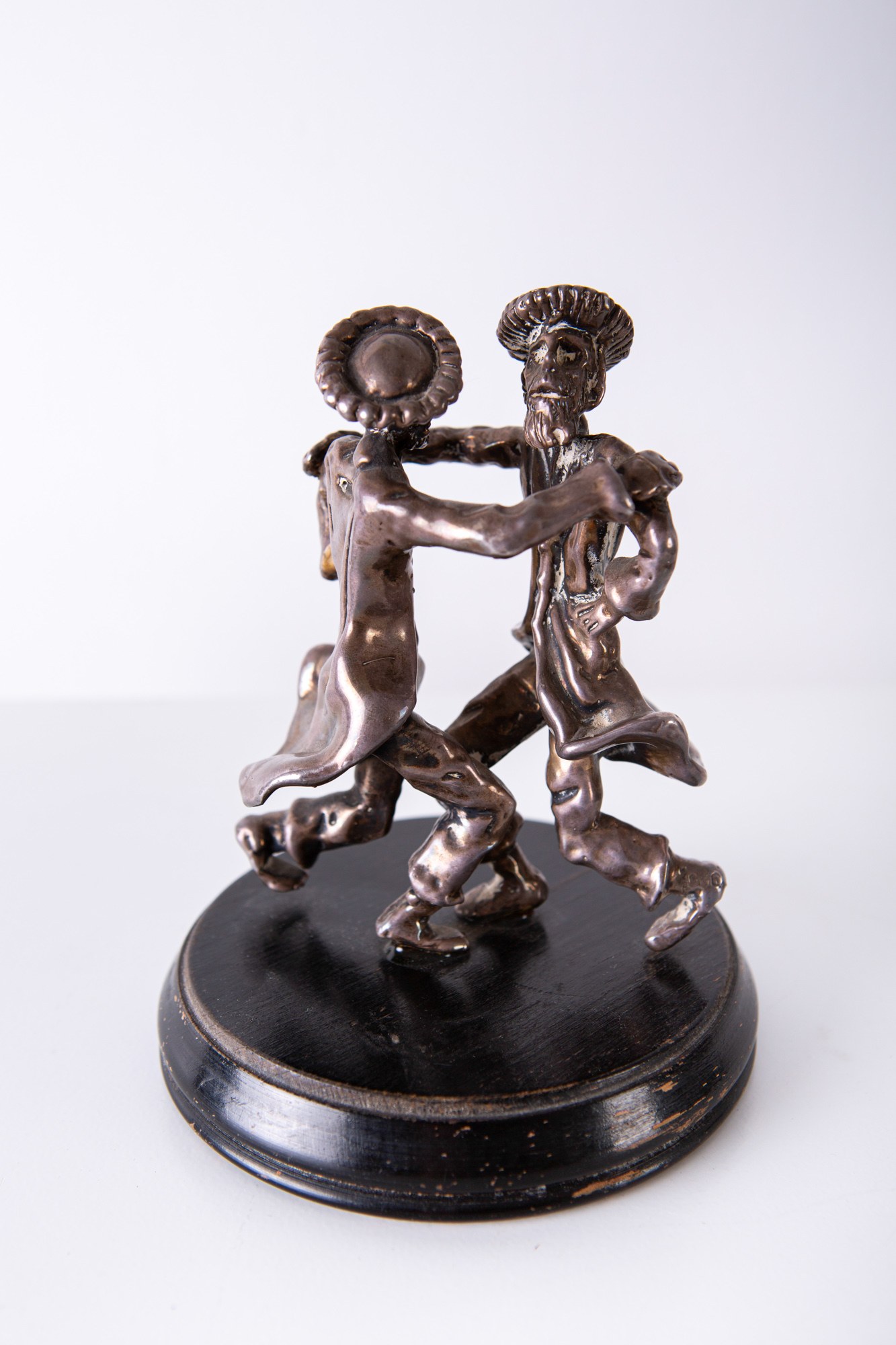 A silver figurine depicting two Hasidic Jews dancing arm in arm, dressed in traditional