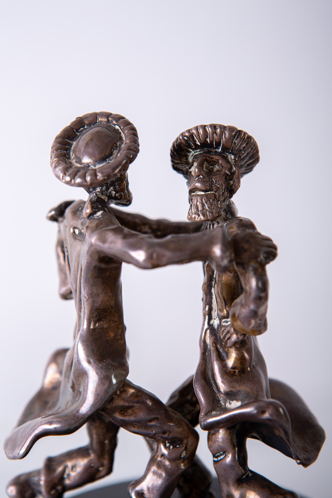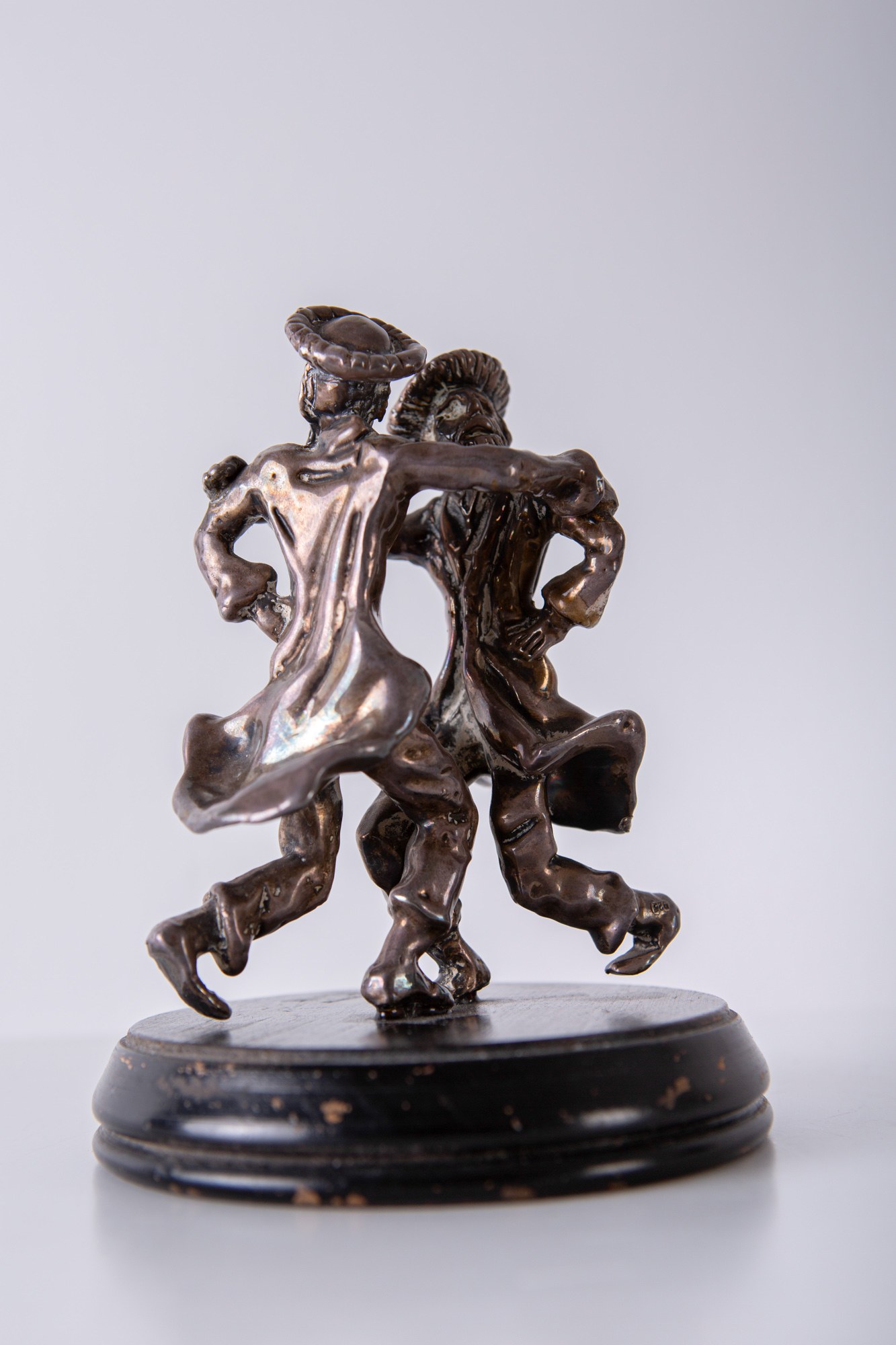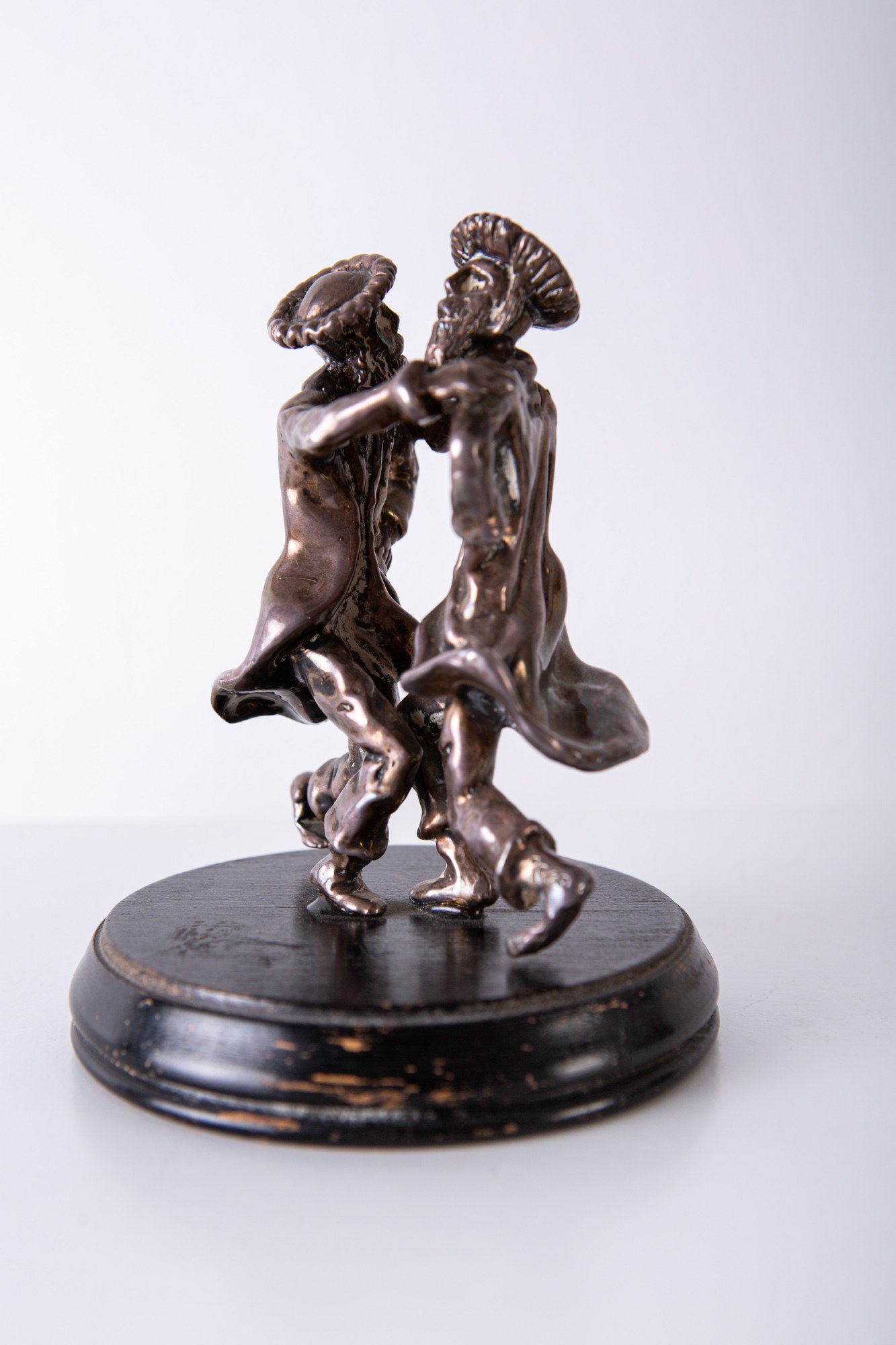 A silver figurine depicting two Hasidic Jews dancing arm in arm, dressed in traditional