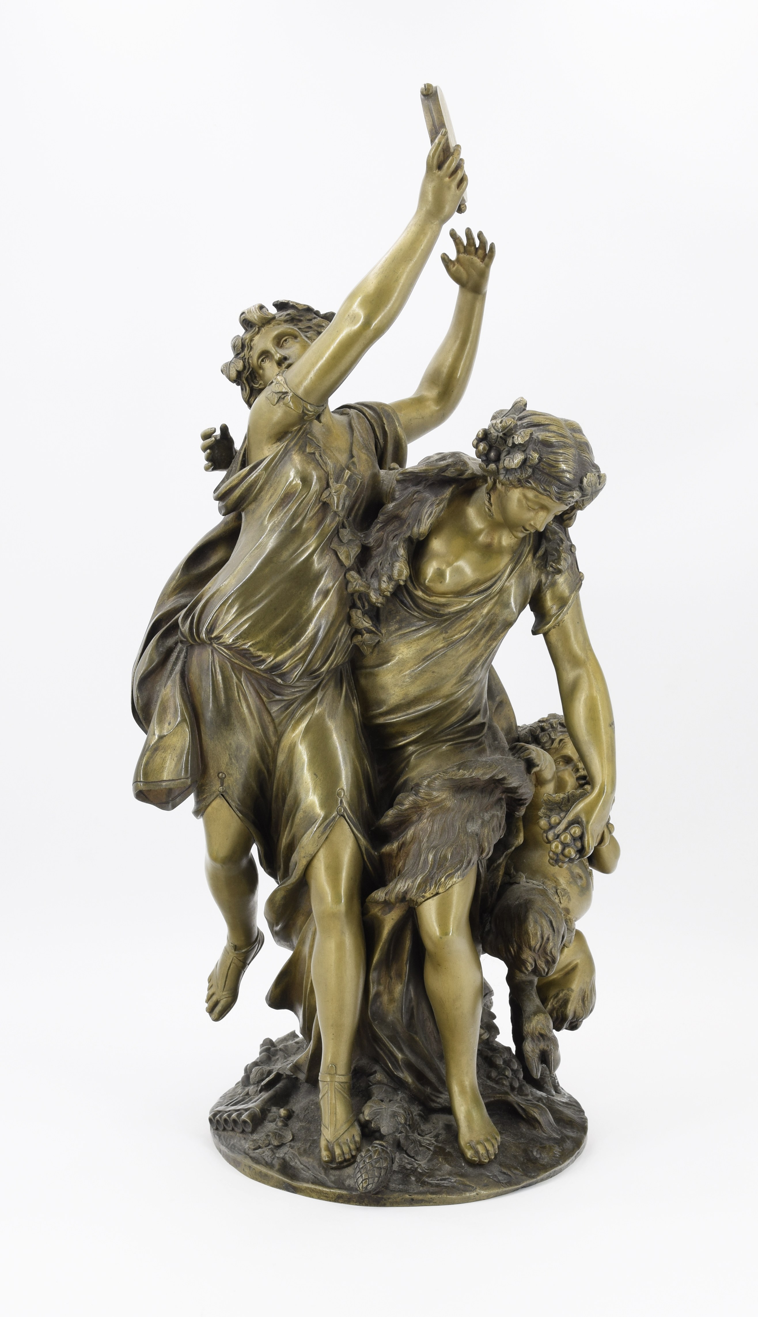 Grupa figuralna: para bosych, obejmujących się bachantek w drapowanych, krótkich szatach: jedna w uniesionych rękach trzyma tamburyn, druga pochyla się ku stojącemu u jej boku małemu faunowi o koźlich nóżkach. Na kolistej podstawie leżą owoce, szyszki chmielu i syringa.