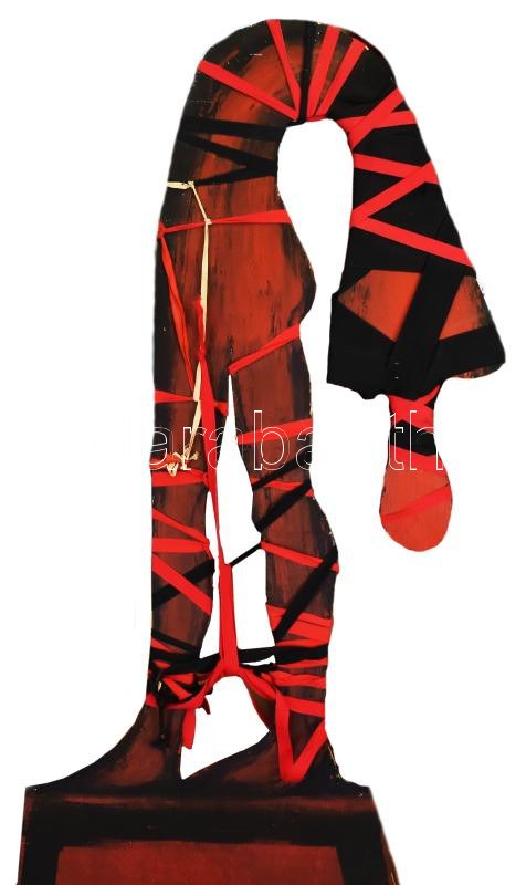 El Kazovszkij (1948-2008): Gúzsba kötött (cím nélkül). Olaj, applikáció, fa, jelzés nélkül. 200x67 cm. Proveniencia...