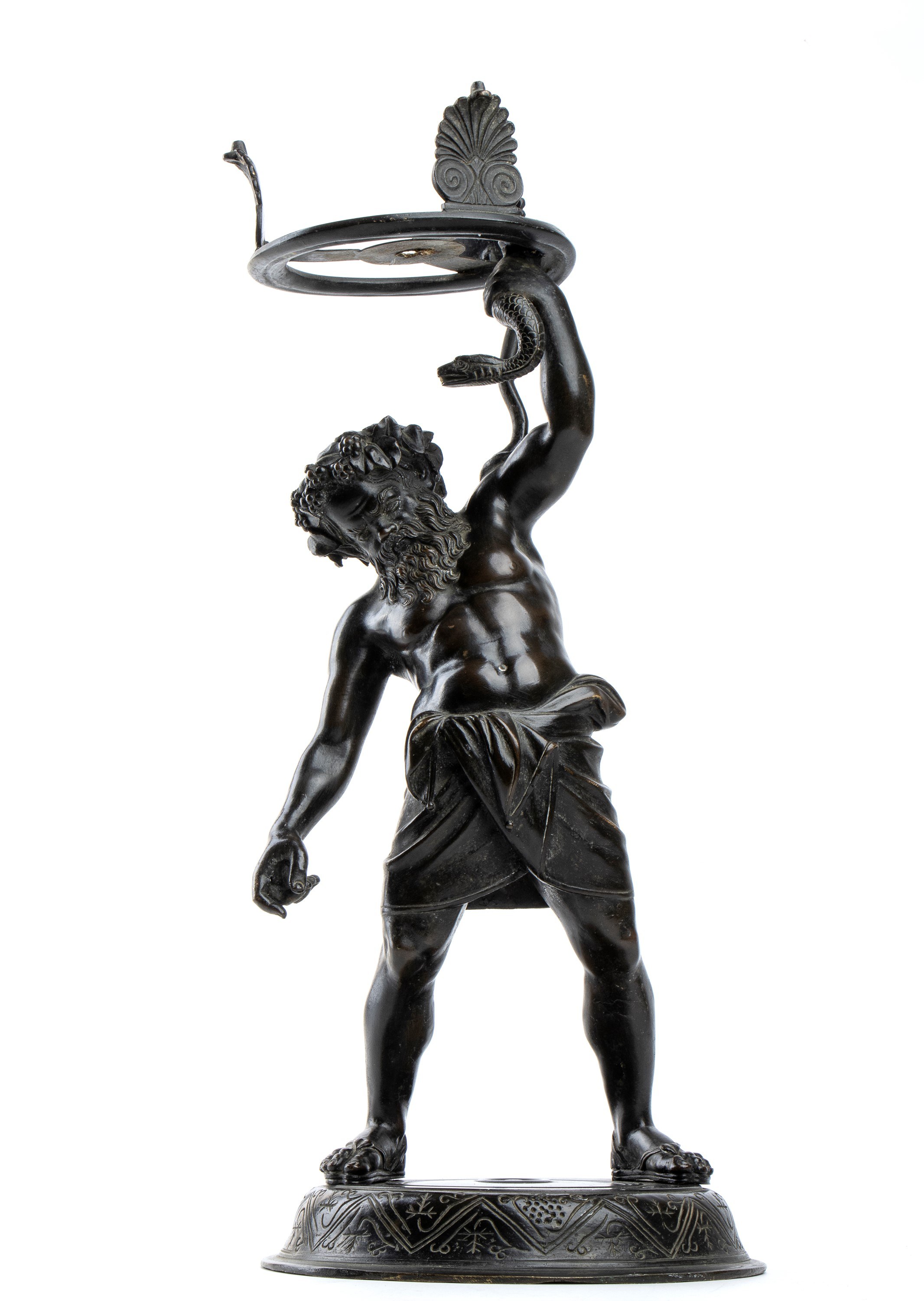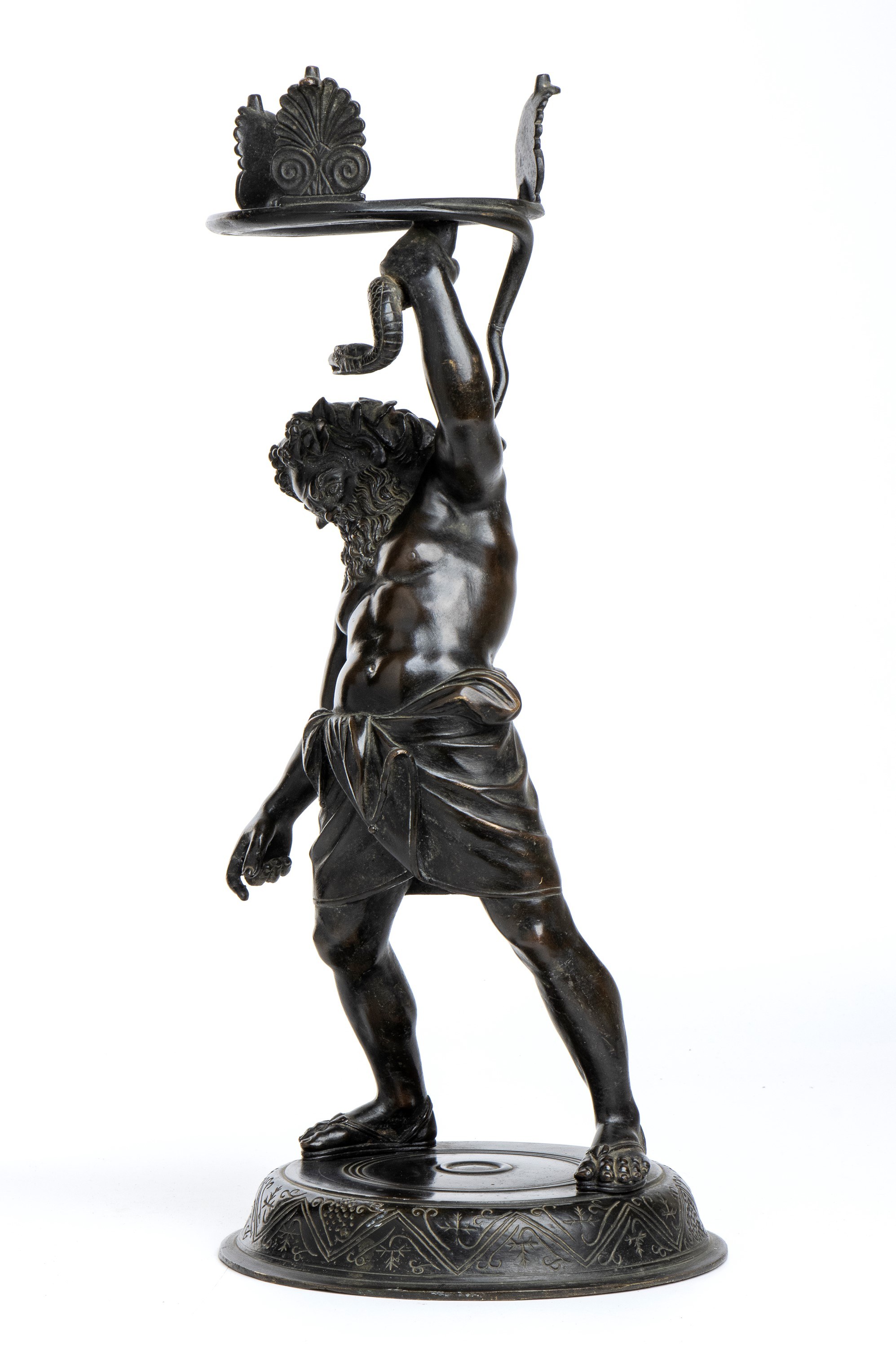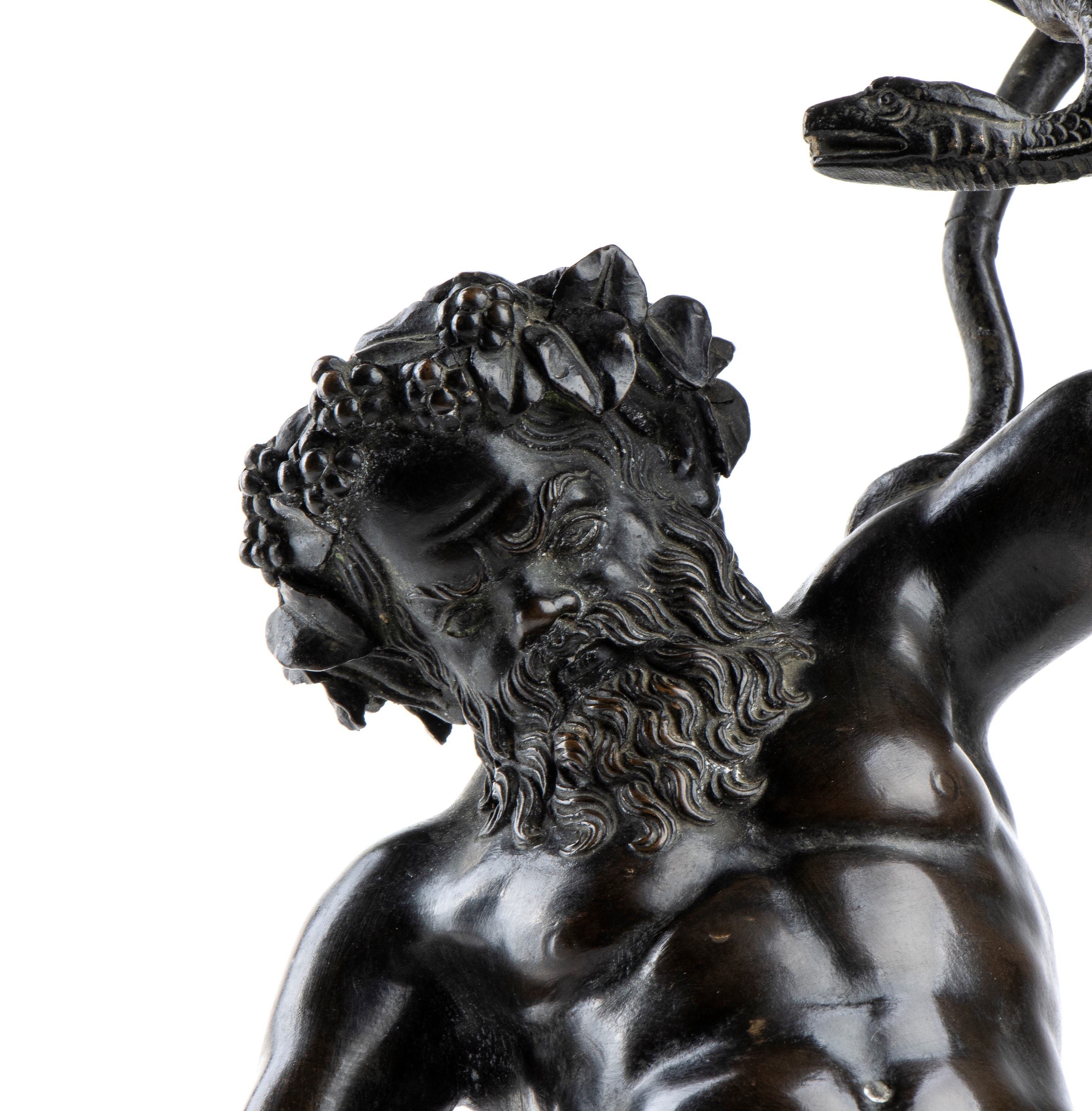 Ths model for this sculpture was found in the Pompeii excavations in 1864 and is currently located in the Archaeological Museum of Naples. The original sculpture is bronze and depicts Silenus holding a circle and a serpent. It was probably a structure for a basin.