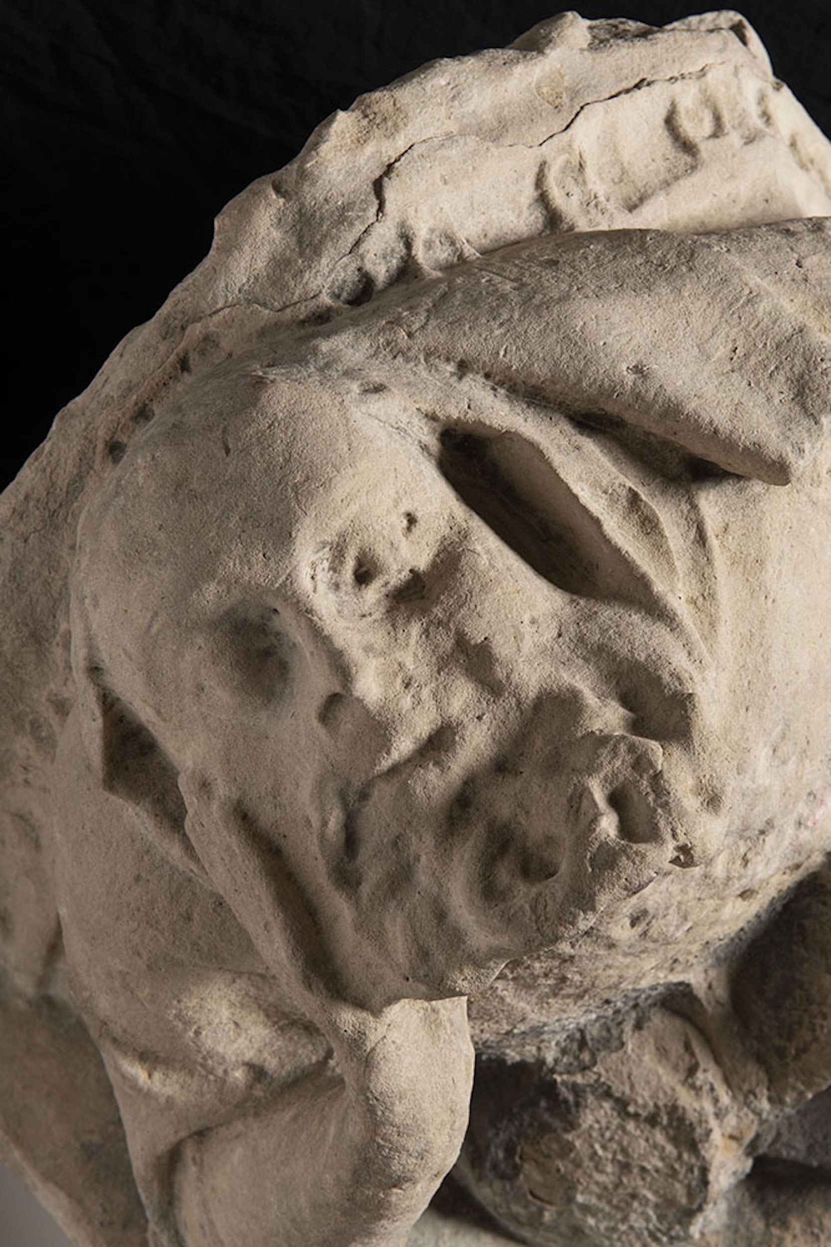 Sandstone. The sculpture was probably formerly built into a wall. Depicted is a sleeping, lying dwarf with a beard and a folded robe, supporting his head with his right hand. 40 x 40 cm.