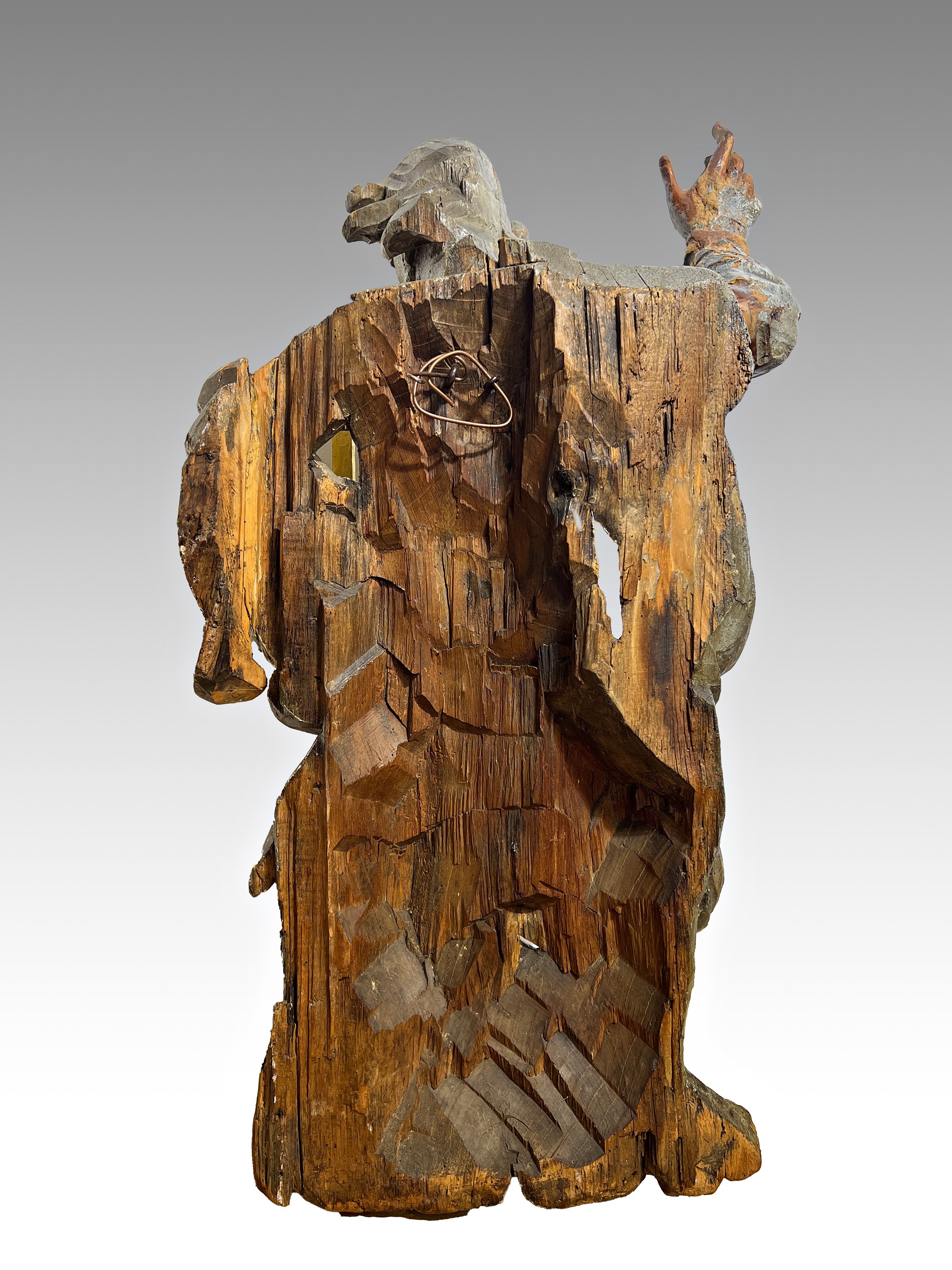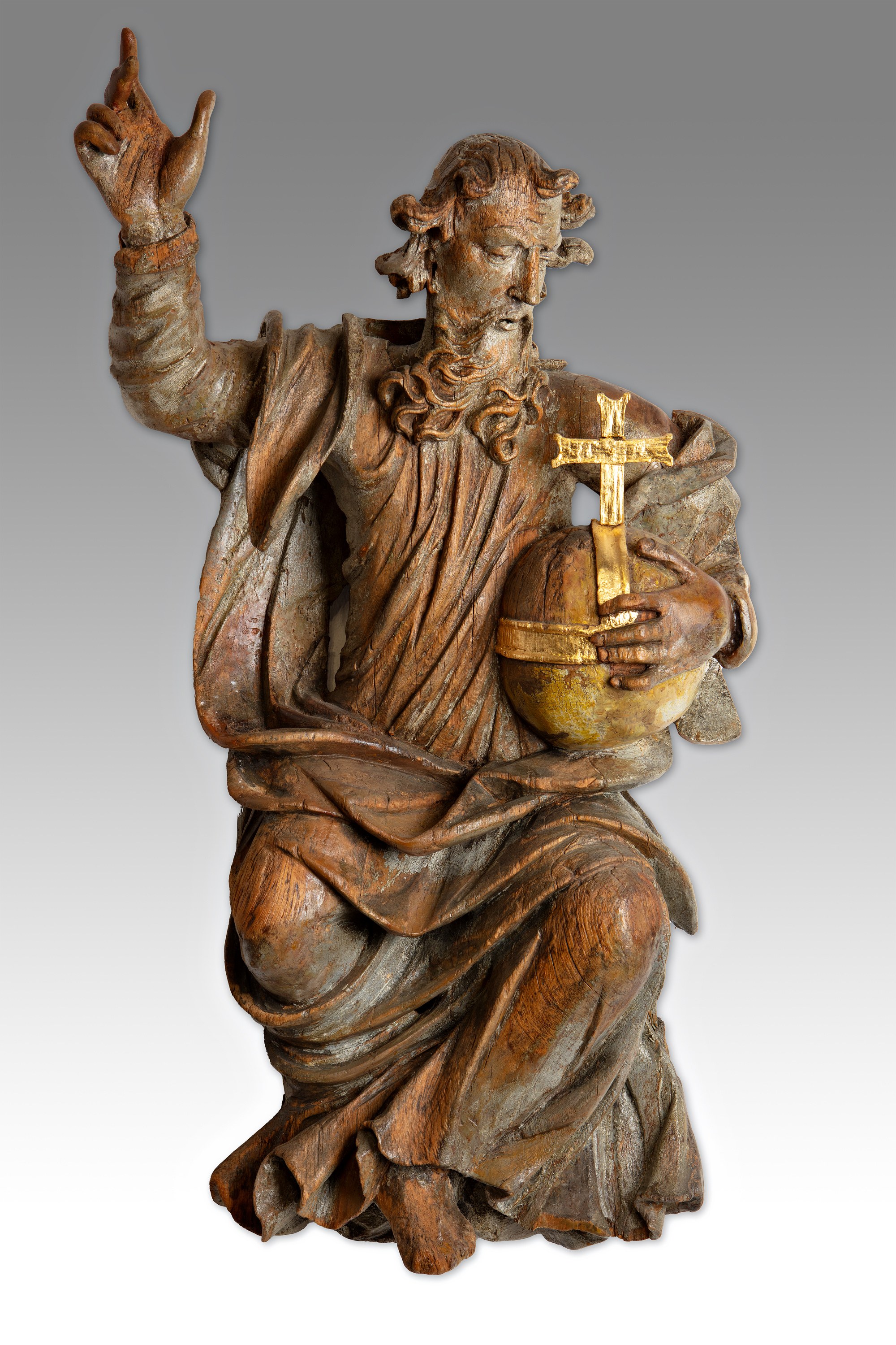 This baroque wooden statue represents God the Father and dates from the 18th century. The statue is a typical example of Baroque sacral art, which emphasizes drama, movement and emotional expression of the characters. The figure of God the Father is depicted with a majestic aura, holding a golden cross on a globe, symbolizing his rule over the world and his divine power. Baroque sculptures often emphasize dynamism and movement, which we can see in the gesture of God the Father - with one hand pointing upwards, which refers to the connection with heaven, while with the other hand he firmly holds the world. The dramatic fold of the robe and the details of the face underline the emotional charge of the entire composition.