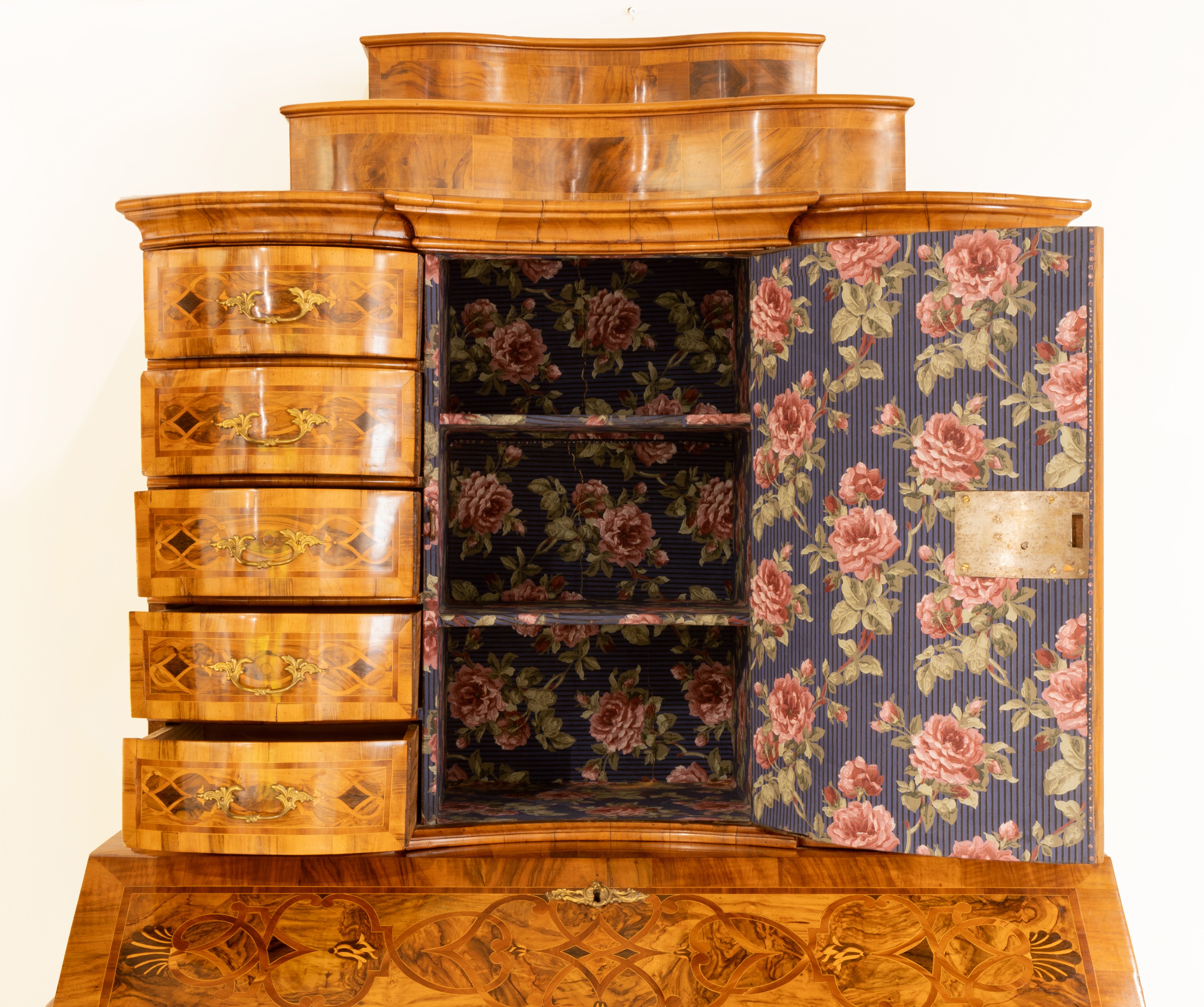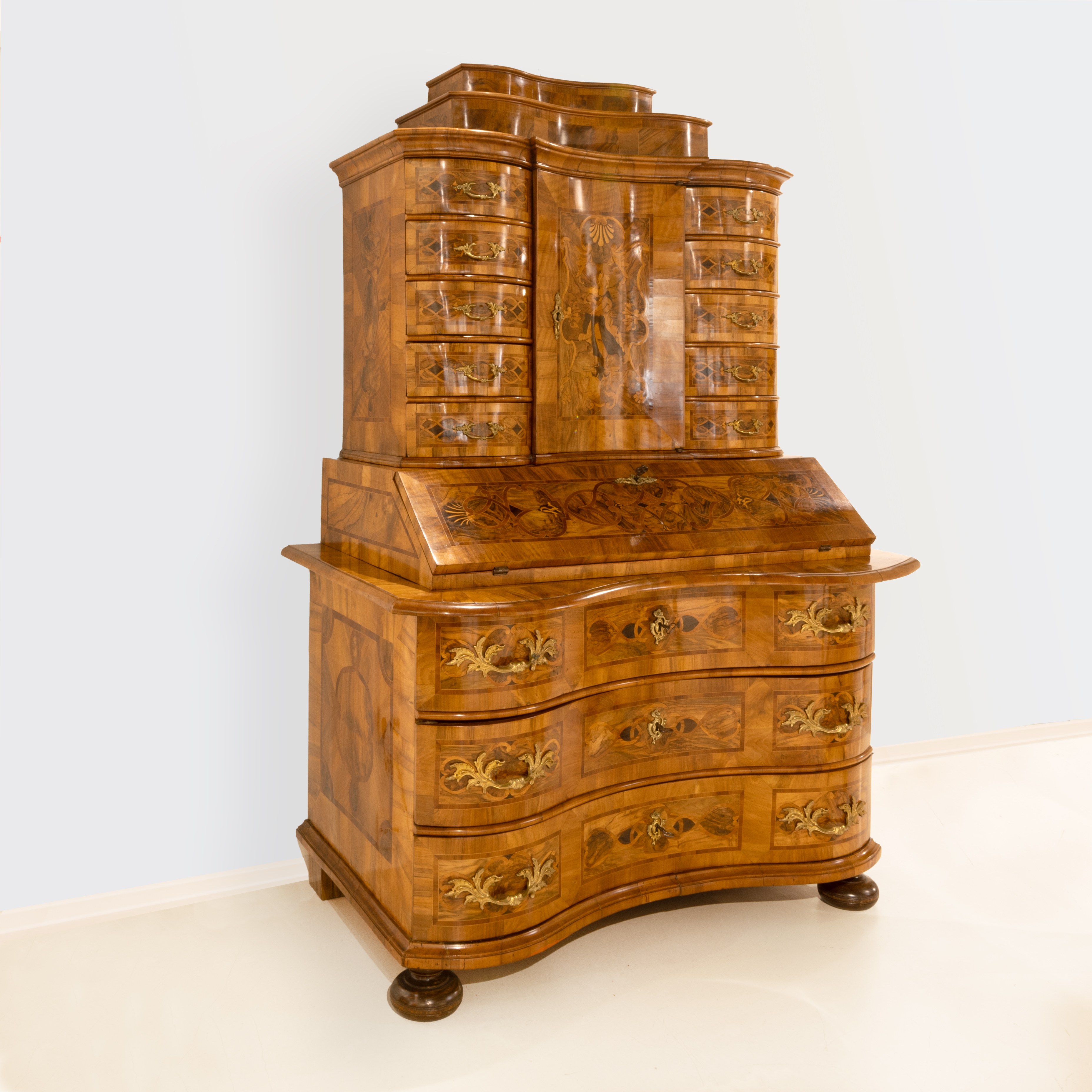 18th century, softwood, veneered with walnut and walnut burl, curved chest of drawers with three drawers, tabernacle top with lockable writing compartment with four drawers, partially lined with paper, leather writing surface, 10-tier recessed superstructure above, central door with inlay of a woman with flower basket and rocaille decoration, inside 3 compartments lined with paper, crowning, stepped cornice, pressed ball feet at the front, brass fittings, 198.5 x 132 x 80 cm, condition B/C, upper part subsequently added, restored, door warped, partial dry cracks, leather lining of recent date, brass fittings renewed