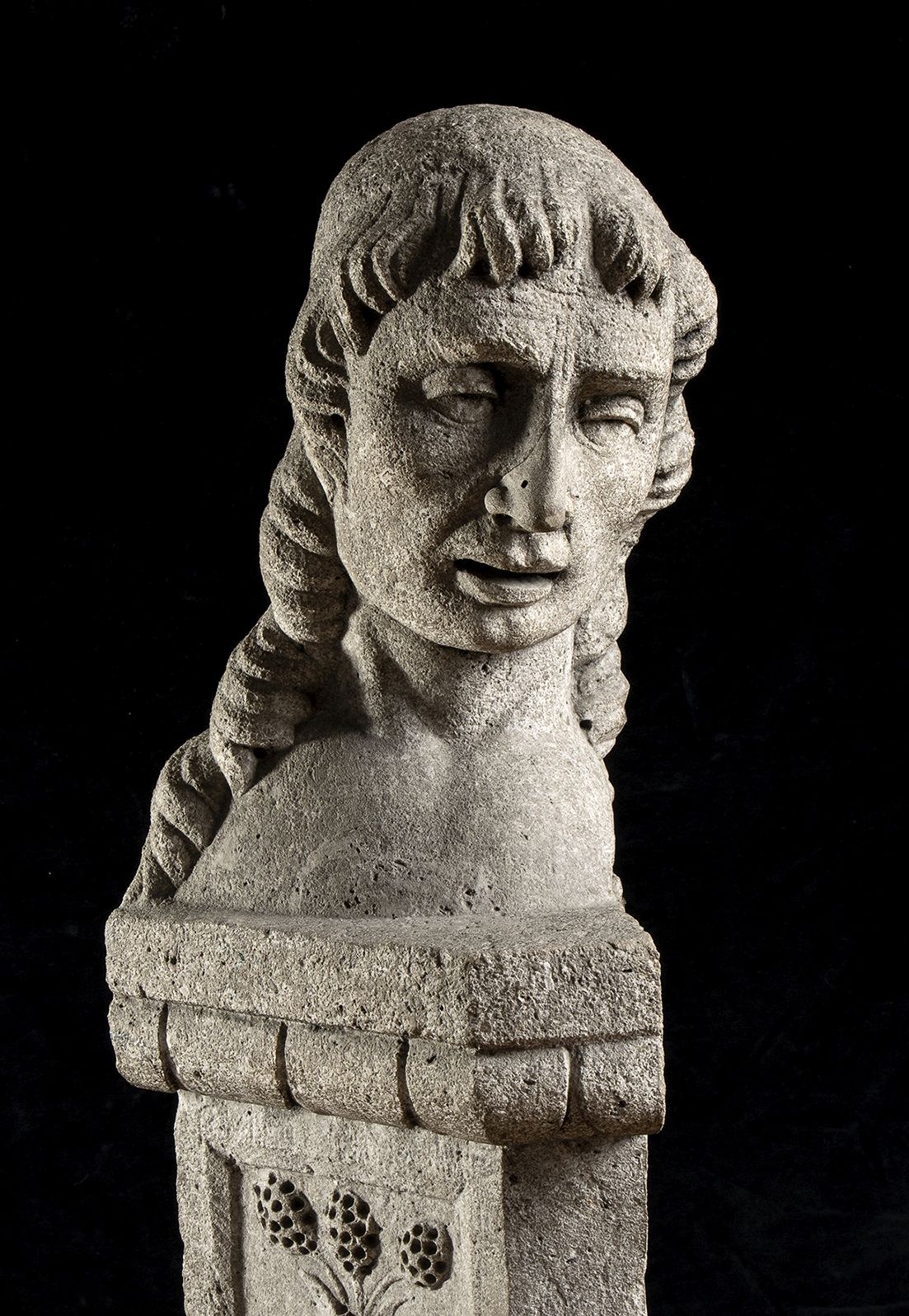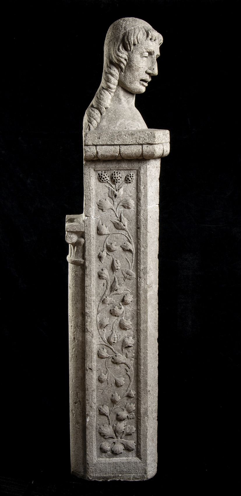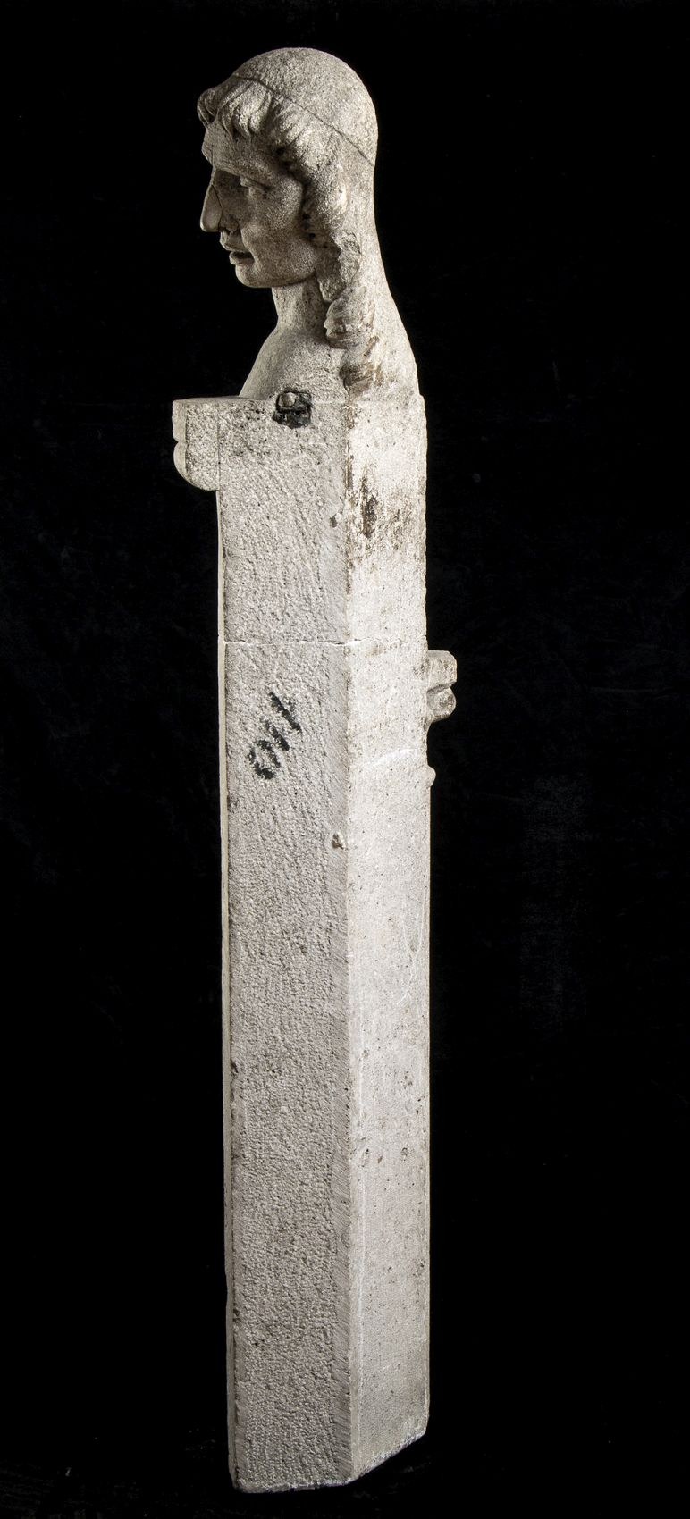 Marble Peperino Protome - Northern Italy, 16th - 17th century, Beardless male protome with elongated neck, hair in regularly arranged curls; standing on a column with foliate decoration. Height x width: 133 x 27 cm. Item condition grading: **** good.