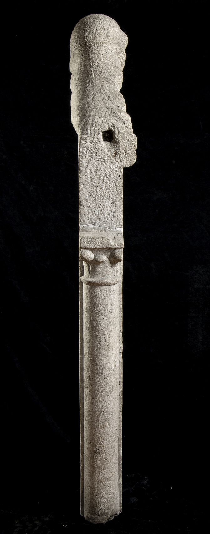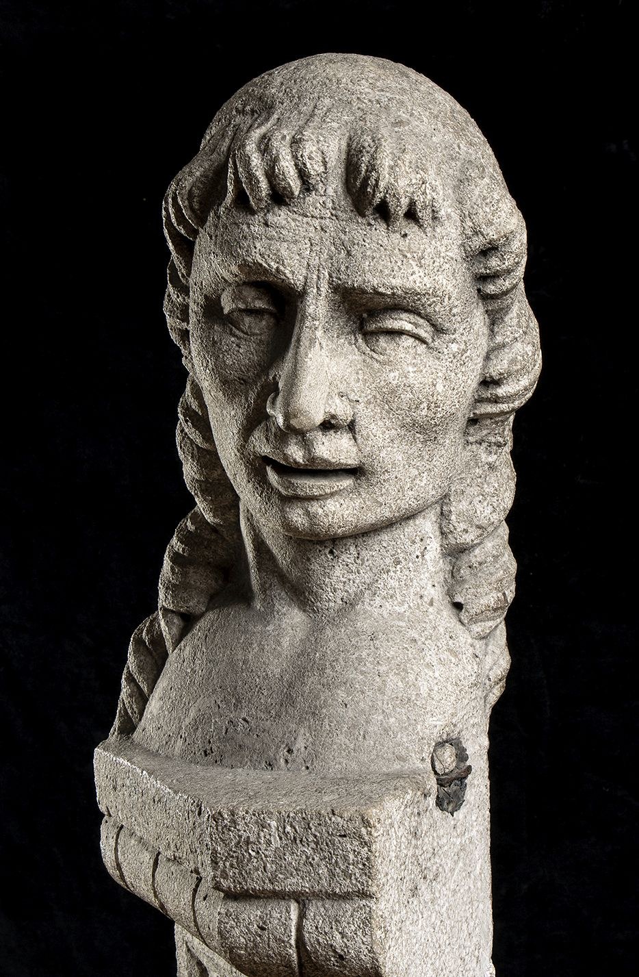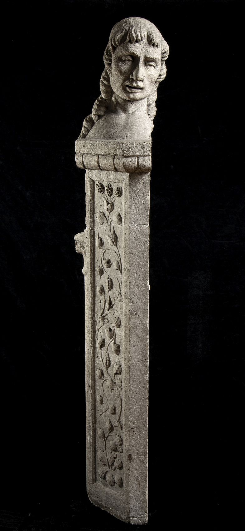 Marble Peperino Protome - Northern Italy, 16th - 17th century, Beardless male protome with elongated neck, hair in regularly arranged curls; standing on a column with foliate decoration. Height x width: 133 x 27 cm. Item condition grading: **** good.