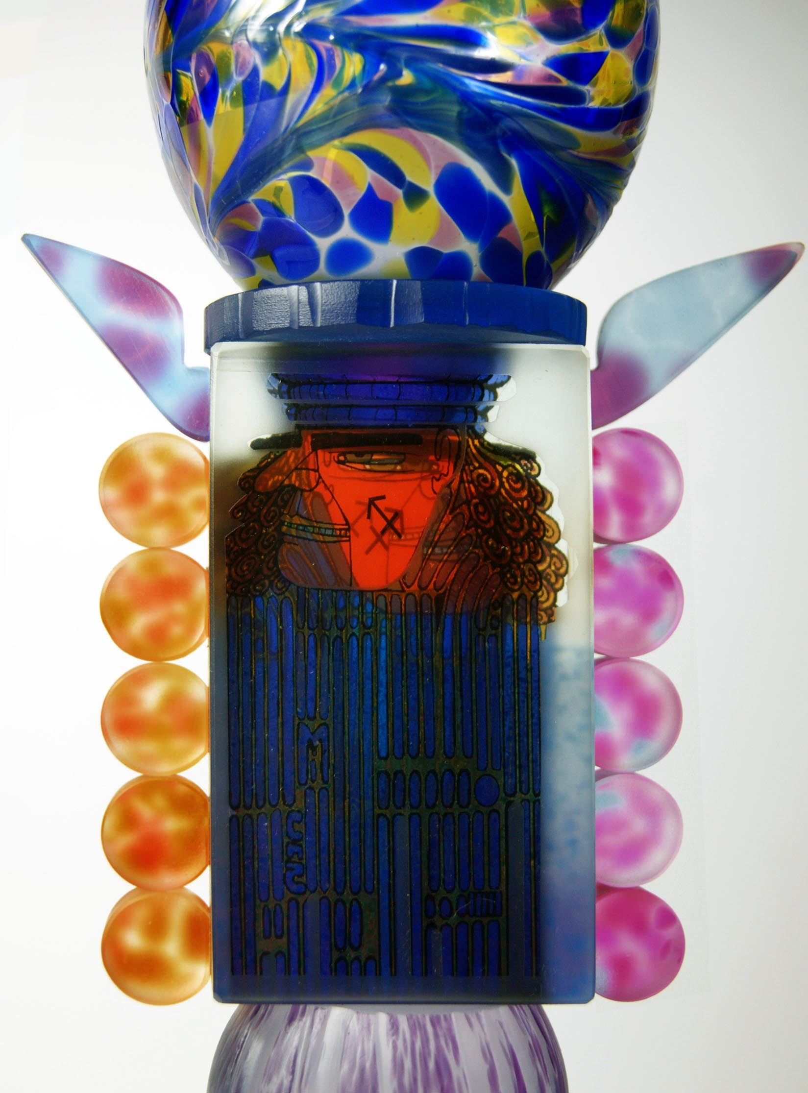 rzeźba szklana unikat (szkło sodowe dmuchane, szlifowane, cięte piłą diamentową, piaskowane), wykonanie z zastosowaniem techniki własnej (dotyczy to motywu graficznego zamkniętego w szkle), sygnowana,wymiary: wysokość 41 cm, średnica 15,5 cm, waga 2,6 kg