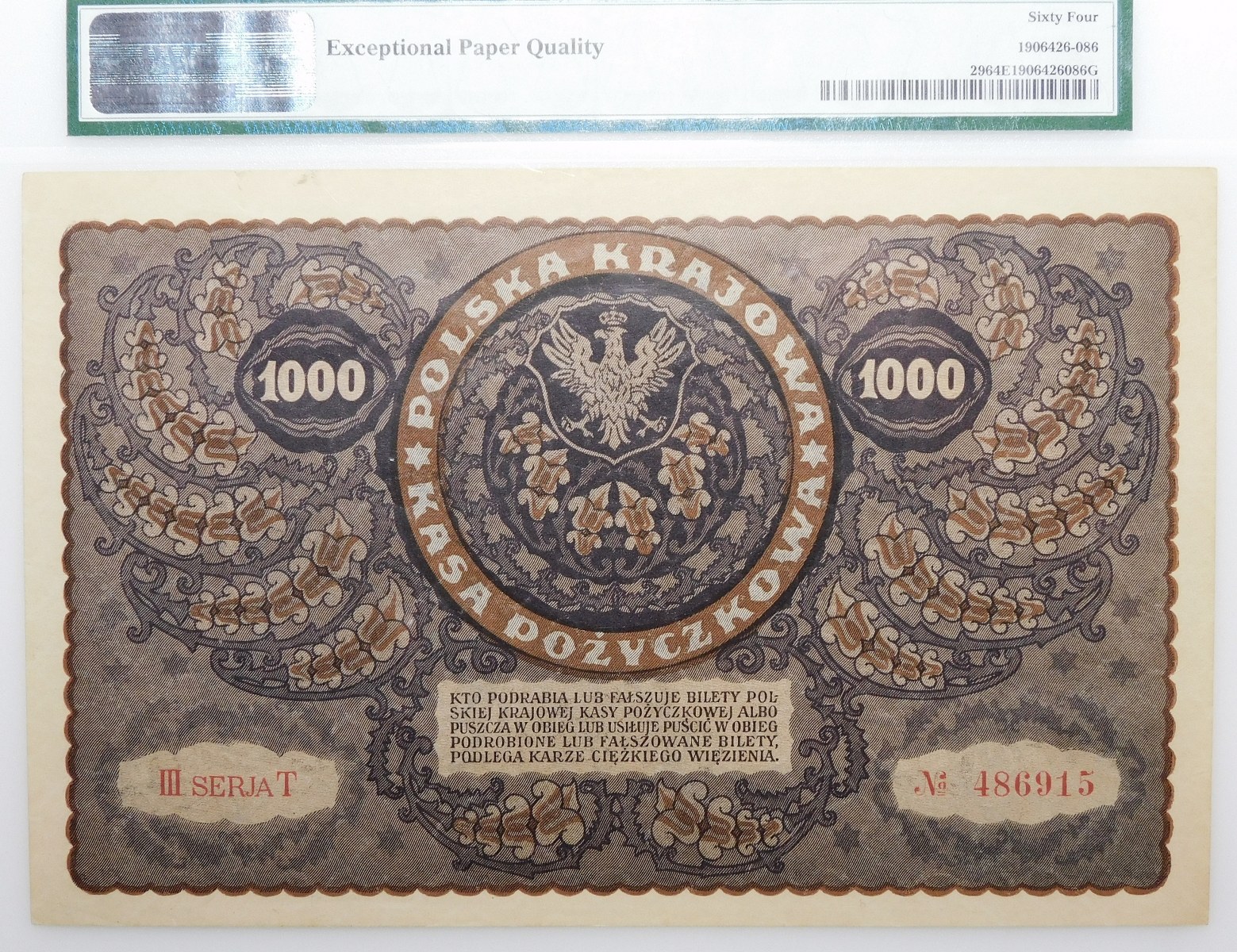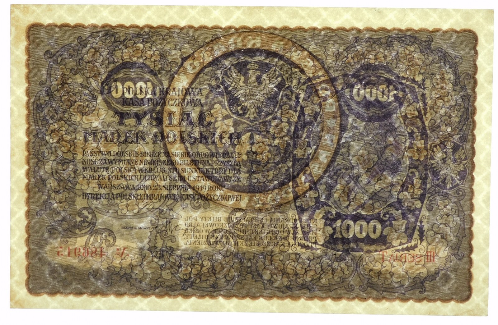 Banknot 1000 marek polskich 1919, serii : III Serja T , tzw. emisji wiedeńskiej (numeracja wąska).