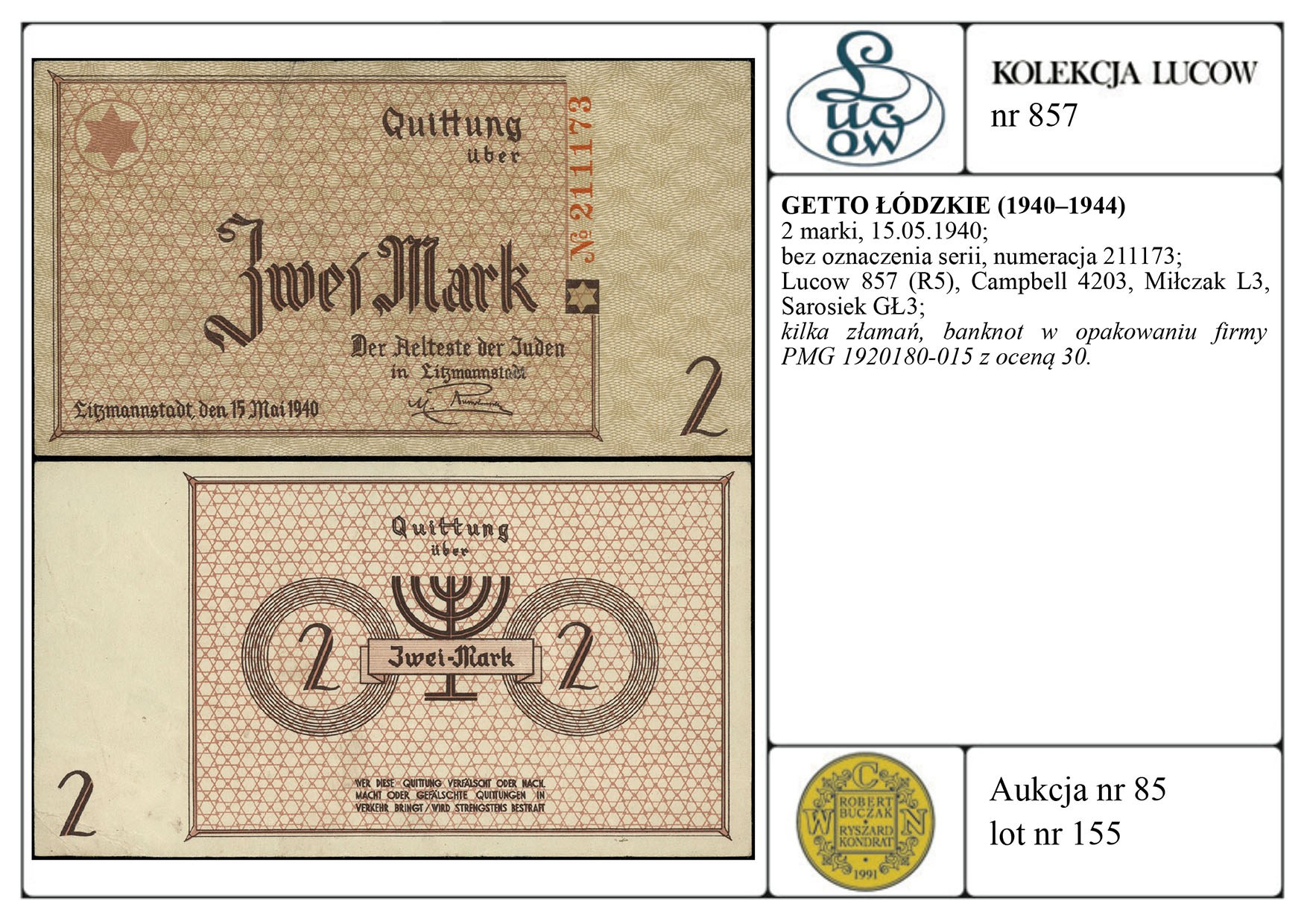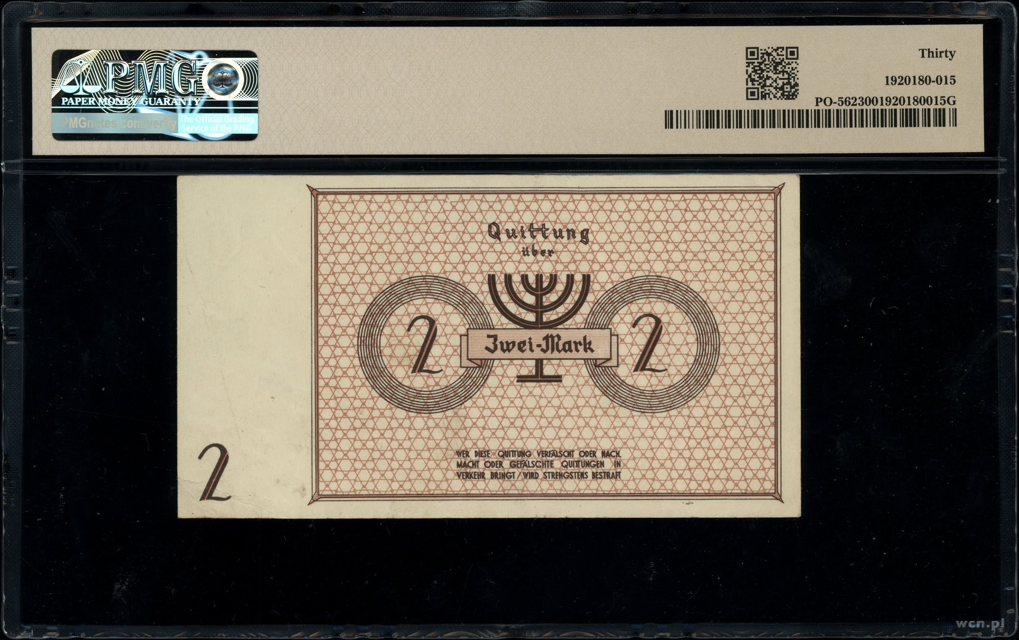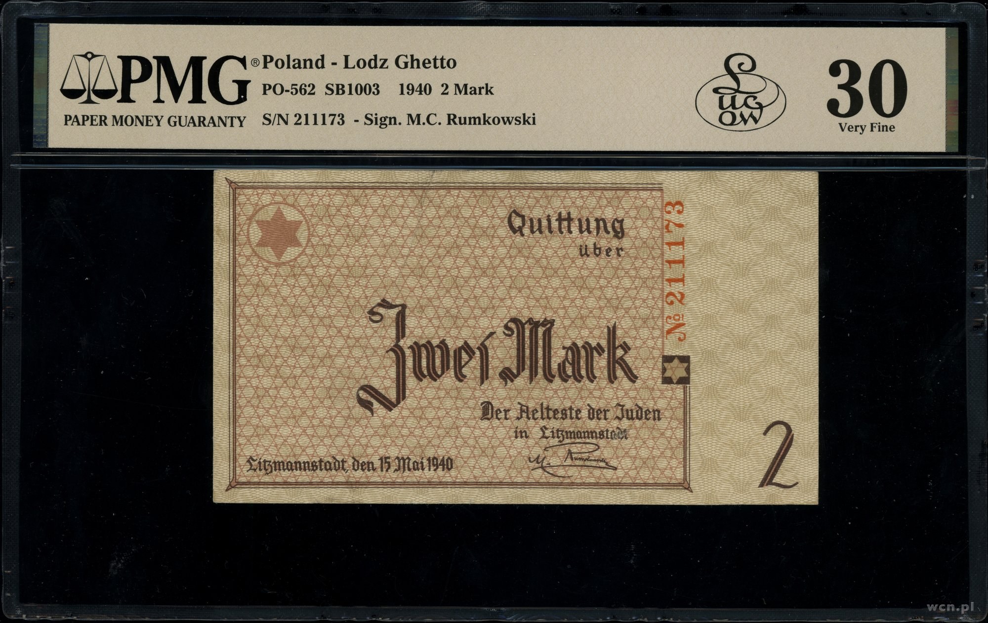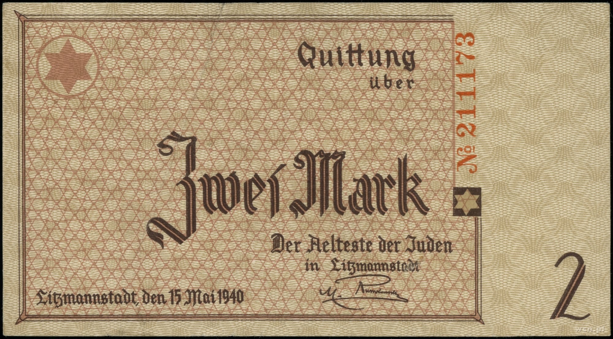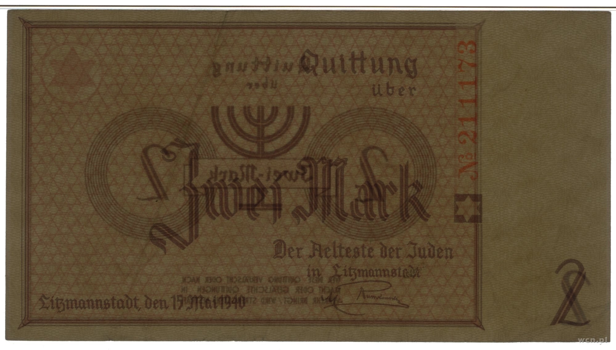Der aelteste der Juden in Litzmannstadt, 2 marki, 15.05.1940; bez oznaczenia serii, numeracja 211173; Lucow 857 (R5), Campbell 4203, Miłczak L3, Sarosiek GŁ3; kilka złamań, banknot w opakowaniu firmy PMG 1920180-015 z oceną 30.
