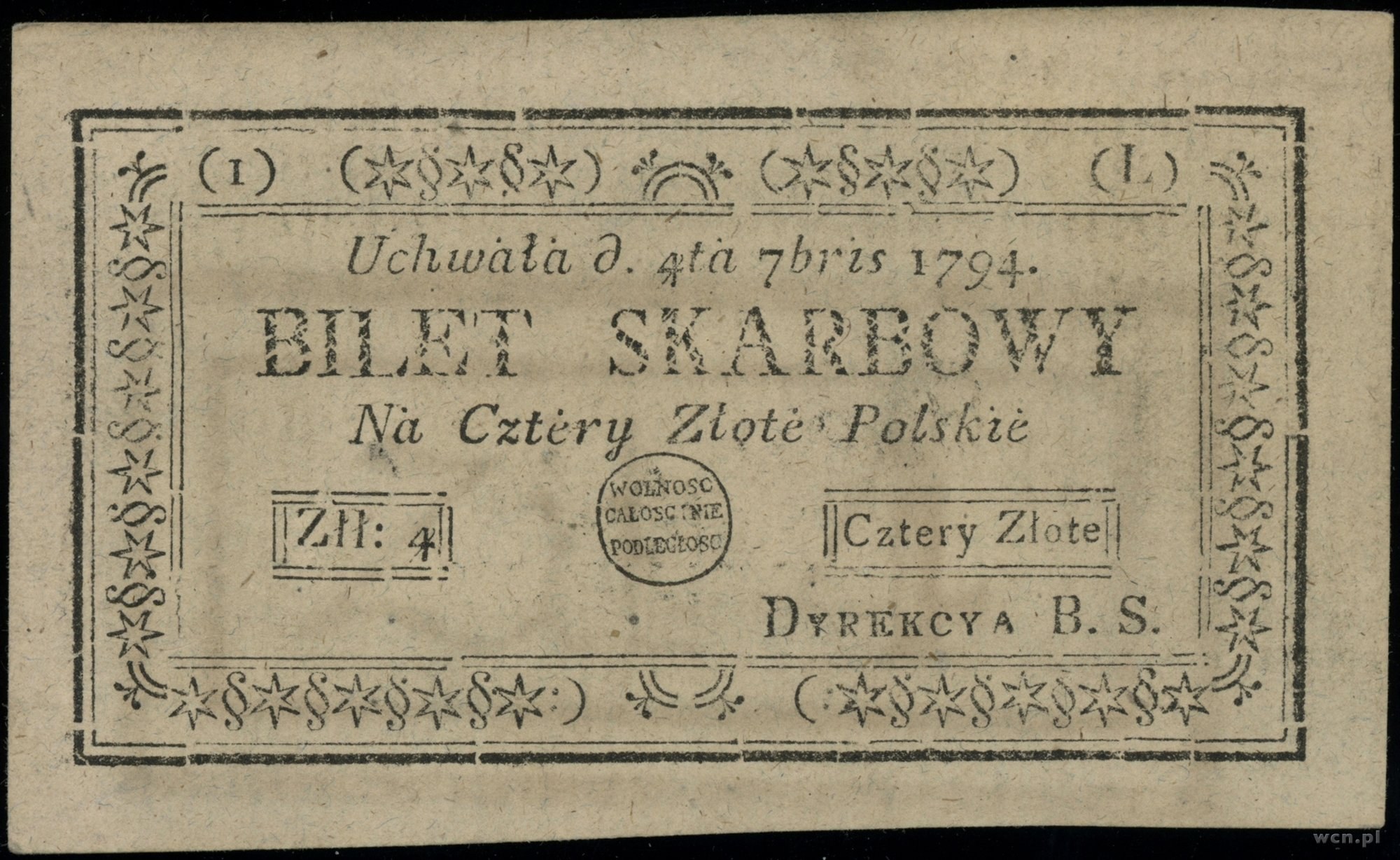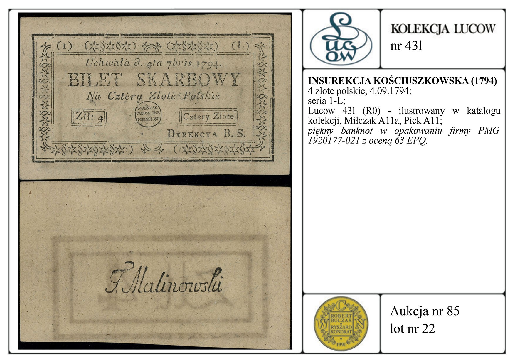INSUREKCJA KOŚCIUSZKOWSKA (1794), 4 złote polskie, 4.09.1794; seria 1-L; Lucow 43l (R0) - ilustrowany w katalogu kolekcji, Miłczak A11a, Pick A11; piękny banknot w opakowaniu firmy PMG 1920177-021 z oceną 63 EPQ.