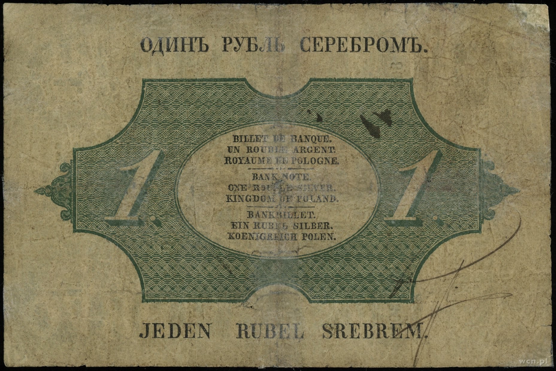 Zabór rosyjski 1831-1864, 1 rubel srebrem 1856, seria 136, numeracja 8023894, podpis dyrektora banku S. Englert, na stronie odwrotnej odręczny podpis; Lucow 171a (R5), Miłczak A43a; perforacje na załamaniach, lewy dolny róg uzupełniony po ubytku papieru, po ogólnej bardzo fachowej konserwacji, rzadki, szczególnie w tym stanie zachowania