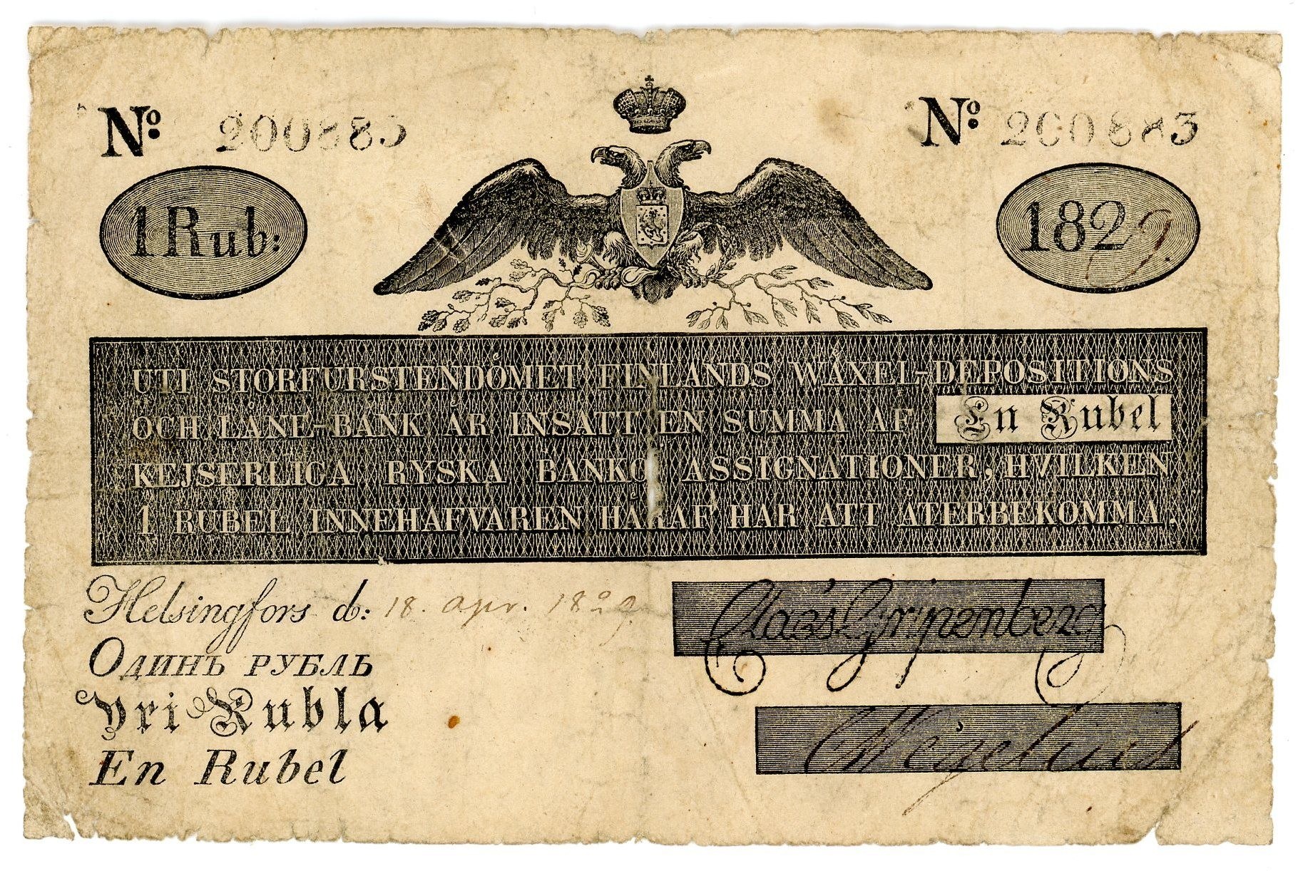 Finland Grand Duchy of Finland's Draft Deposit and Loan Bank 1 Rouble 1829