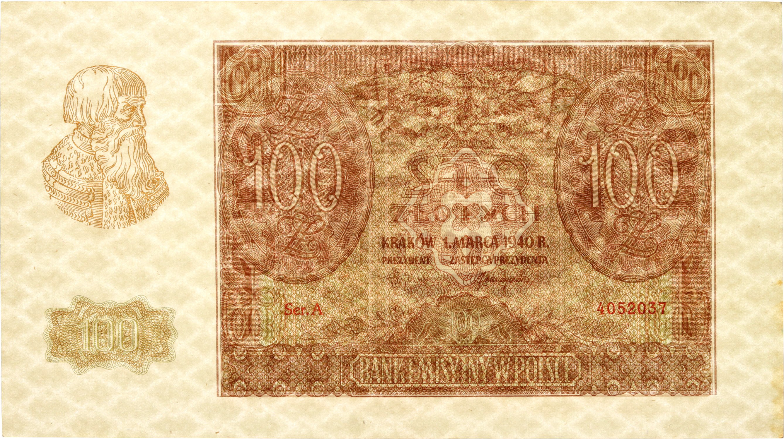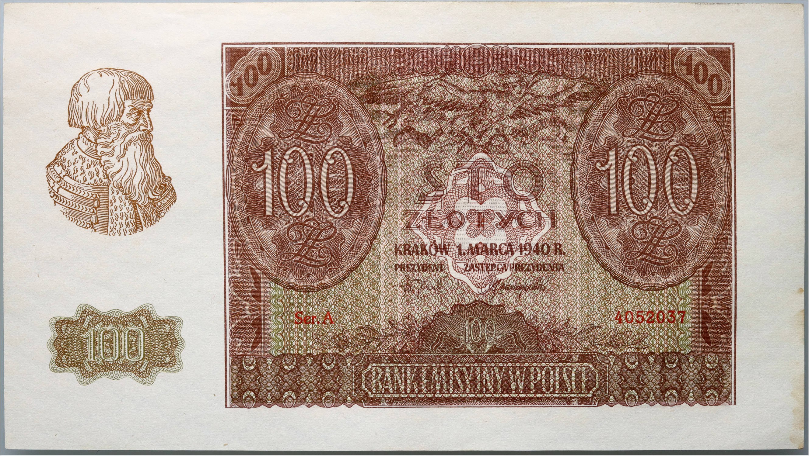 Numer 4052037. Centralne, pionowe, delikatne ugięcie. Minimalne złamania górnych narożników. Miejscowe zagniecenie przy górnym marginesie i delikatne zażółcenie przy prawej krawędzi. Ogólna prezencja bardzo dobra.