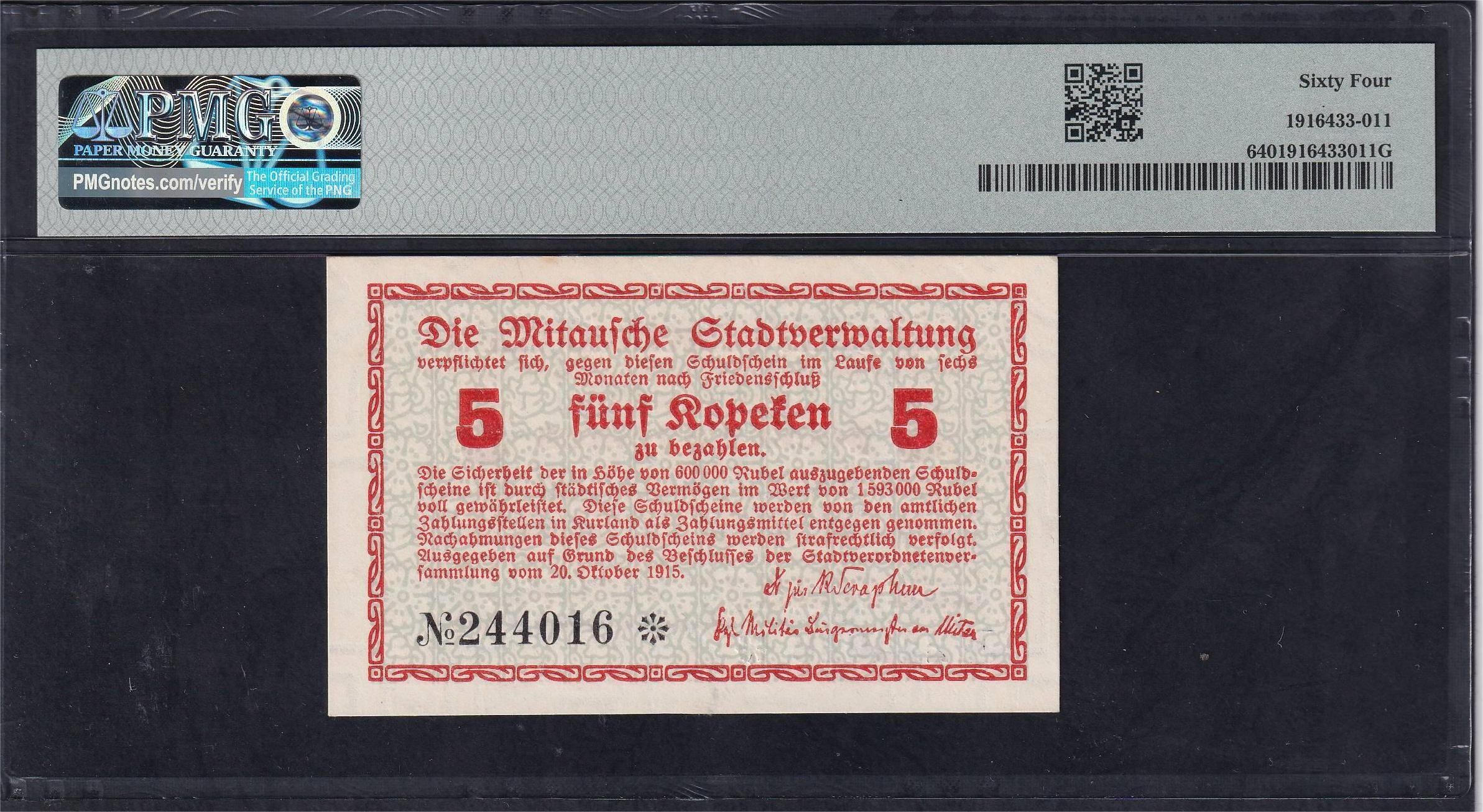 Latvia - Mitau, 5 Kapeikas, 1915, Choice UNC 64